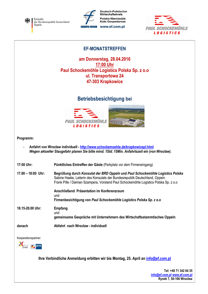 EF-MONATSTREFFEN am Donnerstag, 28.04.2016 17:00 Uhr Paul Schockemöhle Logistics Polska Sp. z o.o ul. Transportowa 24 47-303 Krapkowice Betriebsbesichtigung bei Programm: - Anfahrt von Wrocław individuell - http://www.schockemoehle.de/krapkowicepl.html Wegen aktueller Staugefahr planen Sie bitte mind. 1Std. 15Min. Anfahrtszeit ein (von Wrocław). 17:00 Uhr: Pünktliches Eintreffen der Gäste (Parkplatz vor dem Firmeneingang) 17.00 – 18:00 Uhr: Begrüßung durch Konsulat der BRD Oppeln und Paul Schockemöhle Logistics Polska Sabine Haake, Leiterin des Konsulats der Bundesrepublik Deutschland, Oppeln Frank Pille / Damian Szampera, Vorstand Paul Schockemöhle Logistics Polska Sp. z o.o Anschließend Präsentation im Konferenzraum und Firmenbesichtigung von Paul Schockemöhle Logistics Polska Sp. z o.o 18.15-20.00 Uhr: Empfang und gemeinsame Gespräche mit Unternehmern des Wirtschaftsstammtisches Oppeln danach Abfahrt nach Wrocław - individuell Kooperationspartner: Ihre Verbindliche Anmeldung erbitten wir bis Montag, 25. April an [email protected] Tel: +48 71 342 04 35 [email protected] www.ef.com.pl Rynek 7, 50-106 Wrocław SPOTKANIE EUROPA FORUM w czwartek, 28.04.2016 godz. 17:00 Paul Schockemöhle Logistics Polska Sp. z o.o ul. Transportowa 24 47-303 Krapkowice Zwiedzanie zakładu Program: - Dojazd we własnym zakresie - http://www.schockemoehle.de/krapkowicepl.html Prosimy uwzględnić korki na tej trasie – dojazd z Wrocławia co najmniej 1godz. 15min. godz. 17:00 Punktualne przybycie Gości (parking przed siedzibą firmy) godz. 17:00-18:00 Powitanie przez Konsulat RFN w Opolu i Paul Schockemöhle Logistics Polska Sp. z o.o Sabine Haake, Konsul w Konsulacie RFN w Opolu Frank Pille / Damian Szampera, Zarząd Paul Schockemöhle Logistics Polska Sp. z o.o Prezentacja firmy w sali konferencyjnej oraz zwiedzanie zakładu Paul Schockemöhle Logistics Polska Sp. z o.o. godz. 18.15-20.00 Poczęstunek oraz rozmowy kuluarowe z gośćmi z ramienia ‘Wirtschaftsstammtisch’ Opole po Powrót do Wrocławia Partner spotkania: O wiążące zgłoszenia prosimy do poniedziałku, 25 kwietnia br. na adres [email protected] Tel: +48 71 342 04 35 [email protected] www.ef.com.pl Rynek 7, 50-106 Wrocław
