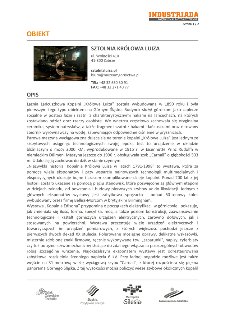 Strona 1 / 2 OBIEKT SZTOLNIA KRÓLOWA LUIZA ul. Wolności 410 41-800 Zabrze sztolnialuiza.pl [email protected] TEL: +48 32 630 30 91 FAX: +48 32 271 40 77 OPIS Łaźnia Łańcuszkowa Kopalni „Królowa Luiza” została wybudowana w 1890 roku i była pierwszym tego typu obiektem na Górnym Śląsku. Budynek służył górnikom jako zaplecze socjalne w postaci łaźni i szatni z charakterystycznymi hakami na łańcuchach, na których zostawiano odzież oraz rzeczy osobiste. We wnętrzu częściowo zachowała się oryginalna ceramika, system natrysków, a także fragment szatni z hakami i łańcuszkami oraz nitowany zbiornik wyrównawczy na wodę, zapewniający odpowiednie ciśnienie w prysznicach. Parowa maszyna wyciągowa znajdująca się na terenie kopalni „Królowa Luiza” jest jednym ze szczytowych osiągnięć technologicznych swojej epoki. Jest to urządzenie w układzie bliźniaczym o mocy 2000 KM, wyprodukowane w 1915 r. w Eisenhütte Prinz Rudolfh w niemieckim Dülmen. Maszyna jeszcze do 1990 r. obsługiwała szyb „Carnall” o głębokości 503 m. Udało się ją zachować do dziś w stanie czynnym. „Niezwykła historia. Kopalnia Królowa Luiza w latach 1791-1998" to wystawa, która za pomocą wielu eksponatów i przy wsparciu najnowszych technologii multimedialnych i ekspozycyjnych ukazuje bujne i czasem skomplikowane dzieje kopalni. Ponad 200 lat z jej historii zostało ukazane za pomocą pięciu stanowisk, które poświęcone są głównym etapom w dziejach zakładu, od powstania i budowy pierwszych szybów aż do likwidacji. Jednym z głównych eksponatów wystawy jest zabytkowa sprężarka - ponad 60-tonowy kolos wybudowany przez firmę Belliss-Morcom w brytyjskim Birmingham. Wystawa „Kopalnia Edisona” przypomina o początkach elektryfikacji w górnictwie i pokazuje, jak zmieniała się ilość, forma, specyfika, moc, a także poziom konstrukcji, zaawansowanie technologiczne i kształt górniczych urządzeń elektrycznych, zarówno dołowych, jak i stosowanych na powierzchni. Wystawa prezentuje wiele urządzeń elektrycznych i towarzyszących im urządzeń pomiarowych, z których większość pochodzi jeszcze z pierwszych dwóch dekad XX stulecia. Polerowane mosiężne oprawy, delikatne wskazówki, misternie zdobione znaki firmowe, ręcznie wykonywane tzw. „szparunki", napisy, cyferblaty czy też potężne serwomechanizmy służące do zdalnego włączania poszczególnych obwodów robią szczególne wrażenie. Najokazalszym eksponatem wystawy jest odrestaurowana zabytkowa rozdzielnia średniego napięcia 6 kV. Przy ładnej pogodzie możliwe jest także wejście na 31-metrową wieżę wyciągową szybu "Carnall", z której rozpościera się piękna panorama Górnego Śląska. Z tej wysokości można policzyć wieże szybowe okolicznych kopalń Strona 2 / 2 - mimo upływu czasu na Śląsku ciągle funkcjonują czynne zakłady górnicze. Zwiedzając nadszybie można prześledzić drogę węgla wydobywanego na powierzchnię za pomocą szoli i wózków na urobek. Kronika Szlakowa Założona w 1791 roku kopalnia „Królowa Luiza” to jedna z najstarszych i największych górnośląskich kopalni węgla kamiennego. Była jedną z dwóch pierwszych na Śląsku kopalni państwowych, a jej początki sięgają ostatniej dekady XVIII wieku, kiedy działający na polecenie Fryderyka von Redena radca górniczy Salomon Isaac z Brabantu odkrył nieopodal wsi Pawłów i Zaborze wychodnie pokładów węgla. Dały one początek fiskalnej kopalni, która od 1811 roku zyskała nazwę „Królowa Luiza" na cześć zmarłej wcześniej małżonki pruskiego monarchy. Zabrzańska kopalnia od samego początku była niezwykła. Jako kopalnia państwowa mogła bowiem liczyć na wiele przywilejów, takich jak bardzo duże pole górnicze, specjalne zwolnienia z opłat czy dostęp do najlepszych fachowców i najnowszych urządzeń. To właśnie w „Królowej Luizie" zamontowano bowiem w 1795 roku jedną z pierwszych w górnictwie węglowym maszyn parowych. Również tutaj po raz pierwszy wprowadzono wodny transport urobku korzystając ze spławnej Głównej Kluczowej Sztolni Dziedzicznej. Jej niemal nieprzerwany rozwój trwał przez cały XIX wiek, a kopalnia stała się jedną z największych i najnowocześniejszych kopalń w Europie, dając tym samym impuls do rozwoju całego Zabrza. Można o niej mówić także jak o „matce innych kopalń", ponieważ sąsiednie zakłady – Bielszowice i Makoszowy – powstały pierwotnie jako szyby wydobywcze kopalni „Królowa Luiza". Pomimo podziału pod koniec lat 20. XX wieku na dwie oddzielne kopalnie -„Królowa Luiza Zachód" i „Królowa Luiza Wschód" – jej rozwój trwał nadal, aż do lat 50.XX kiedy na Polu Zachód zaczęły wyczerpywać się pokłady węgla. Kryzys lata 80. i następnie restrukturyzacja sprawiły, że również drugie pole wydobywcze – Pole Poremba – zostało zlikwidowane. Ostatnia tona węgla wyjechała tu pod koniec marca 1998 roku, zamykając ponad dwuwiekową historię tego zakładu. PROGRAM 13.06.2015 09:00 - 21:00 09:00 - 21:00 09:00 - 21:00 09:00 - 21:00 09:00 - 21:00 14:00 - 20:00 22:00 - 00:30 22:15 - 22:30 00:00 - 00:15 100 lat w parze - pokaz pracy maszyny parowej Niezwykła historia – wystawa poświęcona dziejom kopalni Królowa Luiza Porażające dzieło sztuki – wystawa Kopalnia Edisona Luiza, królowa jak malowana – wystawy Industrialne szybowanie – wejście na szyb Carnall i zwiedzanie nadszybia Zbudowane z węgla - warsztaty naukowe HIT! MIUOSH & NOSPR & JIMEK - koncert Parkour party HIT! Laser Show