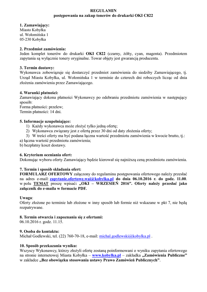 REGULAMIN postępowania na zakup tonerów do drukarki OKI C822 1. Zamawiający: Miasto Kobyłka ul. Wołomińska 1 05-230 Kobyłka 2. Przedmiot zamówienia: Jeden komplet tonerów do drukarki OKI C822 (czarny, żółty, cyan, magenta). Przedmiotem zapytania są wyłącznie tonery oryginalne. Towar objęty jest gwarancją producenta. 3. Termin dostawy: Wykonawca zobowiązuje się dostarczyć przedmiot zamówienia do siedziby Zamawiającego, tj. Urząd Miasta Kobyłka, ul. Wołomińska 1 w terminie do czterech dni roboczych licząc od dnia złożenia zamówienia przez Zamawiającego. 4. Warunki płatności: Zamawiający dokona płatności Wykonawcy po odebraniu przedmiotu zamówienia w następujący sposób: Forma płatności: przelew; Termin płatności: 14 dni. 5. Informacje uzupełniające: 1) Każdy wykonawca może złożyć tylko jedną ofertę; 2) Wykonawca związany jest z ofertą przez 30 dni od daty złożenia oferty; 3) W treści oferty ma być podana łączna wartość przedmiotu zamówienia w kwocie brutto, tj.: a) łączna wartość przedmiotu zamówienia; b) bezpłatny koszt dostawy. 6. Kryterium oceniania ofert: Dokonując wyboru oferty Zamawiający będzie kierował się najniższą ceną przedmiotu zamówienia. 7. Termin i sposób składania ofert: FORMULARZ OFERTOWY załączony do regulaminu postępowania ofertowego należy przesłać na adres e-mail: [email protected] do dnia 06.10.2016 r. do godz. 11.00. w polu TEMAT proszę wpisać: „OKI – WRZESIEŃ 2016”. Oferty należy przesłać jako załącznik do e-maila w formacie PDF. Uwaga: Oferty złożone po terminie lub złożone w inny sposób lub formie niż wskazane w pkt 7, nie będą rozpatrywane. 8. Termin otwarcia i zapoznania się z ofertami: 06.10.2016 r. godz. 11.15. 9. Osoba do kontaktu: Michał Godlewski, tel. (22) 760-70-18, e-mail: [email protected] . 10. Sposób przekazania wyniku: Wszyscy Wykonawcy, którzy złożyli ofertę zostaną poinformowani o wyniku zapytania ofertowego na stronie internetowej Miasta Kobyłka – www.kobylka.pl – zakładka „Zamówienia Publiczne” w zakładce „Bez obowiązku stosowania ustawy Prawo Zamówień Publicznych”. 11. Zamawiający zastrzega sobie prawo do unieważnienia postępowania bez podania przyczyny.