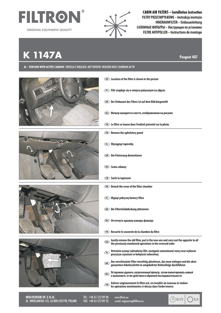 CABIN AIR FILTERS – Installation instruction FILTRY PRZECIWPYŁKOWE – Instrukcja montażu INNERAUMFILTER – Einbauanleitung САЛОННЫЕ ФИЛЬТРЫ – Инструкция по установке FILTRE ANTIPOLLEN – Instructions de montage K 1147A Peugeot 407 A – VERSION WITH ACTIVE CARBON / WERSJA Z WĘGLEM AKTYWNYM/ VERSION AVEC CHARBON ACTIF Location of the filter is shown in the picture PL Filtr znajduje się w miejscu pokazanym na zdjęciu Der Einbauort des Filters ist auf dem Bild dargestellt Фильтр находится в месте, изображенном на рисунке Le filtre se trouve dans l’endroit présenté sur la photo Remove the upholstery panel PL Wyciągnąć tapicerkę Die Polsterung demontieren Снять обивку Sortir la tapisserie Detach the cover of the filter chamber PL Wypiąć pokrywę komory filtra Die Filterteilabdeckung abtrennen Отстегнуть крышку камеры фильтра Ressortir le couvercle de la chambre du filtre remove the old filter, put in the new one and carry out the opposite to all Gently the previously mentioned operations in the reversed order PL Ostrożnie usunąć zabrudzony filtr, następnie zamontować nowy oraz wykonać powyższe czynności w kolejności odwrotnej Das verschmutzte Filter vorsichtig abnehmen, das neue einlegen und die oben genannten Arbeitsschritte in umgekehrter Reihenfolge durchführen удалить загрязненный фильтр, затем вмонтировать новый Осторожно и выполнить те же действия в обратной последовательности Enlever soigneusement le filtre usé, en installer un nouveau et réaliser les opérations mentionnées ci-dessus dans l’ordre inverse WIX-FILTRON SP. Z O.O. UL. WROCŁAWSKA 145, 63-800 GOSTYŃ, POLAND TEL.:+48 65 572 89 00 FAX: +48 65 572 89 22 www.filtron.eu e-mail: [email protected] 0:15 5,5