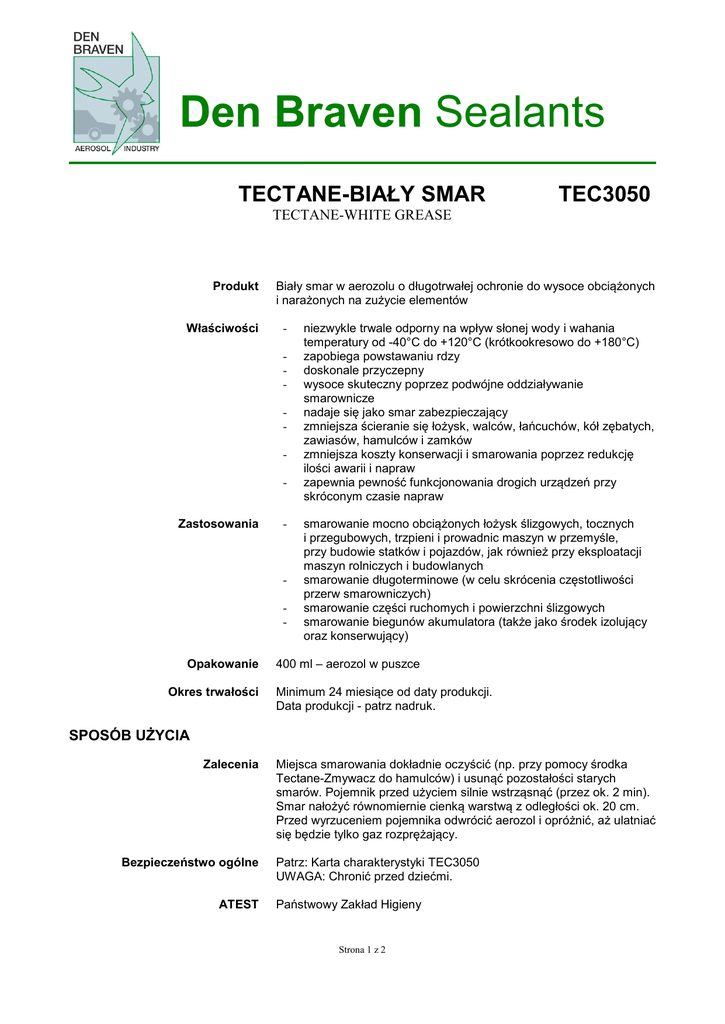 Den Braven Sealants TECTANE-BIAŁY SMAR TEC3050 TECTANE-WHITE GREASE Produkt Właściwości Biały smar w aerozolu o długotrwałej ochronie do wysoce obciążonych i narażonych na zużycie elementów - Zastosowania - - Opakowanie Okres trwałości niezwykle trwale odporny na wpływ słonej wody i wahania temperatury od -40°C do +120°C (krótkookresowo do +180°C) zapobiega powstawaniu rdzy doskonale przyczepny wysoce skuteczny poprzez podwójne oddziaływanie smarownicze nadaje się jako smar zabezpieczający zmniejsza ścieranie się łożysk, walców, łańcuchów, kół zębatych, zawiasów, hamulców i zamków zmniejsza koszty konserwacji i smarowania poprzez redukcję ilości awarii i napraw zapewnia pewność funkcjonowania drogich urządzeń przy skróconym czasie napraw smarowanie mocno obciążonych łożysk ślizgowych, tocznych i przegubowych, trzpieni i prowadnic maszyn w przemyśle, przy budowie statków i pojazdów, jak również przy eksploatacji maszyn rolniczych i budowlanych smarowanie długoterminowe (w celu skrócenia częstotliwości przerw smarowniczych) smarowanie części ruchomych i powierzchni ślizgowych smarowanie biegunów akumulatora (także jako środek izolujący oraz konserwujący) 400 ml – aerozol w puszce Minimum 24 miesiące od daty produkcji. Data produkcji - patrz nadruk. SPOSÓB UŻYCIA Zalecenia Bezpieczeństwo ogólne ATEST Miejsca smarowania dokładnie oczyścić (np. przy pomocy środka Tectane-Zmywacz do hamulców) i usunąć pozostałości starych smarów. Pojemnik przed użyciem silnie wstrząsnąć (przez ok. 2 min). Smar nałożyć równomiernie cienką warstwą z odległości ok. 20 cm. Przed wyrzuceniem pojemnika odwrócić aerozol i opróżnić, aż ulatniać się będzie tylko gaz rozprężający. Patrz: Karta charakterystyki TEC3050 UWAGA: Chronić przed dziećmi. Państwowy Zakład Higieny Strona 1 z 2 TECTANE BIAŁY SMAR, TEC3050 Odpowiedzialność: Podane informacje są wynikiem badań i doświadczeń Den Braven Sealants, co jest podstawą ich rzetelności i wiarygodności. Producent nie mógł przewidzieć jednak wszystkich możliwości zastosowania swoich produktów, a ponieważ sposób użycia produktów jest całkowicie poza jego kontrolą, użytkownik bierze na siebie odpowiedzialność za właściwy wybór i zastosowanie produktu. Producent nie bierze na siebie odpowiedzialności za występujące uszkodzenia lub zły stan podłoża, które mogą być wynikiem czynników atmosferycznych, przygotowania wstępnego lub wad konstrukcyjnych. 4/08/2011 Strona 2 z 2