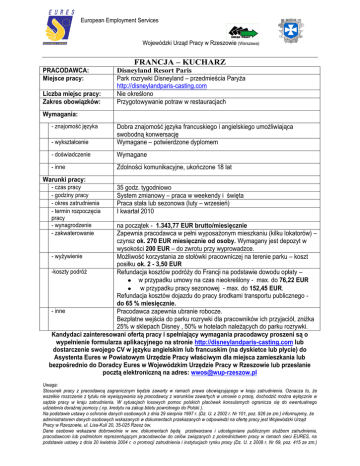 European Employment Services Wojewódzki Urząd Pracy w Rzeszowie (Warszawa) FRANCJA – KUCHARZ PRACODAWCA: Miejsce pracy: Liczba miejsc pracy: Zakres obowiązków: Disneyland Resort Paris Park rozrywki Disneyland – przedmieścia Paryża http://disneylandparis-casting.com Nie określono Przygotowywanie potraw w restauracjach Wymagania: - wykształcenie Dobra znajomość języka francuskiego i angielskiego umożliwiająca swobodną konwersację Wymagane – potwierdzone dyplomem - doświadczenie Wymagane - inne Zdolności komunikacyjne, ukończone 18 lat - znajomość języka Warunki pracy: - czas pracy - godziny pracy - okres zatrudnienia - termin rozpoczęcia pracy - wynagrodzenie - zakwaterowanie 35 godz. tygodniowo System zmianowy – praca w weekendy i święta Praca stała lub sezonowa (luty – wrzesień) I kwartał 2010 na początek - 1.343,77 EUR brutto/miesięcznie Zapewnia pracodawca w pełni wyposażonym mieszkaniu (kilku lokatorów) – czynsz ok. 270 EUR miesięcznie od osoby. Wymagany jest depozyt w wysokości 200 EUR – do zwrotu przy wyprowadzce. - wyżywienie Możliwość korzystania ze stołówki pracowniczej na terenie parku – koszt posiłku ok. 2 - 3,50 EUR -koszty podróż Refundacja kosztów podróży do Francji na podstawie dowodu opłaty – w przypadku umowy na czas nieokreślony - max. do 76,22 EUR w przypadku pracy sezonowej - max. do 152,45 EUR. Refundacja kosztów dojazdu do pracy środkami transportu publicznego do 65 % miesięcznie. - inne Pracodawca zapewnia ubranie robocze. Bezpłatne wejścia do parku rozrywki dla pracowników ich przyjaciół, zniżka 25% w sklepach Disney , 50% w hotelach należących do parku rozrywki. Kandydaci zainteresowani ofertą pracy i spełniający wymagania pracodawcy proszeni są o wypełnienie formularza aplikacyjnego na stronie http://disneylandparis-casting.com lub dostarczenie swojego CV w języku angielskim lub francuskim (na dyskietce lub płycie) do Asystenta Eures w Powiatowym Urzędzie Pracy właściwym dla miejsca zamieszkania lub bezpośrednio do Doradcy Eures w Wojewódzkim Urzędzie Pracy w Rzeszowie lub przesłanie pocztą elektroniczną na adres: [email protected] Uwaga: Stosunek pracy z pracodawcą zagranicznym będzie zawarty w ramach prawa obowiązującego w kraju zatrudnienia. Oznacza to, że wszelkie roszczenie z tytułu nie wywiązywania się pracodawcy z warunków zawartych w umowie o pracę, dochodzić można wyłącznie w sądzie pracy w kraju zatrudnienia. W sytuacjach losowych pomoc polskich placówek konsularnych ogranicza się do ewentualnego udzielenia doraźnej pomocy ( np. kredytu na zakup biletu powrotnego do Polski ). Na podstawie ustawy o ochronie danych osobowych z dnia 29 sierpnia 1997 r. (Dz. U. z 2002 r. Nr 101, poz. 926 ze zm.) informujemy, że administratorem danych osobowych wskazanych w dokumentach przekazanych w odpowiedzi na ofertę pracy jest Wojewódzki Urząd Pracy w Rzeszowie, ul. Lisa-Kuli 20, 35-025 Rzesz ów. Dane osobowe wskazane dobrowolnie w ww. dokumentach będą przetwarzane i udostępniane publicznym służbom zatrudnienia, pracodawcom lub podmiotom reprezentującym pracodawców do celów związanych z pośrednictwem pracy w ramach sieci EURES, na podstawie ustawy z dnia 20 kwietnia 2004 r. o promocji zatrudnienia i instytucjach rynku pracy (Dz. U. z 2008 r. Nr 69, poz. 415 ze zm.) przez okres konieczny do osiągnięcia celu określonego w przedmiotowej ustawie..Osobie, której dane osobowe dotyczą przysługuje prawo dostępu do ich treści i prawo ich poprawiania. OFERTA WAŻNA DO ODWOŁANIA www.eures.europa.eu www.wup-rzeszow.pl