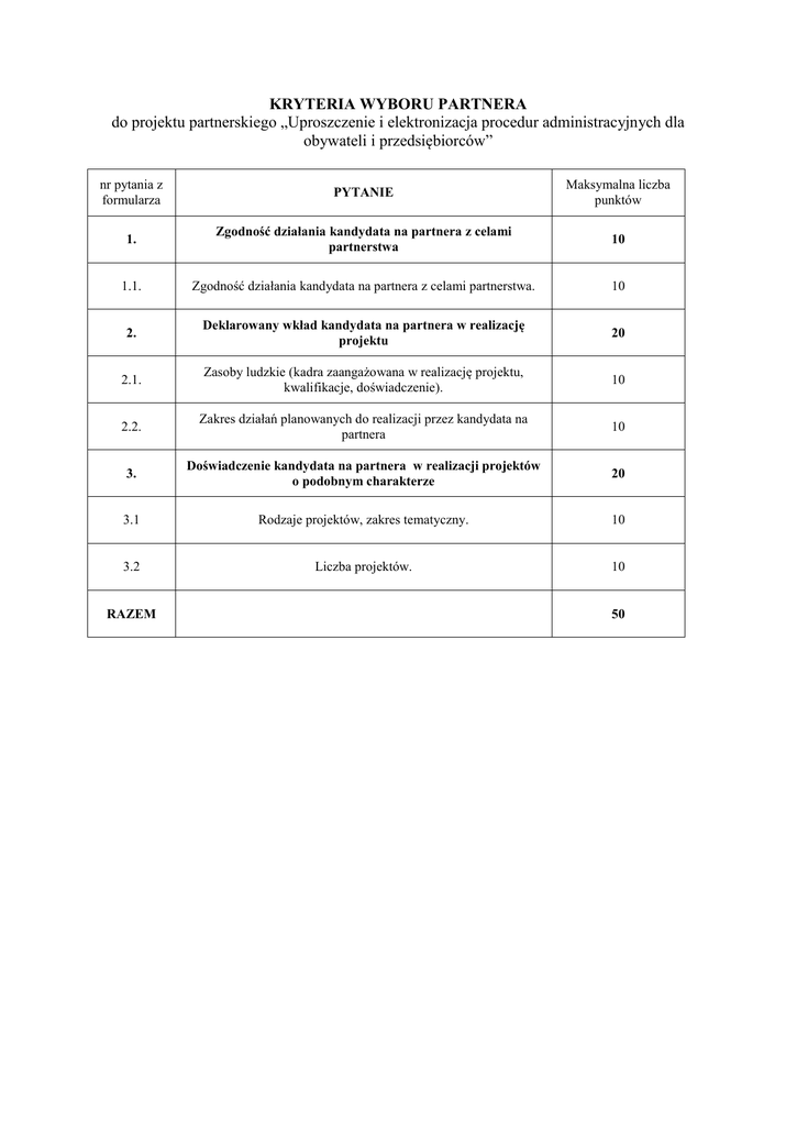 KRYTERIA WYBORU PARTNERA do projektu partnerskiego „Uproszczenie i elektronizacja procedur administracyjnych dla obywateli i przedsiębiorców” nr pytania z formularza PYTANIE Maksymalna liczba punktów 1. Zgodność działania kandydata na partnera z celami partnerstwa 10 1.1. Zgodność działania kandydata na partnera z celami partnerstwa. 10 2. Deklarowany wkład kandydata na partnera w realizację projektu 20 2.1. Zasoby ludzkie (kadra zaangażowana w realizację projektu, kwalifikacje, doświadczenie). 10 2.2. Zakres działań planowanych do realizacji przez kandydata na partnera 10 3. Doświadczenie kandydata na partnera w realizacji projektów o podobnym charakterze 20 3.1 Rodzaje projektów, zakres tematyczny. 10 3.2 Liczba projektów. 10 RAZEM 50