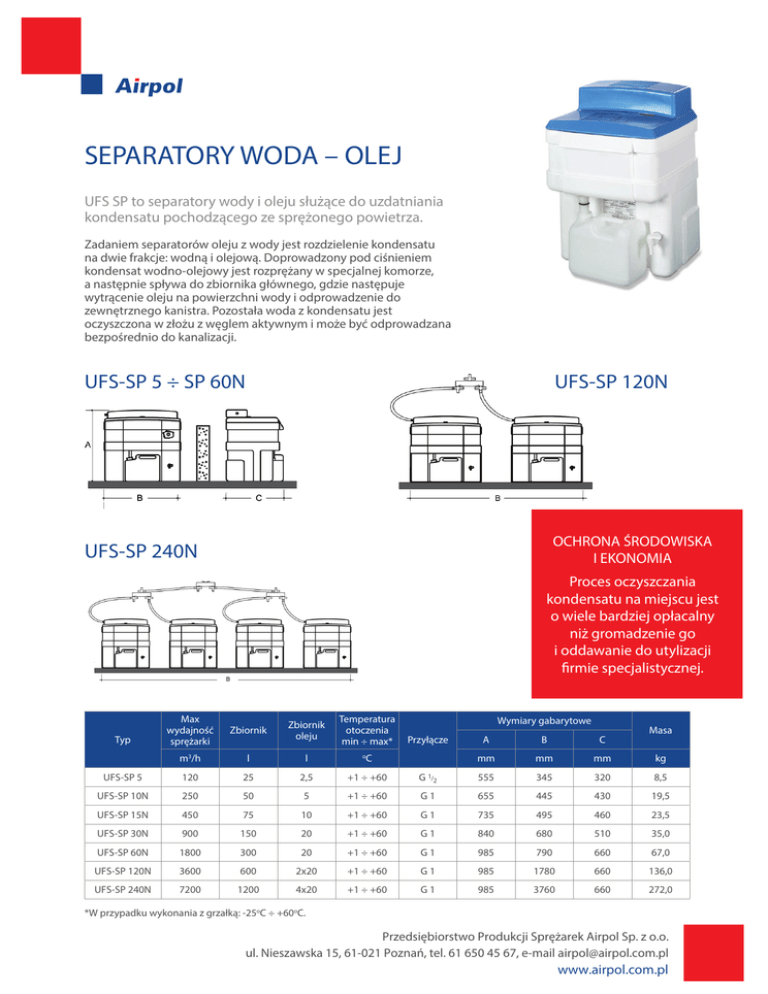 SEPARATORY WODA – OLEJ UFS SP to separatory wody i oleju służące do uzdatniania kondensatu pochodzącego ze sprężonego powietrza. Zadaniem separatorów oleju z wody jest rozdzielenie kondensatu na dwie frakcje: wodną i olejową. Doprowadzony pod ciśnieniem kondensat wodno-olejowy jest rozprężany w specjalnej komorze, a następnie spływa do zbiornika głównego, gdzie następuje wytrącenie oleju na powierzchni wody i odprowadzenie do zewnętrznego kanistra. Pozostała woda z kondensatu jest oczyszczona w złożu z węglem aktywnym i może być odprowadzana bezpośrednio do kanalizacji. UFS-SP 5 ÷ SP 60N UFS-SP 120N UFS-SP 240N OCHRONA ŚRODOWISKA I EKONOMIA Proces oczyszczania kondensatu na miejscu jest o wiele bardziej opłacalny niż gromadzenie go i oddawanie do utylizacji firmie specjalistycznej. Temperatura otoczenia min ÷ max* Max wydajność sprężarki Zbiornik Zbiornik oleju m3/h l l UFS-SP 5 120 25 2,5 +1 ÷ +60 UFS-SP 10N 250 50 5 UFS-SP 15N 450 75 UFS-SP 30N 900 UFS-SP 60N Wymiary gabarytowe Przyłącze Masa A B C mm mm mm kg G 1/2 555 345 320 8,5 +1 ÷ +60 G1 655 445 430 19,5 10 +1 ÷ +60 G1 735 495 460 23,5 150 20 +1 ÷ +60 G1 840 680 510 35,0 1800 300 20 +1 ÷ +60 G1 985 790 660 67,0 UFS-SP 120N 3600 600 2x20 +1 ÷ +60 G1 985 1780 660 136,0 UFS-SP 240N 7200 1200 4x20 +1 ÷ +60 G1 985 3760 660 272,0 Typ C o *W przypadku wykonania z grzałką: -25oC ÷ +60oC. Przedsiębiorstwo Produkcji Sprężarek Airpol Sp. z o.o. ul. Nieszawska 15, 61-021 Poznań, tel. 61 650 45 67, e-mail [email protected] www.airpol.com.pl