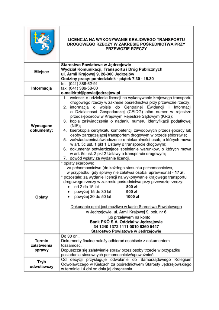 LICENCJA NA WYKONYWANIE KRAJOWEGO TRANSPORTU DROGOWEGO RZECZY W ZAKRESIE POŚREDNICTWA PRZY PRZEWOZIE RZECZY Miejsce Informacja Wymagane dokumenty: Opłaty Termin załatwienia sprawy Tryb odwoławczy Starostwo Powiatowe w Jędrzejowie Wydział Komunikacji, Transportu i Dróg Publicznych ul. Armii Krajowej 9, 28-300 Jędrzejów Godziny pracy: poniedziałek - piątek 7.30 - 15.30 tel. (041) 386-62-91 fax. (041) 386-58-00 e-mail:[email protected] 1. wniosek o udzielenie licencji na wykonywanie krajowego transportu drogowego rzeczy w zakresie pośrednictwa przy przewozie rzeczy; 2. informacja o wpisie do Centralnej Ewidencji i Informacji o Działalności Gospodarczej (CEIDG) albo numer w rejestrze przedsiębiorców w Krajowym Rejestrze Sądowym (KRS); 3. kopia zaświadczenia o nadaniu numeru identyfikacji podatkowej (NIP); 4. kserokopia certyfikatu kompetencji zawodowych przedsiębiorcy lub osoby zarządzającej transportem drogowym w przedsiębiorstwie; 5. zaświadczenie/oświadczenie o niekaralności osób, o których mowa w art. 5c ust. 1 pkt 1 Ustawy o transporcie drogowym; 6. dokumenty potwierdzające spełnienie warunków, o których mowa w art. 5c ust. 2 pkt 2 Ustawy o transporcie drogowym; 7. dowód wpłaty za wydanie licencji. * opłaty skarbowe: - za pełnomocnictwo (do każdego stosunku pełnomocnictwa, w przypadku, gdy sprawy nie załatwia osoba uprawniona) - 17 zł. * pozostałe: za wydanie licencji na wykonywanie krajowego transportu drogowego rzeczy w zakresie pośrednictwa przy przewozie rzeczy: od 2 do 15 lat 800 zł powyżej 15 do 30 lat 900 zł powyżej 30 do 50 lat 1000 zł Dokonanie opłat jest możliwe w kasie Starostwa Powiatowego w Jędrzejowie, ul. Armii Krajowej 9, pok. nr 6 lub przelewem na konto: Bank PKO S.A. Oddział w Jędrzejowie 34 1240 1372 1111 0010 6360 5447 Starostwo Powiatowe w Jędrzejowie Do 30 dni. Dokumenty finalne należy odbierać osobiście z dokumentem tożsamości. Dopuszcza się załatwienie spraw przez osoby trzecie w przypadku posiadania stosownych pełnomocnictw/upoważnień. Od decyzji przysługuje odwołanie do Samorządowego Kolegium Odwoławczego w Kielcach za pośrednictwem Starosty Jędrzejowskiego w terminie 14 dni od dnia jej doręczenia. Uwagi Opis W przypadku braku kompletu wymaganych dokumentów wnioskodawca zostanie wezwany do ich uzupełnienia w terminie 7 dni i złożenia w Wydziale Komunikacji, Transportu i Dróg Publicznych pok. Nr 11. Termin załatwienia sprawy liczy się od dnia złożenia wszystkich wymaganych dokumentów. Nieuzupełnienie brakujących dokumentów w określonym terminie będzie skutkować pozostawieniem wniosku bez rozpoznania. Podstawa prawna: 1. Ustawa z dnia 6 września 2001 r. o transporcie drogowym (tj. Dz. U. z 2013 r., poz. 1414). 2. Ustawa z dnia 14 czerwca 1960 r. - Kodeks postępowania administracyjnego (tj. Dz. U. z 2016 r., poz. 23). 3. Rozporządzenie Ministra Transportu, Budownictwa i Gospodarki Morskiej z dnia 6 sierpnia 2013 r. w sprawie wysokości opłat za czynności administracyjne związane z wykonywaniem przewozu drogowego oraz za egzaminowanie i wydanie certyfikatu kompetencji zawodowych (tj. Dz. U. z 2013 r., poz. 916). 4. Rozporządzenie Ministra Transportu, Budownictwa i Gospodarki Morskiej z dnia 18 czerwca 2013 r. w sprawie wzorów zezwolenia na wykonywanie zawodu przewoźnika drogowego i wzorów licencji na wykonywanie transportu drogowego oraz wypisów z tych dokumentów (tj. Dz. U. z 2013 r., poz. 713). 5. Ustawa o opłacie skarbowej z dnia 16 listopada 2006 r. (tj. Dz. U. z 2015 r., poz. 783). Starostwo Powiatowe w Jędrzejowie Wydział Komunikacji, Transportu i Dróg Publicznych WNIOSEK o udzielenie licencji na wykonywanie krajowego transportu drogowego rzeczy w zakresie po rednictwa przy przewozie rzeczy. 1. Oznaczenie przedsiębiorcy: …………………………………………………………………. …………………………………………………………………………………………………... …………………………………………………………………………………………………... …………………………………………………………………………………………………... …………………………………………………………………………………………………... nazwisko i imię/ nazwa przedsiębiorcy/ siedziba i adres 2. Numer KRS (tylko w przypadku osób prawnych) …………………………………………………………………………………………………... 3. Numer identyfikacji podatkowej (NIP) ……………………………………………………… 4. Określenie rodzaju i zakresu transportu: …………………………………………………….. …………………………………………………………………………………………………... 5. Czas na jaki licencja ma być udzielona: od 2 – 15 lat od 15 – 30 lat od 30 – 50 lat Do wniosku o udzielenie licencji załączamŚ 1. Kserokopię certyfikatu kompetencji zawodowych przedsiębiorcy lub osoby zarządzającej transportem drogowym w przedsiębiorstwie: …………………………………………………………………………………………………... …………………………………………………………………………………………………... 2. Zaświadczenie/oświadczenie o niekaralności osób, o których mowa w art. 5c ust. 1 pkt 1: …………………………………………………………………………………………………... …………………………………………………………………………………………………... 3. Dokumenty potwierdzające spełnienie warunków, o których mowa w art. 5c ust. 2 pkt 2: …………………………………………………………………………………………………... …………………………………………………