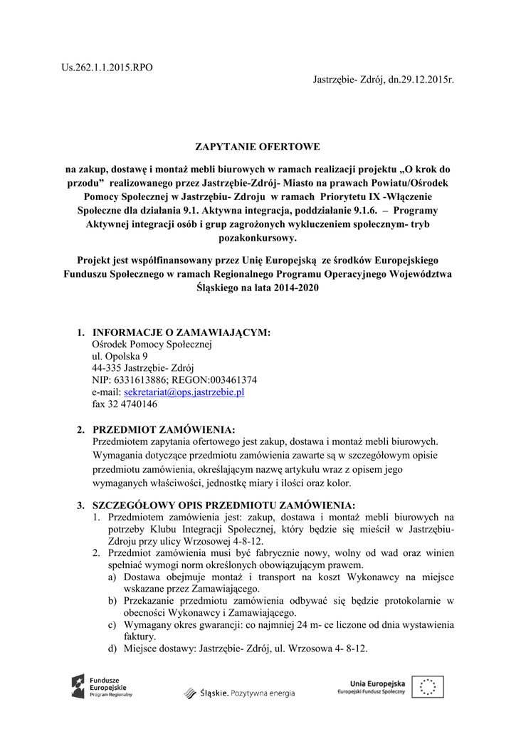 Us.262.1.1.2015.RPO Jastrzębie- Zdrój, dn.29.12.2015r. ZAPYTANIE OFERTOWE na zakup, dostawę i montaż mebli biurowych w ramach realizacji projektu „O krok do przodu” realizowanego przez Jastrzębie-Zdrój- Miasto na prawach Powiatu/Ośrodek Pomocy Społecznej w Jastrzębiu- Zdroju w ramach Priorytetu IX -Włączenie Społeczne dla działania 9.1. Aktywna integracja, poddziałanie 9.1.6. – Programy Aktywnej integracji osób i grup zagrożonych wykluczeniem społecznym- tryb pozakonkursowy. Projekt jest współfinansowany przez Unię Europejską ze środków Europejskiego Funduszu Społecznego w ramach Regionalnego Programu Operacyjnego Województwa Śląskiego na lata 2014-2020 1. INFORMACJE O ZAMAWIAJĄCYM: Ośrodek Pomocy Społecznej ul. Opolska 9 44-335 Jastrzębie- Zdrój NIP: 6331613886; REGON:003461374 e-mail: [email protected] fax 32 4740146 2. PRZEDMIOT ZAMÓWIENIA: Przedmiotem zapytania ofertowego jest zakup, dostawa i montaż mebli biurowych. Wymagania dotyczące przedmiotu zamówienia zawarte są w szczegółowym opisie przedmiotu zamówienia, określającym nazwę artykułu wraz z opisem jego wymaganych właściwości, jednostkę miary i ilości oraz kolor. 3. SZCZEGÓŁOWY OPIS PRZEDMIOTU ZAMÓWIENIA: 1. Przedmiotem zamówienia jest: zakup, dostawa i montaż mebli biurowych na potrzeby Klubu Integracji Społecznej, który będzie się mieścił w JastrzębiuZdroju przy ulicy Wrzosowej 4-8-12. 2. Przedmiot zamówienia musi być fabrycznie nowy, wolny od wad oraz winien spełniać wymogi norm określonych obowiązującym prawem. a) Dostawa obejmuje montaż i transport na koszt Wykonawcy na miejsce wskazane przez Zamawiającego. b) Przekazanie przedmiotu zamówienia odbywać się będzie protokolarnie w obecności Wykonawcy i Zamawiającego. c) Wymagany okres gwarancji: co najmniej 24 m- ce liczone od dnia wystawienia faktury. d) Miejsce dostawy: Jastrzębie- Zdrój, ul. Wrzosowa 4- 8-12. e) Termin realizacji zamówienia: 14 dni od dnia podpisania umowy. Przedmiot zamówienia Opis zamówienia Ilość w sztukach Pomieszczenie biurowe Szafa na dokumenty/ubrania Szafa na dokumenty Szafa metalowa szafa o wymiarach gabarytowych: wys. 1850 mm, głębokość 360 mm, szerokość 800 mm, w jednej części szafy 5 poziomów segregatorowych, druga część szafy ubraniowa, całość szafy zamykana na jeden kluczyk wykonane z płyty wiórowej melaminowanej obustronnie w klasie E1, cały korpus wykonany z płyty o grubości min. 18mm, klamki metalowe w kolorze chrom matowy lub srebrne, szafa wykonana w kolorze calvados. szafa o wymiarach gabarytowych: wys. 1850 mm, głębokość 360 mm, szerokość 800 mm, szafa zamykana na dwa klucze (część dolna- 2 poziomy segregatorowe zamykana drzwiami skrzydłowymi wykonanymi z płyty wiórowej melaminowanej obustronnie w klasie E1, część górna- 3 poziomy segregatorowe zamykana drzwiami szklanymi), cały korpus wykonany z płyty o grubości min. 18mm, klamki metalowe w kolorze chrom matowy lub srebrne, szafa wykonana w kolorze calvados. szafa o wymiarach gabarytowych: wys. 19000 mm, głębokość 400 mm, szerokość 1000 mm, udźwig/półka 50kg, metalowa szafa biurowa do przechowywania segregatorów, materiałów biurowych itp. wykonana z lakierowanej proszkowo blachy stalowej, w komplecie 4 półki z regulacją wysokości, zamek z klamką obrotową z 2 kluczami, 1 1 1 szafa wykonana w kolorze szarym Biurko Regał pod ksero/drukarkę Krzesła obrotowe Krzesła Szafa na dokumenty biurko prostokątne o wymiarach gabarytowych: wysokość 750mm, szerokość 700mm, długość 1400mm, wysuwana półka na klawiaturę, biurko o konstrukcji płytowej, blat, boki i przód wykonane z płyty wiórowej melaminowanej, cały korpus wykonany z płyty o grubości min. 18 mm wszystkie krawędzie wykończone okleiną PCV, biurko wykonane w kolorze calvados. regał o wymiarach gabarytowych: wysokość 600 mm, głębokość 600 mm, długość 600mm, wykonane z płyty wiórowej melaminowanej obustronnie w klasie E1, cały korpus wykonany z płyty o grubości min. 18mm, wszystkie krawędzie wykończone okleiną PCV, regał zamykany na kluczyk, regał wykonany w kolorze calvados. krzesło biurowe dla dorosłych, z tapicerowanym siedziskiem oraz oparciem, mechanizm ruchowy pozwalający na: regulację wysokości siedziska, regulację odległości siedziska od oparcia, regulację kąta nachylenia siedziska względem oparcia, płynna regulacja wysokości siedziska za pomocą podnośnika pneumatycznego, lekka, a stabilna nylonowa, pięcioramienna podstawa jezdna, kolor szary krzesło konferencyjne typ „ISO”, bez podłokietników, siedzisko oraz oparcie wykonane z materiału: eko-skóra- kolor czarny, rama stalowa malowana na kolor czarny, wymiary: wysokość 82 cm, szerokość 54,5x 42,5 cm, wysokość siedziska 47 cm Pomieszczenie warsztatowe 2 szafa o wymiarach gabarytowych: wys. 1850 mm, głębokość 360 mm, szerokość 1 1 2 4 800 mm, całość szafy zamykana na jeden kluczyk, 5 poziomów segregatorowych, cały korpus wykonany z płyty o grubości min. 18mm, klamki metalowe w kolorze chrom matowy lub srebrne, szafa wykonana w kolorze calvados. Stół pod catering wysokość stołu 750mm, szerokość 700 mmm długość stołu 1400 mm, wykonane z płyty wiórowej melaminowanej obustronnie w klasie E1, cały korpus wykonany z płyty o grubości min. 18mm wszystkie krawędzie wykończone okleiną PCV, stół wykonany z płyty o kolorze calvados. Stół konferencyjny wysokość stołu 750mm, szerokość 700 mmm długość stołu 1600 mm, wykonane z płyty wiórowej melaminowanej obustronnie w klasie E1, cały korpus wykonany z płyty o grubości min. 18mm, wszystkie krawędzie wykończone okleiną PCV, stół wykonany z płyty o kolorze calvados. Krzesło krzesło konferencyjne typ „ISO”, bez podłokietników, siedzisko oraz oparcie wykonane z materiału: eko-skóra- kolor czarny, rama stalowa malowana na kolor czarny, wymiary: wysokość 82 cm, szerokość