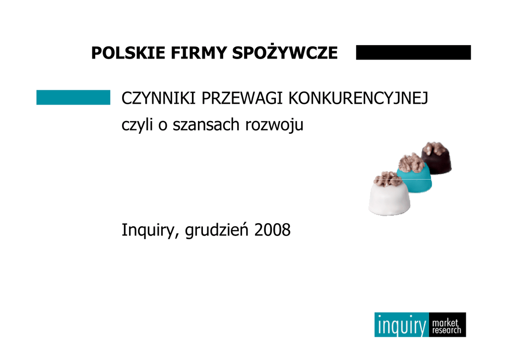 POLSKIE FIRMY SPOŻYWCZE CZYNNIKI PRZEWAGI KONKURENCYJNEJ czyli o szansach rozwoju Inquiry, grudzień 2008 ŹRÓDŁA PRZEWAGI KONKURENCYJNEJ (1) Niższe koszty, niższe ceny – Czy nadal mamy przewagę kosztową? – Ile firm może być najtańszymi na rynku? – Czy wszystkie produkty żywnościowe muszą być tanie? NIE WSZYSCY CHCĄ ŻEBY BYŁO TANIO DLA WIELU OSÓB LICZY SIĘ JAKOŚĆ ŹRÓDŁA PRZEWAGI KONKURENCYJNEJ (2) Wyróżniające się produkty – W jaki sposób można się wyróżniać? – Czy potrafimy to osiągnąć: w Polsce? na rynkach zagranicznych? CO MOŻE WYRÓŻNIAĆ OFERTĘ PRODUCENTA ŻYWNOŚCI? Dostępność – Mars, Coca Cola, Danone Silna marka – choćby w swoim segmencie – Morliny, Grześki, Łaciate, Kasztanki, Milko, … Jakość Innowacyjność – szybkie wprowadzanie na rynek produktów odpowiadających trendom na rynku i zmieniającym się potrzebom Unikatowe produkty – specjalizacja CZY POTRAFIMY TO OSIĄGNĄĆ? RYNEK POLSKI CZY POTRAFIMY TO OSIĄGNĄĆ? USA CZY POTRAFIMY TO OSIĄGNĄĆ? USA, c.d. RYNKI ZAGRANICZNE CZYM MOŻEMY SIĘ WYRÓŻNIAĆ? Dojrzałe, ustabilizowane rynki Ogromna różnorodność produktów Produkty adresowane do konkretnych potrzeb konsumenckich – Produkty organiczne – Produkty probiotyczne – Produkty beztłuszczowe – … POLSKA ŻYWNOŚĆ CZYM MOŻEMY SIĘ WYRÓŻNIAĆ? Naturalne produkty? Tradycja? Egzotyka? Organiczne rolnictwo? Bliskość? Zdrowie? Ekologia? JAKIE WARTOŚĆI MOGĄ BYĆ ZWIĄZANE Z POLSKIMI MARKAMI? POLSKIE MARKI ZA GRANICĄ Rosja Europa Środkowa Europa Zachodnia USA … reszta świata??? … inne marki??? POLSKIE MARKI NA POLSKIM RYNKU Wiele dobrych marek konkuruje coraz bardziej zawzięcie ze sobą nawzajem i z dużymi koncernami Rozdrobnienie na rynku jednak nie sprzyja efektywności ODPOWIEDŹ MARKETING Trendy demograficzne i społeczne Potrzeby konsumentów Motywacje związane z zakupem i konsumpcją Segmentacja rynku i wybór grupy docelowej Znajomość i zrozumienie oferty rynkowej Czynniki wyboru produktu Komunikacja Postrzeganie cen Satysfakcja i lojalność klienta Nowe produkty OCZEKIWANIA KONSUMENTÓW OCZEKIWANIA KONSUMENTÓW ODPOWIEDŹ, c.d. … I FINANSE Finansowanie działalności Inwestycje marketingowe Ekonomia skali czy specjalizacja? KONSOLIDACJA BRANŻY POZWOLI SKUTECZNIE KONKUROWAĆ NA RYNKU POLSKIM I MIĘDZYNARODOWYM DZIĘKUJĘ ZA UWAGĘ KONTAKT: Agnieszka Górnicka [email protected] Inquiry sp. z o.o. ul. Głogowska 44 01-743 Warszawa Tel. (22) 561 92 50