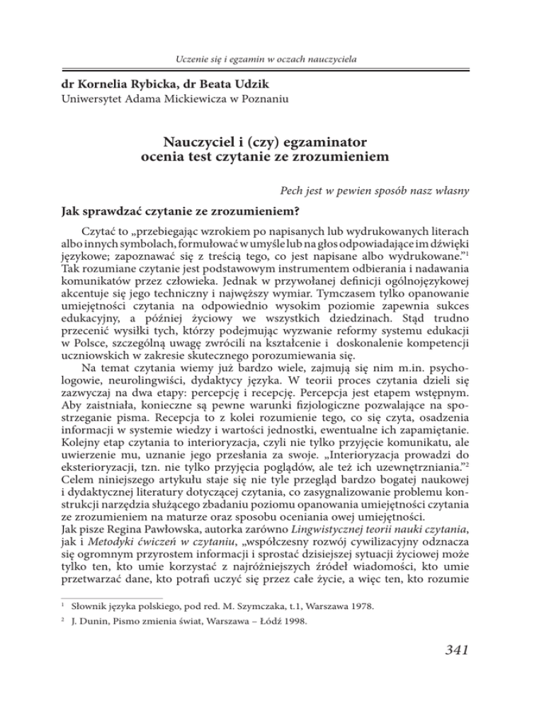 Uczenie się i egzamin w oczach nauczyciela dr Kornelia Rybicka, dr Beata Udzik Uniwersytet Adama Mickiewicza w Poznaniu Nauczyciel i (czy) egzaminator ocenia test czytanie ze zrozumieniem Pech jest w pewien sposób nasz własny Jak sprawdzać czytanie ze zrozumieniem? Czytać to „przebiegając wzrokiem po napisanych lub wydrukowanych literach albo innych symbolach, formułować w umyśle lub na głos odpowiadające im dźwięki językowe; zapoznawać się z treścią tego, co jest napisane albo wydrukowane.”1 Tak rozumiane czytanie jest podstawowym instrumentem odbierania i nadawania komunikatów przez człowieka. Jednak w przywołanej definicji ogólnojęzykowej akcentuje się jego techniczny i najwęższy wymiar. Tymczasem tylko opanowanie umiejętności czytania na odpowiednio wysokim poziomie zapewnia sukces edukacyjny, a później życiowy we wszystkich dziedzinach. Stąd trudno przecenić wysiłki tych, którzy podejmując wyzwanie reformy systemu edukacji w Polsce, szczególną uwagę zwrócili na kształcenie i doskonalenie kompetencji uczniowskich w zakresie skutecznego porozumiewania się. Na temat czytania wiemy już bardzo wiele, zajmują się nim m.in. psychologowie, neurolingwiści, dydaktycy języka. W teorii proces czytania dzieli się zazwyczaj na dwa etapy: percepcję i recepcję. Percepcja jest etapem wstępnym. Aby zaistniała, konieczne są pewne warunki fizjologiczne pozwalające na spostrzeganie pisma. Recepcja to z kolei rozumienie tego, co się czyta, osadzenia informacji w systemie wiedzy i wartości jednostki, ewentualne ich zapamiętanie. Kolejny etap czytania to interioryzacja, czyli nie tylko przyjęcie komunikatu, ale uwierzenie mu, uznanie jego przesłania za swoje. „Interioryzacja prowadzi do eksterioryzacji, tzn. nie tylko przyjęcia poglądów, ale też ich uzewnętrzniania.”2 Celem niniejszego artykułu staje się nie tyle przegląd bardzo bogatej naukowej i dydaktycznej literatury dotyczącej czytania, co zasygnalizowanie problemu konstrukcji narzędzia służącego zbadaniu poziomu opanowania umiejętności czytania ze zrozumieniem na maturze oraz sposobu oceniania owej umiejętności. Jak pisze Regina Pawłowska, autorka zarówno Lingwistycznej teorii nauki czytania, jak i Metodyki ćwiczeń w czytaniu, „współczesny rozwój cywilizacyjny odznacza się ogromnym przyrostem informacji i sprostać dzisiejszej sytuacji życiowej może tylko ten, kto umie korzystać z najróżniejszych źródeł wiadomości, kto umie przetwarzać dane, kto potrafi uczyć się przez całe życie, a więc ten, kto rozumie Słownik języka polskiego, pod red. M. Szymczaka, t.1, Warszawa 1978. 1 J. Dunin, Pismo zmienia świat, Warszawa – Łódź 1998. 2 341 XIV Konferencja Diagnostyki Edukacyjnej, Opole 2008 teksty odbierane, kto umie czytać szybko i funkcjonalnie, bo większość ważnych i potrzebnych informacji przekazuje się za pomocą pisma i druku.”3 Proces kształcenia w nowoczesnych społeczeństwach powinien być nastawiony na uczenie i doskonalenie umiejętności czytania. W Polsce zainteresowanie czytaniem nie tylko na najniższych poziomach edukacji nasiliło się szczególnie podczas prac nad reformą edukacji w latach dziewięćdziesiątych XX wieku. „Jedną z podstawowych sprawności, w jaką szkoła wyposaża ucznia, powinna być umiejętność czytania – część składowa ogólnego wykształcenia, która obejmuje percepcję i rozumienie czytanego tekstu. Czytanie jest jednym z podstawowych narzędzi samokształcenia, ciągłego rozwijania własnej osobowości, które ułatwia uczenie się, czyni pracę umysłową bardziej świadomą i pozwala jednocześnie poznawać świat nauki i kultury, otaczającą go rzeczywistość.”4 Stąd też zaistniała potrzeba z jednej strony doskonalenia czytania na wyższych poziomach, z drugiej strony diagnozowania stanu owych umiejętności. Właśnie owo diagnozowanie stopnia rozumienia czytanego tekstu stanowi wyzwanie zarówno dla konstruktorów zadań egzaminacyjnych (szerzej być może dla twórców koncepcji egzaminu), jak i dla nauczycieli chcących swoich uczniów jak najlepiej do egzaminu przygotować. Jak sprawdzić, czy uczeń zrozumiał przeczytany tekst, jakie narzędzie będzie do tego najlepsze? Można tutaj zaprezentować dwa skrajne stanowiska. Pierwsze reprezentuje Tadeusz Patrzałek, który zadania zamknięte uznał za najodpowiedniejsze dla testu czytania ze zrozumieniem. Badany wybiera wówczas odpowiedzi spośród podanych, nie musi ich formułować, pisać. Patrzałek podaje cztery przyczyny takiego stanowiska: „ – Daje się nimi (zadaniami zamkniętymi – przyp. autorek) sprawdzić rozumienie tekstu czytanego w postaci czystej, bez pośrednictwa innych czynności, np. pisania; jeśli ktoś nie daje poprawnej odpowiedzi w zadaniu otwartym, w którym ma ją sformułować, to nie wiadomo dlaczego: czy nie wyczytał jej z tekstu, czy tylko nie potrafił jej wypowiedzieć, napisać. – Czytanie należy do umiejętności odbiorczych, w dużym stopniu polega na odtwarzaniu nadanego w tekście komunikatu i wybieraniu z niego treści potrzebnych, a do tego naturalnie nadają się właśnie zadania typu wyboru (…). – Zadania zamknięte są ekonomiczne w stosowaniu (…). – Zadania otwarte są potrzebne testowi czytania ze zrozumieniem jedynie w wąskim zakresie sprawdzanych rzadko zastosowań nietypowych (twórczych).”5 R. Pawłowska, Metodyka ćwiczeń w czytaniu, Gdańsk 2002, s. 8. 3 D. Krzyżyk, Czytanie ze zrozumieniem. Część pierwsza: Teoretyczne podstawy testu czytania ze zrozumieniem, [w:] Przygotowanie ucznia do egzaminu maturalnego z języka polskiego (materiały konferencyjne), Biuletyn Maturalny OKE w Jaworznie. www.oke.jaworzno.pl 4 T. Patrzałek, O strukturze testu czytanie ze zrozumieniem, s. 202 – 207. 5 342 „Polonistyka” nr 4, 1998, Uczenie się i egzamin w oczach nauczyciela Patrzałek przestrzega przed budowaniem testu, w którym oprócz czytania