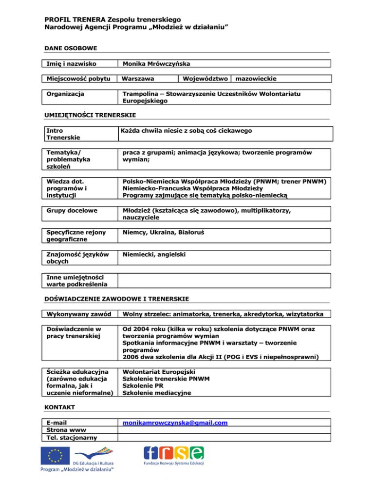 PROFIL TRENERA Zespołu trenerskiego Narodowej Agencji Programu „MłodzieŜ w działaniu” DANE OSOBOWE Imię i nazwisko Monika Mrówczyńska Miejscowość pobytu Warszawa Organizacja Trampolina – Stowarzyszenie Uczestników Wolontariatu Europejskiego Województwo mazowieckie UMIEJĘTNOŚCI TRENERSKIE Intro Trenerskie KaŜda chwila niesie z sobą coś ciekawego Tematyka/ problematyka szkoleń praca z grupami; animacja językowa; tworzenie programów wymian; Wiedza dot. programów i instytucji Polsko-Niemiecka Współpraca MłodzieŜy (PNWM; trener PNWM) Niemiecko-Francuska Współpraca MłodzieŜy Programy zajmujące się tematyką polsko-niemiecką Grupy docelowe MłodzieŜ (kształcąca się zawodowo), multiplikatorzy, nauczyciele Specyficzne rejony geograficzne Niemcy, Ukraina, Białoruś Znajomość języków obcych Niemiecki, angielski Inne umiejętności warte podkreślenia DOŚWIADCZENIE ZAWODOWE I TRENERSKIE Wykonywany zawód Wolny strzelec: animatorka, trenerka, akredytorka, wizytatorka Doświadczenie w pracy trenerskiej Od 2004 roku (kilka w roku) szkolenia dotyczące PNWM oraz tworzenia programów wymian Spotkania informacyjne PNWM i warsztaty – tworzenie programów 2006 dwa szkolenia dla Akcji II (POG i EVS i niepełnosprawni) ŚcieŜka edukacyjna (zarówno edukacja formalna, jak i uczenie nieformalne) Wolontariat Europejski Szkolenie trenerskie PNWM Szkolenie PR Szkolenie mediacyjne KONTAKT E-mail Strona www Tel. stacjonarny [email protected]