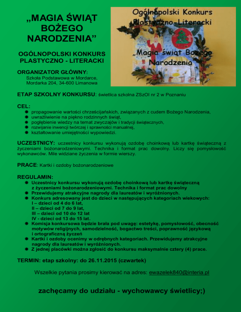 „MAGIA ŚWIĄT BOŻEGO NARODZENIA” OGÓLNOPOLSKI KONKURS PLASTYCZNO - LITERACKI ORGANIZATOR GŁÓWNY: Szkoła Podstawowa w Mordarce, Mordarka 204, 34-600 Limanowa ETAP SZKOLNY KONKURSU: świetlica szkolna ZSzOI nr 2 w Poznaniu CEL: propagowanie wartości chrześcijańskich, związanych z cudem Bożego Narodzenia, uwrażliwienie na piękno rodzinnych świąt, pogłębienie wiedzy na temat zwyczajów i tradycji świątecznych, rozwijanie inwencji twórczej i sprawności manualnej, kształtowanie umiejętności wypowiedzi. UCZESTNICY: uczestnicy konkursu wykonują ozdobę choinkową lub kartkę świąteczną z życzeniami bożonarodzeniowymi. Technika i format prac dowolny. Liczy się pomysłowość wykonawców. Mile widziane życzenia w formie wierszy. PRACE: Kartki i ozdoby bożonarodzeniowe REGULAMIN: Uczestnicy konkursu wykonują ozdobę choinkową lub kartkę świąteczną z życzeniami bożonarodzeniowymi. Technika i format prac dowolny Przewidujemy atrakcyjne nagrody dla laureatów i wyróżnionych. Konkurs adresowany jest do dzieci w następujących kategoriach wiekowych: I – dzieci od 4 do 6 lat, II – dzieci od 7 do 9 lat, III – dzieci od 10 do 12 lat IV - dzieci od 13 do 15 lat. Komisja konkursowa będzie brała pod uwagę: estetykę, pomysłowość, obecność motywów religijnych, samodzielność, bogactwo treści, poprawność językową i ortograficzną życzeń Kartki i ozdoby ocenimy w odrębnych kategoriach. Przewidujemy atrakcyjne nagrody dla laureatów i wyróżnionych. Z jednej placówki można zgłosić do konkursu maksymalnie cztery (4) prace. TERMIN: etap szkolny: do 26.11.2015 (czwartek) Wszelkie pytania prosimy kierować na adres: [email protected] zachęcamy do udziału - wychowawcy świetlicy;)