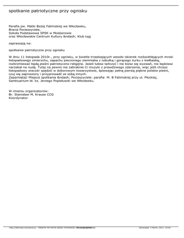 spotkanie patriotyczne przy ognisku Parafia pw. Matki Bożej Fatimskiej we Włocławku, Bracia Pocieszyciele, Szkoła Podstawowa SPSK w Modzerowie oraz Włocławskie Centrum Kultury – Klub Łęg zapraszają na: spotkanie patriotyczne przy ognisku W dniu 11 listopada 2010r., przy ognisku, w świetle trzaskających wesoło iskierek rozświetlających mroki listopadowego zmierzchu, zapachu pieczonego ziemniaka z cebulką i gorącego żurku z kiełbaską, rozbrzmiewać będą pieśni patriotyczno-religijne. Jeżeli lubisz tańczyć i nie boisz się wyzwań, nie będziesz narzekał na nudę. Tutaj na pewno nie zabraknie Ci muzyki z prawdziwego zdarzenia, więc jeśli chcesz listopadowy wieczór spędzić w doborowym towarzystwie, śpiewając pełną piersią piękne polskie pieśni, czuj się zaproszony i przyprowadź ze sobą innych. Zapamiętaj! Miejsce spotkania – Pocieszyciele: parafia M. B Fatimskiej przy ul. Płockiej, Sanktuarium bł. ks. Jerzego Popiełuszki we Włocławku. W imieniu organizatorów: Br. Stanisław M. Krause CCG Koordynator http://fatimska.wloclawek.pl - PARAFIA PW MATKI BOŻEJ FATIMSKIEJ WE Powered WŁOCŁAWKU by Mambo Generated: 3 March, 2017, 19:04