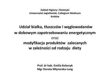 Zakład Higieny i Dietetyki Uniwersytet Jagielloński, Collegium Medicum Kraków Udział białka, tłuszczów i węglowodanów w dobowym zapotrzebowaniu energetycznym oraz modyfikacja produktów zalecanych w zależności od rodzaju diety Prof. dr hab. Emilia Kolarzyk Mgr Dorota Młynarska-Lang % sumy dobowego zapotrzebowania energetycznego Rodzaj diety Białko Tłuszcz ogółem (%) (%) Węglowodany (%) Dieta podstawowa 15,5 29,5 55 Dieta bogatobiałkowa 20 28 52 Dieta łatwo strawna 15,5 29,5 55 Dieta łatwo strawna z ograniczeniem tłuszczu 16,5 17 66,5 Dieta łatwo strawna z ograniczeniem substancji pobudzających wydzielanie soku żołądkowego 16 31,5 52,5 Prof. Emilia Kolarzyk % sumy dobowego zapotrzebowania energetycznego Rodzaj diety Białko ogółem (%) Tłuszcz (%) Węglowodany (%) Dieta ubogo-energetyczna 20 - 25 25 Uzupełniają zapotrzebowanie energetyczne Dieta o kontrolowanej zawartości kwasów tłuszczowych 15 27 57,5 Dieta z ograniczeniem łatwo przyswajalnych węglowodanów 15 – 20 30 - 35 45 -50 Dieta łatwo strawna niskobiałkowa 8 30 62 Prof. Emilia Kolarzyk % sumy dobowego zapotrzebowania energetycznego Rodzaj diety Białko ogółem (%) Tłuszcz Węglowodany (%) (%) Papkowata 16 30 54 Płynna - - - Płynna wzmocniona 16 34 50 Dieta do żywienia przez zgłębnik lub przetokę 15 33 52 Prof. Emilia Kolarzyk Forma podaży poszczególnych produktów w zależności od rodzaju diety Produkty Dieta podstawowa Dieta łatwostrawna Dieta łatwostrawna papkowata Cielęcina kotlet cielęcy panierowany bitki cielęce duszone cielęcina gotowana zmielona Wołowina pieczeń klopsiki duszone z warzywami budyń z mięsa mielonego z sosem Drób kura pieczona potrawka z kurczaka rizotto z sosem Dorsz, sola, morszczuk dorsz smażony dorsz gotowany z warzywami dorsz gotowany zmielony pstrąg duszony /w folii/ pstrąg gotowany zmielony Pstrąg pstrąg smażony strumieniowy Prof. Emilia Kolarzyk Produkty Dieta podstawowa Dieta łatwo strawna Dieta łatwo strawna Ziemniaki frytki gotowane w całości z dodatkiem masła puree z dodatkiem mleka /2% -0,5%/ Makaron makaron gruby /rurki/ makaron wstążki makaron drobny /nitki/ Ryż ryż brązowy ryż dobrze ugotowany ryż dobrze ugotowany z sosem Kasze kasza wiejska kasza perłowa kasza drobna Prof. Emilia Kolarzyk Produkty Dieta podstawowa Dieta łatwo strawna Dieta łatwo strawna papkowata Marchew surówka z marchwi marchew gotowana puree z marchwi Buraki ćwikła buraki gotowane utarte buraki gotowane utarte zmiksowane Pomidor sałatka z pomidora pomidor bez skórki rozdrobniony pomidor bez skórki zmiksowany Dynia dynia duszona dynia gotowana dynia gotowana-puree Prof. Emilia Kolarzyk Produkty Dieta podstawowa Dieta łatwo strawna Dieta łatwostrawna papkowata Twaróg twaróg półtłusty twaróg chudy twaróg chudy zmiksowany z mlekiem 0,5% Serek homogenizowany serek homo. półtłusty serek homo. chudy serek homo. chudy Polędwica z drobiu plasterki plasterki drobno posiekana lub zmiksowana Szynka chuda plasterki drobno posiekana lub zmiksowana plasterki Prof. Emilia Kolarzyk Napoje Dieta podstawowa Dieta łatwo strawna Dieta łatwo strawna papkowata Herbata herbata, herbata z mlekiem słaba herbata, herbata z mlekiem 0,5%-2% tł. herbata z mlekiem 0,5%-2% tł. Napoje mleczne kakao z mlekiem kawa zbożowa z 2% tł. mlekiem 0,5%-2% tł. kawa zbożowa z mlekiem 0,5%-2% tł. Jogurt, kefir, maślanka, serwatka (zróżnicowane owoce i warzywa) koktajl mlecznoowocowy lub warzywny truskawki całe koktajl mlecznoowocowy lub warzywny truskawka przetarta koktajl mlecznoowocowy lub warzywny truskawka przetarta i zmiksowana Soki owocowe nektarowy klarowany rozcieńczony klarowany rozcieńczony Prof. Emilia Kolarzyk Produkty Dieta podstawowa Dieta łatwo strawna Dieta łatwo strawna papkowata Chleb chleb z grubego przemiału chleb pszenny chleb pszenny rozmoczony Bułki bułka razowa bułka pszenna suchary pszenne rozmoczone Biszkopt biszkopt biszkopt z ograniczoną ilością żółtek biszkopt rozmoczony Pieczywo cukiernicze pączek ciasto drożdżowe czerstwe ciasto drożdżowe Prof. Emilia Kolarzyk Owoce dieta podstawowa dieta łatwo strawna Jabłka jabłko surowe jabłko gotowane, jabłko gotowane, pieczone zmiksowane Morele morele morele bez skórki morele bez skórki zmiksowane Banany banan banan banan miksowany Winogrona winogrona całe winogrona bez pestek i skórek winogrona bez pestek i skórek -miksowane Prof. Emilia Kolarzyk dieta łatwo strawna papkowata Produkty Dieta podstawowa Dieta łatwostrawna Dieta łatwostrawna papkowata Masło masło masło dodawane na surowo masło dodawane na surowo do potraw miksowanych Margaryny margaryna miękka margaryny miękkie w umiarkowanych ilościach margaryny miękkie w umiarkowanych ilościach Oleje: rzepakowy, oliwa z oliwek do smażenia i na surowo oleje dodawane na surowo oleje dodawane do potraw na surowo Oleje: słonecznikowy, sojowy oleje na surowo oleje dodawane na surowo oleje dodawane na surowo Prof. Emilia Kolarzyk Forma podaży poszczególnych produktów w zależności od rodzaju diety Dieta łatwo strawna z ograniczeniem tłuszczu Dieta łatwo strawna z ograniczeniem substancji pobudzających wydzielanie soku żołądkowego Cielęcina chuda bitki cielęce duszone pulpety cielęce potrawka cielęca Wołowina chuda wołowina duszona z warzywami budyń z wołowiny wołowina gotowana z warzywami Drób kurczak pieczony w folii kurczak gotowany potrawka z kurczaka , kurczak gotowany Ryby morskie mintaj duszony w folii dorsz gotowany z warzywami mintaj gotowany z warzywami Ryby słodkowodne pstrąg duszony w folii pstrąg gotowany pstrąg gotowany Produkty Dieta łatwo strawna Prof. Emilia Kolarzyk Forma podaży poszczególnych produktów w zależności od rodzaju diety Produkty Dieta łatwo strawna Dieta łatwo strawna Dieta łatwo strawna z z ograniczeniem ograniczeniem substancji tłuszczu pobudzających wydzielanie soku żołądkowego Ziemniaki ziemniaki puree z masłem ziemniaki puree z