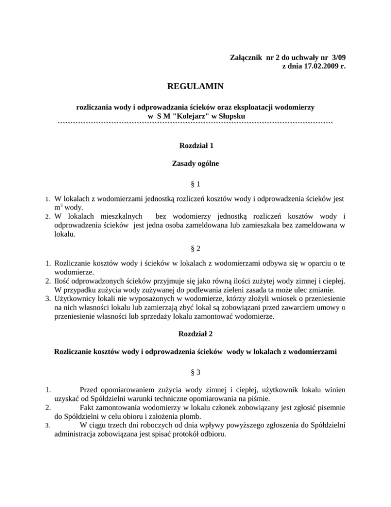 Załącznik nr 2 do uchwały nr 3/09 z dnia 17.02.2009 r. REGULAMIN rozliczania wody i odprowadzania ścieków oraz eksploatacji wodomierzy w S M "Kolejarz" w Słupsku ```````````````````````````````````````````````````````````````````````````````````````````````````````````` Rozdział 1 Zasady ogólne §1 W lokalach z wodomierzami jednostką rozliczeń kosztów wody i odprowadzenia ścieków jest m3 wody. 2. W lokalach mieszkalnych bez wodomierzy jednostką rozliczeń kosztów wody i odprowadzenia ścieków jest jedna osoba zameldowana lub zamieszkała bez zameldowana w lokalu. 1. §2 1. Rozliczanie kosztów wody i ścieków w lokalach z wodomierzami odbywa się w oparciu o te wodomierze. 2. Ilość odprowadzonych ścieków przyjmuje się jako równą ilości zużytej wody zimnej i ciepłej. W przypadku zużycia wody zużywanej do podlewania zieleni zasada ta może ulec zmianie. 3. Użytkownicy lokali nie wyposażonych w wodomierze, którzy złożyli wniosek o przeniesienie na nich własności lokalu lub zamierzają zbyć lokal są zobowiązani przed zawarciem umowy o przeniesienie własności lub sprzedaży lokalu zamontować wodomierze. Rozdział 2 Rozliczanie kosztów wody i odprowadzenia ścieków wody w lokalach z wodomierzami §3 1. Przed opomiarowaniem zużycia wody zimnej i ciepłej, użytkownik lokalu winien uzyskać od Spółdzielni warunki techniczne opomiarowania na piśmie. 2. Fakt zamontowania wodomierzy w lokalu członek zobowiązany jest zgłosić pisemnie do Spółdzielni w celu obioru i założenia plomb. 3. W ciągu trzech dni roboczych od dnia wpływy powyższego zgłoszenia do Spółdzielni administracja zobowiązana jest spisać protokół odbioru. 2 Członek Spółdzielni zobowiązany jest udostępnić lokal celem dokonania czynności odbioru montażu wodomierzy. 5. Z dniem spisania protokołu odbioru rozliczanie kosztów wody i ścieków odbywa się w oparciu o wskazania wodomierzy od ich stanów określonych w protokole odbioru. §4 4. Koszt zużycia wody i odprowadzenia ścieków określa się jako iloczyn zużycia wody wg sumy zużyć określonej na podstawie wszystkich wodomierzy w lokalu oraz ceny wody i odprowadzenia ścieków z uwzględnieniem zasad określonych w § 11. 2. Opłaty za dostawę wody i odprowadzenie ścieków w lokalach stanowią składnik opłat za lokal. 3. Wysokość opłat za dostawę wody i odprowadzenie ścieków w lokalach, określona w naliczeniu opłat stanowi zaliczkę, rozliczaną okresowo po odczytach wodomierzy w lokalu. 1. § 5 1. 2. 3. 4. 5. Wysokość zaliczkowej opłaty za dostawę wody i odprowadzenie ścieków ustala się indywidualnie dla każdego lokalu, przyjmując średnie miesięczne zużycie wody w danym lokalu w poprzednim okresie rozliczeniowym. W przypadku nie udostępnienia lokalu do odczytu wodomierzy przyjmuje się poprzednią zaliczkę za wodę, do czasu następnego odczytu. W przypadku: • zamontowania indywidualnych wodomierzy w istniejących lokalach; • w nowo realizowanych budynkach z opomiarowaniem wody; • przejęcia lokalu przez nowego członka Spółdzielni; wysokość pierwszej zaliczkowej opłat za zużycie wody i odprowadzenie ścieków ustala się w wysokości 3,0 m3/os/m-c. Zaliczkowa opłata za dostawę wody i odprowadzenie ścieków zostanie rozliczona na podstawie wskazań wodomierzy w lokalu. Nadpłata względnie niedopłata wykazana w powyższym rozliczeniu powinna być uwzględniona przy najbliższej opłacie za lokal. Na pisemny, uzasadniony wniosek członka możliwa jest korekta zaliczkowych opłat za dostawę wody i odprowadzenie ścieków pomiędzy okresowymi rozliczeniami. W przypadku zmiany użytkownika (właściciela ) lokalu dokonuje się końcowego rozliczenia kosztów wody i odprowadzenia ścieków w lokalu wg stanu wodomierzy na dzień zmiany użytkownika ( właściciela ) lokalu. W przypadku przekazania lokalu bez udziału Spółdzielni oraz braku odczytów wodomierzy na dzień zmiany użytkownika (właściciela) lokalu, rozliczenia opłat za dostawę wody i odprowadzenie ścieków za cały okres rozliczeniowy, w którym nastąpiła zmiana użytkownika (właściciela) lokalu, dokonuje się z nowym użytkownikiem (właścicielem) lokalu. §6 1. Każdorazowo w przypadku uszkodzenia wodomierza lub naruszenia plomb użytkownik lokalu obowiązany jest niezwłocznie powiadomić pisemnie administrację Spółdzielni. Naprawę lub wymianę uszkodzonego wodomierza wykonuje Spółdzielnia. 2. W razie niesprawności wodomierza lub w przypadku zerwania plomby, ilość pobranej wody ustala się na podstawie średniego zużycia za poprzedni okres rozliczeniowy poprzedzający niesprawność wodomierza lub zerwania plomby. Naprawa lub wymiana wodomierza oraz 3 założenie plomb powinno nastąpić w ciągu jednego miesiąca od dnia powzięcia informacji o niesprawności wodomierza lub zerwania plomby. 3. W przypadku uszkodzenia wodomierza lub zerwania plomby przez użytkownika lokalu, koszty naprawy, wymiany wodomierza oraz założenia plomb pokrywa w całości użytkownik lokalu. 4. Na pisemny wniosek członka, Spółdzielnia zobowiązana jest dokonać sprawdzenia wskazań wodomierza. Przed wykonaniem ekspertyzy członek zobowiązany jest wpłacić do Spółdzielni zaliczkę na przewidywany koszt sprawdzenia wodomierza wraz z kosztami towarzyszącymi w tym między innymi koszt demontażu oraz ponownego montażu wodomierza, transportu itp. Jeżeli ekspertyza wykaże, że wskazania wodomierza są nieprawidłowe, Spółdzielnia zwróci członkowi wpłaconą zaliczkę oraz dokona korekty naliczeń opłat za wodę. Jeżeli ekspertyza wykaże prawidłowe działanie wodomierza Spółdzielnia nie zwróci członkowi wpłaconej zaliczki i dokona jej końcowego rozliczenia 1. W przypadku stwierdzenia przez pracownika Spółdzielni próby ingerencji we wskazania wodomierzy np. za pomocą magnesu, od ostatniego odczytu wskazań wodomierzy, opłaty za zużycie wody i odprowadzenie ścieków oraz za podgrz