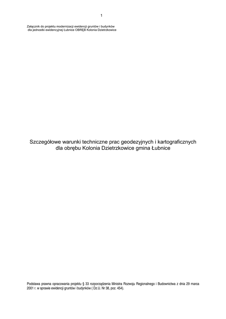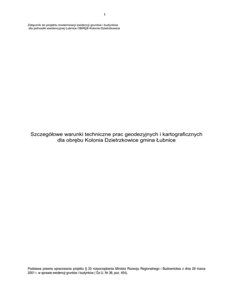1 Załącznik do projektu modernizacji ewidencji gruntów i budynków dla jednostki ewidencyjnej Łubnice OBRĘB Kolonia Dzietrzkowice Szczegółowe warunki techniczne prac geodezyjnych i kartograficznych dla obrębu Kolonia Dzietrzkowice gmina Łubnice Podstawa prawna opracowania projektu § 33 rozporządzenia Ministra Rozwoju Regionalnego i Budownictwa z dnia 29 marca 2001 r. w sprawie ewidencji gruntów i budynków ( Dz.U. Nr 38, poz. 454). 2 Załącznik do projektu modernizacji ewidencji gruntów i budynków dla jednostki ewidencyjnej Łubnice OBRĘB Kolonia Dzietrzkowice I. Ogólne wymagania techniczne wykonania prac 1. 2. 3. 4. 5. 6. 7. 8. 9. 10. 11. 12. 13. 14. 15. Wykonawca przeprowadzi prace w sposób zgodny z przepisami rozporządzenia Ministra Rozwoju Regionalnego i Budownictwa z dnia 29 marca 2001 r. w sprawie ewidencji gruntów i budynków (Dz. U. Nr 38, poz. 454) zwanym dalej rozporządzeniem, innymi obowiązującymi przepisami, instrukcjami technicznymi i wytycznymi technicznymi, oraz postanowieniami niniejszych Warunków Technicznych. Podanie do publicznej wiadomości informacji o rozpoczęciu prac geodezyjnych związanych z modernizacją ewidencji gruntów i budynków. Przeprowadzenie niezbędnych modyfikacji istniejących danych ewidencyjnych do wymagań określonych w rozporządzeniu. Zebranie informacji do baz danych ewidencyjnych pozwalających na utworzenie podstawowych raportów, o których mowa w § 22 rozporządzenia tj. rejestr gruntów, rejestr budynków, rejestr lokali, kartoteka budynków, kartoteka lokali. Utworzenie operatu ewidencyjnego, który zgodnie z § 20 rozporządzenia składa się z części geodezyjno-prawnej i opisowo-kartograficznej. Kontrola techniczna operatu ewidencyjnego przez Ośrodek Dokumentacji Geodezyjnej i Kartograficznej w Wieruszowie. Wyłożenie operatu opisowo-kartograficznego do wglądu osób fizycznych, osób prawnych i jednostek organizacyjnych nieposiadających osobowości prawnej, rozpatrzenie uwag przy udziale pracownika Starostwa Powiatowego w Wieruszowie posiadającego uprawnienia, o których mowa a art. 43 pkt 2 ustawy Prawo geodezyjne i kartograficzne do danych ewidencyjnych przedstawionych w projekcie operatu opisowo - kartograficznego oraz poinformowanie zgłaszającego uwagi o sposobie rozpatrzenia uwag. Operat ewidencyjny, składający się z części geodezyjno - prawnej oraz opisowo - kartograficznej, Wykonawca jest zobowiązany skompletować zgodnie z obowiązującymi przepisami. Przyjęcie operatu do ewidencji gruntów i budynków i jego wdrożenie Obiekty przestrzenne wektorowej mapy ewidencyjnej przedstawione zostaną w układzie „2000" w odpowiednich pasach odwzorowania. Powiat wieruszowski przyporządkowany jest do strefy „6” i pasa odwzorowania nr „18”. Efektem końcowym wykonania umowy są pliki w formacie programu EWMAPA dla części kartograficznej oraz EWOPIS dla części opisowej, zawierające dane ewidencyjne o, których mowa w §22 rozporządzenia oraz pliki w formacie SWDE. Do opracowania zostaną wykorzystane wszystkie materiały geodezyjne i kartograficzne wydane Wykonawcy przez Ośrodek Dokumentacji Geodezyjnej i Kartograficznej w Wieruszowie. Wymagania dotyczące topologii obiektów obszarowych ewidencji gruntów i budynków zostaną sprawdzone przez programy komputerowe udostępnione przez GUGiK i stanowić będą podstawę weryfikacji rezultatów prac wykonanych przez Wykonawcę w ramach niniejszego zamówienia. Wykonawca zapewni ładowanie danych do systemu EWOPIS w celu uruchamiania obsługi bazy danych ewidencyjnych (§ 43 punkt 3 rozporządzenia). Opisane wyżej przenoszenie danych Wykonawca przeprowadzi niezwłocznie po ogłoszeniu projektu w dzienniku urzędowym województwa, w terminie niezależnym od terminu obowiązywania umowy na wykonanie przedmiotowych prac. Wszelkie wątpliwości wykonawca uzgadnia w PODGiK 3 Załącznik do projektu modernizacji ewidencji gruntów i budynków dla jednostki ewidencyjnej Łubnice OBRĘB Kolonia Dzietrzkowice Szczegółowe wymagania techniczne dotyczące gruntów 1. Wektorowa mapa ewidencyjna w swej treści powinna zawierać następujące elementy: 1) granice: państwa, jednostek zasadniczego trójstopniowego podziału terytorialnego państwa, jednostek ewidencyjnych, obrębów ewidencyjnych, działek ewidencyjnych 2) numery działek ewidencyjnych 3) oznaczenia punktów granicznych, z wyróżnieniem punktów, których położenie określone zostało w trybie i z dokładnością określoną w rozporządzeniu, a spośród nich - punktów trwale stabilizowanych w terenie, jeżeli materiały wyjściowe zawierają odpowiednie informacje w tym zakresie, 4) oznaczenie punktów podstawowej i szczegółowej poziomej osnowy geodezyjnej, z podaniem ich numerów 5) kontury użytków gruntowych i ich oznaczenia, 6) kontury klas gleboznawczych i ich oznaczenia, 7) kontury budynków, 8) dane opisowo-informacyjne: • nazwy jednostek zasadniczego trójstopniowego podziału terytorialnego państwa, • oznaczenie jednostek i obrębów ewidencyjnych, nazwy ulic, placów, cieków, zbiorników wodnych i innych obiektów fizjograficznych, oznaczenia dróg publicznych nadane na podstawie przepisów o drogach publicznych, • numery porządkowe nieruchomości, • numery ewidencyjne budynków. 2. Dane dotyczące przebiegu granic działek ewidencyjnych pozyskuje się według następujących zasad: 1) Jako generalną zasadę przyjmuje się, że wykorzystuje się współrzędne punktów granicznych istniejące już w bazie numerycznej. Punktom granicznym, o których mowa wyżej zostały przypisane atrybuty, określone w ust. 29 - 31 oraz w ust. 33 aneksu nr 2 do Instrukcji G-5 przez wykonawcę projektu, o którym mowa w projekcie modernizacji ewidencji gruntów i budynków tj. PHARE 2003 „ Zintegrowany System Katastralny – faza III – Konwersja i dostosowanie powiatowych baz danych ewidencji gruntów i budynków do wymagań zintegrowanego Systemu Katastralnego or