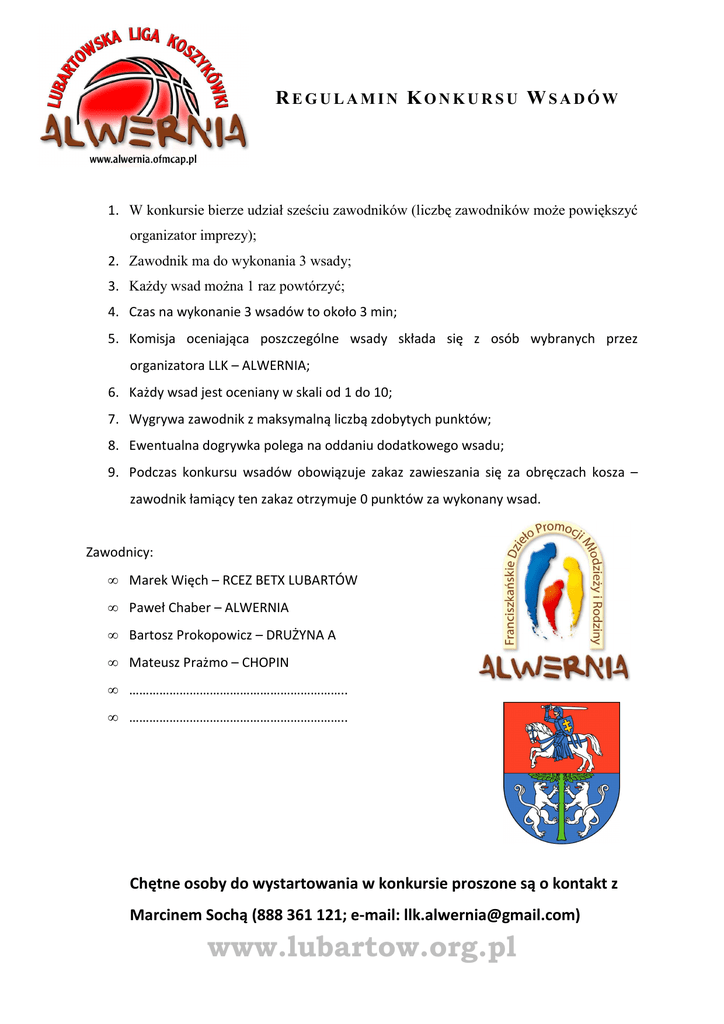 REGULAMIN KONKURSU WSADÓW 1. W konkursie bierze udział sześciu zawodników (liczbę zawodników może powiększyć organizator imprezy); 2. Zawodnik ma do wykonania 3 wsady; 3. Każdy wsad można 1 raz powtórzyć; 4. Czas na wykonanie 3 wsadów to około 3 min; 5. Komisja oceniająca poszczególne wsady składa się z osób wybranych przez organizatora LLK – ALWERNIA; 6. Każdy wsad jest oceniany w skali od 1 do 10; 7. Wygrywa zawodnik z maksymalną liczbą zdobytych punktów; 8. Ewentualna dogrywka polega na oddaniu dodatkowego wsadu; 9. Podczas konkursu wsadów obowiązuje zakaz zawieszania się za obręczach kosza – zawodnik łamiący ten zakaz otrzymuje 0 punktów za wykonany wsad. Zawodnicy: • Marek Więch – RCEZ BETX LUBARTÓW • Paweł Chaber – ALWERNIA • Bartosz Prokopowicz – DRUŻYNA A • Mateusz Prażmo – CHOPIN • ……………………………………………………….. • ……………………………………………………….. Chętne osoby do wystartowania w konkursie proszone są o kontakt z Marcinem Sochą (888 361 121; e-mail: [email protected]) www.lubartow.org.pl