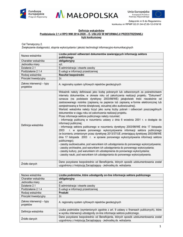 Załącznik nr 8 do Regulaminu konkursu nr RPMP.02.01.04-IZ.00-12-019/16 Definicje wskaźników Poddziałanie 2.1.4 RPO WM 2014-2020 – E- USŁUGI W INFORMACJI PRZESTRZENNEJ tryb konkursowy Cel Tematyczny 2. Zwiększenie dostępności, stopnia wykorzystania i jakości technologii informacyjno-komunikacyjnych Nazwa wskaźnika Charakter wskaźnika Jednostka miary Działanie 2.1 Poddziałanie 2.1.4 Rodzaj wskaźnika Priorytet Inwestycyjny Zakres interwencji – typy projektów Definicja wskaźnika Liczba pobrań/ odtworzeń dokumentów zawierających informację sektora publicznego obligatoryjny szt. E-administracja i otwarte zasoby E-usługi w informacji przestrzennej Rezultat bezpośredni 2c A. regionalny system cyfrowych rejestrów geodezyjnych Wskaźnik należy definiować jako liczbę pobranych lub odtworzonych za pośrednictwem internetu dokumentów, w okresie roku od zakończenia realizacji projektu. "Dokument" oznacza (na podstawie dyrektywy 2003/98/WE) jakąkolwiek treść niezależnie od zastosowanego nośnika (zapisaną na papierze lub zapisaną w formie elektronicznej lub zarejestrowaną w formie dźwiękowej, wizualnej albo audiowizualnej). Wartość wskaźnika należy liczyć jako sumę liczby pobrań i odtworzeń poszczególnych dokumentów w ciągu roku od zakończenia realizacji projektu. Przez informacje sektora publicznego należy rozumieć: - informację publiczną w rozumieniu ustawy z dnia 6 września 2001 r. o dostępie do informacji publicznej; - informację sektora publicznego w rozumieniu dyrektywy 2003/98/WE dnia 17 listopada 2003 r. w sprawie ponownego wykorzystywania informacji sektora publicznego (w brzmieniu zmienionym przez dyrektywę 2013/37/UE zmieniającą dyrektywę 2003/98/WE dnia 17 listopada 2003 r. w sprawie ponownego wykorzystywania informacji sektora publicznego); - zasoby audiowizualne, pod warunkiem ich udostępniania do ponownego wykorzystywania; - zasoby archiwalne, pod warunkiem ich udostępnienia do ponownego wykorzystania; - zasoby kultury, pod warunkiem ich udostepnienia do ponownego wykorzystania; - zasoby nauki, pod warunkiem ich udostępniania do ponownego wykorzystywania. Źródło danych Dane pozyskane bezpośrednio od Beneficjenta, których sposób udokumentowania został uzgodniony z Instytucją Zarządzającą - Jednostką ds. wdrażania. Nazwa wskaźnika Charakter wskaźnika Jednostka miary Działanie 2.1 Poddziałanie 2.1.4 Rodzaj wskaźnika Priorytet Inwestycyjny Liczba podmiotów, które udostępniły on-line informacje sektora publicznego obligatoryjny szt. E-administracja i otwarte zasoby E-usługi w informacji przestrzennej Produkt 2c Zakres interwencji – typy projektów A. regionalny system cyfrowych rejestrów geodezyjnych Definicja wskaźnika Źródło danych Liczba podmiotów (wymienionych zgodnie z art. 9 ustawy o finansach publicznych), które w wyniku interwencji udostępniły on-line informacje sektora publicznego. Dane pozyskane bezpośrednio od Beneficjenta, których sposób udokumentowania został uzgodniony z Instytucją Zarządzającą - Jednostką ds. wdrażania. 1 Nazwa wskaźnika Charakter wskaźnika Jednostka miary Działanie 2.1 Poddziałanie 2.1.4 Rodzaj wskaźnika Priorytet Inwestycyjny Liczba udostępnianych usług wewnątrzadministracyjnych (A2A) obligatoryjny szt. E-administracja i otwarte zasoby E-usługi w informacji przestrzennej Produkt 2c Zakres interwencji – typy projektów A. regionalny system cyfrowych rejestrów geodezyjnych Definicja wskaźnika Źródło danych Nazwa wskaźnika Charakter wskaźnika Jednostka miary Działanie 2.1 Poddziałanie 2.1.4 Rodzaj wskaźnika Priorytet Inwestycyjny Zakres interwencji – typy projektów Definicja wskaźnika Źródło danych Liczba usług elektronicznie udostępnionych przez organ administracji publicznej innemu organowi administracji, umożliwiających realizację części jego zadań drogą elektroniczną. Celem wsparcia jest poszerzenie zakresu spraw, które obywatele i przedsiębiorcy mogą załatwić drogą elektroniczną. Bezpośrednio będzie się to odbywać poprzez elektronizację nowych usług publicznych oraz poprawę funkcjonalności oraz e-dojrzałości usług istniejących, a pośrednio – poprzez usprawnianie usług wewnątrzadministracyjnych (A2A), niezbędnych dla świadczenia usług publicznych. A2A Administration to administration (ang.) – usługi administracji dla administracji. Dane pozyskane bezpośrednio od Beneficjenta, których sposób udokumentowania został uzgodniony z Instytucją Zarządzającą - Jednostką ds. wdrażania. Liczba usług publicznych udostępnionych on-line o stopniu dojrzałości 3 – dwustronna interakcja obligatoryjny szt. E-administracja i otwarte zasoby E-usługi w informacji przestrzennej Produkt 2c A. regionalny system cyfrowych rejestrów geodezyjnych Liczba usług publicznych udostępnionych on-line o stopniu dojrzałości 3 – dwustronna interakcja, w wyniku realizowanego projektu. Usługa on-line o stopniu dojrzałości 3 umożliwia transfer danych w dwóch kierunkach: od usługodawcy do klienta oraz od klienta do usługodawcy. Typowym sposobem jej realizacji jest pobranie, wypełnienie i odesłanie formularza drogą elektroniczną. Usługi powyższe obejmują m.in. usługi powstałe w ramach digitalizacji map, GIS. W ramach wskaźnika należy ujmować usługi: nowe lub istotnie udoskonalone, skierowane do klientów spoza administracji publicznej: obywateli (usługi A2C, Administration to Customer) i/lub przedsiębiorców (A2B, Administration to Business). Powyższe warunki należy traktować łącznie. Należy zliczyć udostępnione on-line usługi o stopniu dojrzałości 3, których wykonanie bez wykorzystania technologii informacyjnej jest niemożliwe w formie ogólnodostępnych serwisów informacyjnych. Nie należy wliczać usług udostępnionych on-line o stopniu dojrzałości 4 i 5. W przypadku, gdy projekt dotyczy kilku podmiotów nie należy liczyć tych samych usług tyle razy, ile