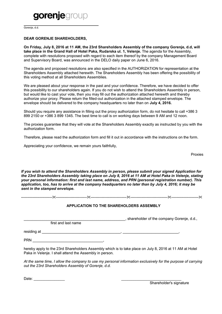 DEAR GORENJE SHAREHOLDERS, On Friday, July 8, 2016 at 11