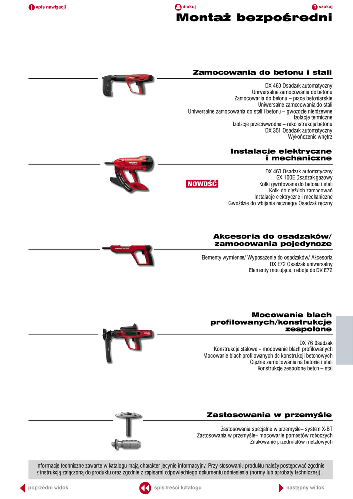 opis nawigacji drukuj ? szukaj Montaż bezpośredni Zamocowania do betonu i stali DX 460 Osadzak automatyczny Uniwersalne zamocowania do betonu Zamocowania do betonu – prace betoniarskie Uniwersalne zamocowania do stali Uniwersalne zamocowania do stali i betonu – gwoździe nierdzewne Izolacje termiczne Izolacje przeciwwodne – rekonstrukcja betonu DX 351 Osadzak automatyczny Wykończenie wnętrz Instalacje elektryczne i mechaniczne DX 460 Osadzak automatyczny GX 100E Osadzak gazowy Kołki gwintowane do betonu i stali Kołki do ciężkich zamocowań Instalacje elektryczne i mechaniczne Gwoździe do wbijania ręcznego/ Osadzak ręczny Akcesoria do osadzaków/ zamocowania pojedyncze Elementy wymienne/ Wyposażenie do osadzaków/ Akcesoria DX E72 Osadzak uniwersalny Elementy mocujące, naboje do DX E72 Mocowanie blach profilowanych/konstrukcje zespolone DX 76 Osadzak Konstrukcje stalowe – mocowanie blach profilowanych Mocowanie blach profilowanych do konstrukcji betonowych Ciężkie zamocowania na betonie i stali Konstrukcje zespolone beton – stal Zastosowania w przemyśle Zastosowania specjalne w przemyśle– system X-BT Zastosowania w przemyśle– mocowanie pomostów roboczych Znakowanie przedmiotów metalowych Informacje techniczne zawarte w katalogu mają charakter jedynie informacyjny. Przy stosowaniu produktu należy postępować zgodnie z instrukcją załączoną do produktu oraz zgodnie z zapisami odpowiedniego dokumentu odniesienia (normy lub aprobaty technicznej). poprzedni widok spis treści katalogu następny widok ? drukuj opis nawigacji szukaj Zamocowania do stali i betonu DX 460 Uniwersalny osadzak automatyczny z magazynkiem Zastosowania Uniwersalne, seryjne zamocowania na betonie i stali gwoździami magazynkowanymi o długości do 72 mm. Zabezpieczanie szalunków budowlanych, ograniczniki szalunkowe. Mocowanie węży iniekcyjnych przy pracach szalunkowych. Mocowanie sztywnych i elastycznych rurek instalacyjnych. Mocowanie profili konstrukcji ścianek działowych. Dane techniczne Ciężar: Długość: Szerokość: Wysokość: Siła docisku: Naboje: 3,51 kg 475 mm 72 mm 180 mm min. 208 N 6,8/11 M w magazynkach po 10 szt. Zalety Duża szybkość pracy: do 700 osadzeń na godzinę. Uniwersalność: możliwość wykonania wielu różnorodnych zamocowań. Automatyczne repetowanie osadzaka. Bezstopniowa regulacja mocy osadzaka. Produkt Nr artykułu DX 460 MX72 Uniwersalny osadzak* 371673 Wyposażenie standardowe: magazynek MX72, tłok X-460-P8, pierścień oporowy, akcesoria do konserwacji, okulary ochronne, ochraniacz słuchu, instrukcja obsługi w języku polskim. Osadzak w walizce z tworzywa odpornego na uderzenia. Pełna oferta serwisowa Hilti * Osadzak jest również dostępny bez pakietu „Serwis na całe życie”, lecz z dożywotnią gwarancją producenta. O szczegóły prosimy zapytać przedstawiciela Hilti. Akcesoria Magazynek Produkt MX72 Magazynek X-460-F8 Prowadnica kołka (standard) X-460-P8 Tłok (standard) (gwoździe i kołki M6 i M8) X-460-B Pierścień oporowy X-460-WH23/36 Uchwyt do podkładek ∅23/36 mm* Prowadnica kołka Nr artykułu 370844 304529 373297 373330 373331 * Zastosowanie z magazynkiem i gwoździami magazynkowanymi. Pierścień Uchwyt do podkładek Tłok Konserwacja i sprawdzenie osadzaka Konserwacja i sprawdzenie osadzaka DX 460 MX 72 Obejmuje czyszczenie/sprawdzenie funkcjonowania osadzaka/wymianę elementów zużywających się (tłok i pierścień oporowy)/bezpłatny odbiór i dostawę. Gwoździe i naboje Kołki gwintowane na stronach poprzedni widok spis treści katalogu spis treści działu następny widok ? drukuj opis nawigacji szukaj Zamocowania do stali i betonu Zamocowania do elementów betonowych* X-DNI MX Gwoździe magazynkowane Średnica trzpienia 3,7 mm. Wysokość łba 2 mm. Mocowanie na betonie do 40 N/mm2, na stali do 450 N/mm2. Pakowane po 100 sztuk. Magazynkowane po 10 sztuk. Do osadzaków z magazynkiem gwoździ1). Dł. trzpienia (mm) 19 22 27 32 37 42 47 52 57 62 72 DX 351 Zastosowanie w: DX 36 M DX A40 DX 460 Artykuł X-DNI 19 MX X-DNI 22 MX X-DNI 27 MX X-DNI 32 MX X-DNI 37 MX X-DNI 42 MX X-DNI 47 MX X-DNI 52 MX X-DNI 57 MX X-DNI 62 MX X-DNI 72 MX Nr artykułu 34370 34372 34377 34378 34379 34380 34382 34384 34385 34386 34545 W przypadku użycia DX 36M, do gwoździ o dł. 19-32 mm niezbędny magazynek MX 32, powyżej dł. 32 mm magazynek MX 62. 1) AT-0602-0102/2006 X-DNI Gwoździe pojedyncze Do osadzaków z zamontowaną prowadnicą kołka zamiast magazynka. Dł. trzpienia (mm) 22 27 32 37 42 47 52 57 62 72 DX 351 Zastosowanie w: DX 36 M DX A40 DX 460 Artykuł X-DNI 22 P8 X-DNI 27 P8 X-DNI 32 P8 X-DNI 37 P8 X-DNI 42 P8 X-DNI 47 P8 X-DNI 52 P8 X-DNI 57 P8 X-DNI 62 P8 X-DNI 72 P8 Nr artykułu 34351 34352 34353 34354 34355 34357 34360 34361 34363 34364 X-DNI... S12/ S15/ S36 Gwoździe z podkładką stalową Średnica trzpienia 3,7 mm. Wysokość łba 2 mm. Mocowanie na betonie do 40 N/mm2, na stali do 450 N/mm2. Pakowane po 100 sztuk. Z podkładką stalową ∅12 mm (oznaczenie S12) Produkt Zastosowanie w: DX A40 DX 460 Prowadnica Tłok Prowadnica Tłok Tłok Dł. trzpienia (mm) 22 27 32 37 42 DX 450 Artykuł Nr artykułu X-462-F8 S12 X-462-P8 X-460-F8 S12 X-460-P8 45/DNI 376213 376222 373317 373297 241462 Zastosowanie w: DX A40 DX 460 DX 450 Artykuł Nr artykułu X-DNI 22 S12 X-DNI 27 S12 X-DNI 32 S12 X-DNI 37 S12 X-DNI 42 S12 244639 244640 244641 244642 244643 Z podkładką stalową ∅15 mm (oznaczenie S15) lub kwadratową o przekątnej 36 mm (oznaczenie S36). Do osadzaków z prowadnicą kołka (standard). Dł. trzpienia (mm) 32 32 Zastosowanie w: DX 36 M DX A40 DX 460 Artykuł X-DNI 32 P8 S15 X-DNI 32 P8 S36 Nr artykułu 34398 34549 *Także do zamocowań na stali o grubości 4-6 mm. poprzedni widok spis treści katalogu spis treści działu następny widok ? drukuj opis nawigacji szukaj Zamocowania do stali i betonu Zamocowania do elementów betonowych* X-ZF Gwoździe magazynkowane Średnica trzpienia 3,5 mm. Wysokoś
