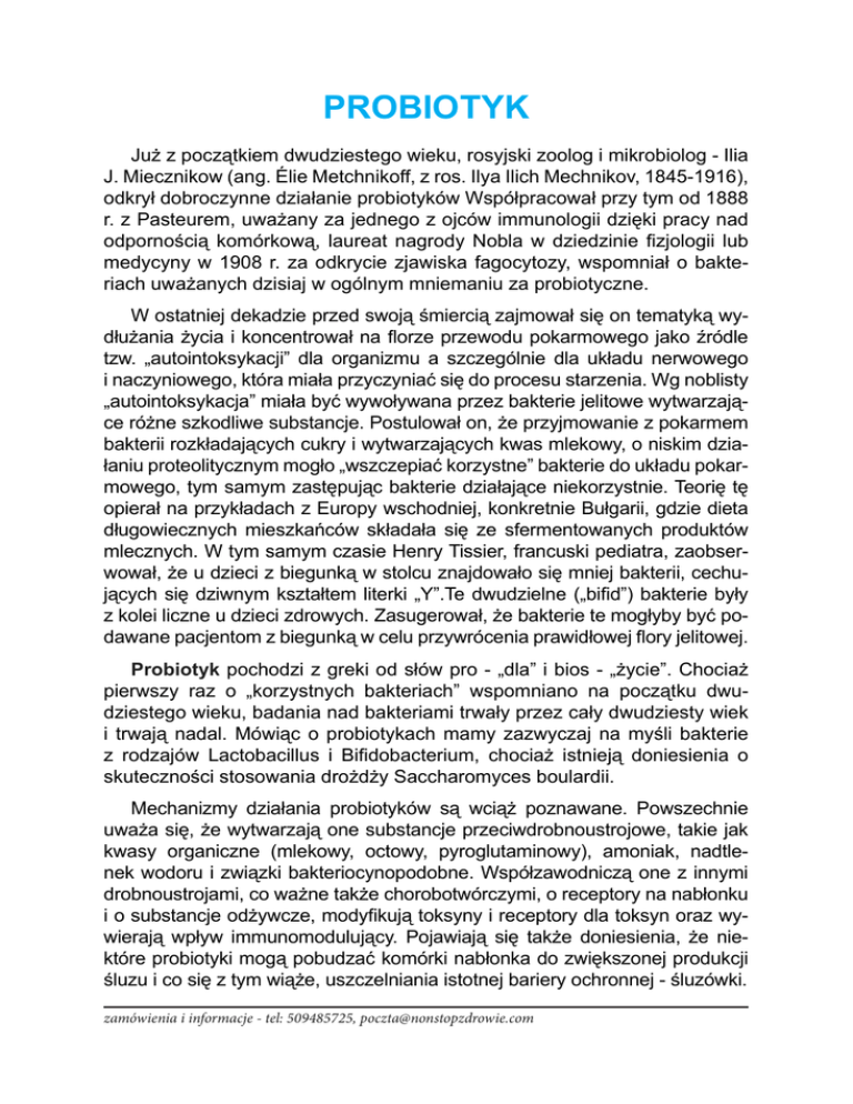 PROBIOTYK Już z początkiem dwudziestego wieku, rosyjski zoolog i mikrobiolog - Ilia J. Miecznikow (ang. Élie Metchnikoff, z ros. Ilya Ilich Mechnikov, 1845-1916), odkrył dobroczynne działanie probiotyków Współpracował przy tym od 1888 r. z Pasteurem, uważany za jednego z ojców immunologii dzięki pracy nad odpornością komórkową, laureat nagrody Nobla w dziedzinie fizjologii lub medycyny w 1908 r. za odkrycie zjawiska fagocytozy, wspomniał o bakteriach uważanych dzisiaj w ogólnym mniemaniu za probiotyczne. W ostatniej dekadzie przed swoją śmiercią zajmował się on tematyką wydłużania życia i koncentrował na florze przewodu pokarmowego jako źródle tzw. „autointoksykacji” dla organizmu a szczególnie dla układu nerwowego i naczyniowego, która miała przyczyniać się do procesu starzenia. Wg noblisty „autointoksykacja” miała być wywoływana przez bakterie jelitowe wytwarzające różne szkodliwe substancje. Postulował on, że przyjmowanie z pokarmem bakterii rozkładających cukry i wytwarzających kwas mlekowy, o niskim działaniu proteolitycznym mogło „wszczepiać korzystne” bakterie do układu pokarmowego, tym samym zastępując bakterie działające niekorzystnie. Teorię tę opierał na przykładach z Europy wschodniej, konkretnie Bułgarii, gdzie dieta długowiecznych mieszkańców składała się ze sfermentowanych produktów mlecznych. W tym samym czasie Henry Tissier, francuski pediatra, zaobserwował, że u dzieci z biegunką w stolcu znajdowało się mniej bakterii, cechujących się dziwnym kształtem literki „Y”.Te dwudzielne („bifid”) bakterie były z kolei liczne u dzieci zdrowych. Zasugerował, że bakterie te mogłyby być podawane pacjentom z biegunką w celu przywrócenia prawidłowej flory jelitowej. Probiotyk pochodzi z greki od słów pro - „dla” i bios - „życie”. Chociaż pierwszy raz o „korzystnych bakteriach” wspomniano na początku dwudziestego wieku, badania nad bakteriami trwały przez cały dwudziesty wiek i trwają nadal. Mówiąc o probiotykach mamy zazwyczaj na myśli bakterie z rodzajów Lactobacillus i Bifidobacterium, chociaż istnieją doniesienia o skuteczności stosowania drożdży Saccharomyces boulardii. Mechanizmy działania probiotyków są wciąż poznawane. Powszechnie uważa się, że wytwarzają one substancje przeciwdrobnoustrojowe, takie jak kwasy organiczne (mlekowy, octowy, pyroglutaminowy), amoniak, nadtlenek wodoru i związki bakteriocynopodobne. Współzawodniczą one z innymi drobnoustrojami, co ważne także chorobotwórczymi, o receptory na nabłonku i o substancje odżywcze, modyfikują toksyny i receptory dla toksyn oraz wywierają wpływ immunomodulujący. Pojawiają się także doniesienia, że niektóre probiotyki mogą pobudzać komórki nabłonka do zwiększonej produkcji śluzu i co się z tym wiąże, uszczelniania istotnej bariery ochronnej - śluzówki. zamówienia i informacje - tel: 509485725, [email protected] Trwają badania nad wpływem tych bakterii na apoptazę, czyli zaprogramowaną śmierć komórek zarówno układu odpornościowego jak i epidermalnych. Kolejnym polem badawczym mogą być badania nad wysyłanymi przez bakterie probiotyczne sygnałami hamującymi uwalnianie lub modyfikującymi mechanizmy zjadliwości bakterii. Od tego czasu co roku probiotyki są wszechstronnie badane. W samym tylko roku 2007 przeprowadzono prawie 800 niezależnych badań które potwierdzaja skuteczność dziania probiotyku na takich polach jak • • • • • • • • • • • • Zdrowe jelita i przyswajalność pokarmów Odporność organizmu Odchudzanie Nowotwory Zaburzenia skórne Drożdżaki Nietolerancja laktozy Cholesterol Pomocny w oczyszczaniu jelit Zaburzenia układu moczowo płciowego Powikłania poantybiotykowe I wiele innych Probiotic12 wspomaga tarczę obronną organizmu. Probiotic12 działa w „centrali” układu immunologicznego – w jelicie. Tam bakterie probiotyczne regulują układem odpornościowym. Probiotic12 to długoterminowy i codzienny towarzysz dla zdrowia i dobrego samopoczucia. W skład Probiotic12 wchodzi 12 różnych szczepów bakterii. W każdej kapsułce jest ich ponad 1 miliard Bakterie : Bifidobacterium longum, B. breve,B. bifidum, B. infantis,B. lactis, Lactobacillus plantarum, L.casei, L. paracasei, L. rhamnosus, L. acidophilus, L. bulgaricus, Streptococcus thermophilus),maltodekstryna, Szczegóły i zamówienia: mobile: +48 509 485 725 www.nonstopzdrowie.com [email protected]