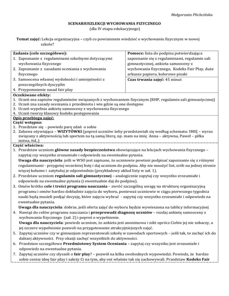 Małgorzata Plichcińska SCENARIUSZLEKCJI WYCHOWANIA FIZYCZNEGO (dla IV etapu edukacyjnego) Temat zajęć: Lekcja organizacyjna – czyli co powinienem wiedzieć o wychowaniu fizycznym w nowej szkole? Zadania (cele szczegółowe): Pomoce: lista do podpisu potwierdzająca 1. Zapoznanie z regulaminami szkolnymi dotyczącymi zapoznanie się z regulaminami, regulamin sali gimnastycznej, ankieta samooceny z wychowania fizycznego 2. Zapoznanie z zasadami oceniania z wychowania wychowania fizycznego, Kodeks Fair Play, duże fizycznego arkusze papieru, kolorowe pisaki 3. Samoocena własnej wydolności i umiejętności z Czas trwania zajęć: 45 minut poszczególnych dyscyplin 4. Przypomnienie zasad fair play Oczekiwane efekty: 1. Uczeń zna zapisów regulaminów związanych z wychowaniem fizycznym (BHP, regulamin sali gimnastycznej) 2. Uczeń zna zasady oceniania z przedmiotu i wie gdzie są one dostępne 3. Uczeń wypełnia ankietę samooceny z wychowania fizycznego 4. Uczeń tworzy klasowy kodeks postępowania Opis przebiegu zajęć: Część wstępna: 1. Przedstaw się - powiedz parę zdań o sobie 2. Zabawa ożywiająca – WIZYTÓWKI (poproś uczniów żeby przedstawiali się według schematu: IMIĘ – wyraz związany z aktywnością lub sportem na tą samą literę, np. mam na imię Anna – aktywna, Paweł – piłka nożna, itd.,) Część właściwa: 1. Przedstaw uczniom główne zasady bezpieczeństwa obowiązujące na lekcjach wychowania fizycznego – zapytaj czy wszystko zrozumiałe i odpowiedz na ewentualne pytania. Uwaga dla nauczyciela: jeśli w WSO jest zapisane, że uczniowie powinni podpisać zapoznanie się z różnymi regulaminami - przygotuj wcześniej listę i daj uczniom do podpisu. Aby nie mnożyć list, zrób na jednej stronie więcej kolumn i zatytułuj je odpowiednio (przykładowy układ listy w zał. 1). 2. Przedstaw uczniom regulamin sali gimnastycznej – analogicznie zapytaj czy wszystko zrozumiałe i odpowiedz na ewentualne pytania (i ewentualnie daj do podpisu). 3. Omów krótko cele i treści programu nauczania – zwróć szczególną uwagę na strukturę organizacyjną programu i omów bardzo dokładnie zajęcia do wyboru, ponieważ uczniowie w ciągu pierwszego tygodnia nauki będą musieli podjąć decyzję, które zajęcia wybrać - zapytaj czy wszystko zrozumiałe i odpowiedz na ewentualne pytania. Uwaga dla nauczyciela: dobrze, jeśli oferta zajęć do wyboru będzie wywieszona na tablicy informacyjnej 4. Nawiąż do celów programu nauczania i przeprowadź diagnozę uczniów – rozdaj ankietę samooceny z wychowania fizycznego (zał. 2) i poproś o wypełnienie. Uwaga dla nauczyciela: powiedz uczniom, że ankieta jest anonimowa i nikt oprócz Ciebie jej nie zobaczy, a jej szczere wypełnienie pozwoli na przygotowanie atrakcyjniejszych zajęć. 5. Zapytaj uczniów czy w gimnazjum reprezentowali szkołę w zawodach sportowych – jeśli tak, to zachęć ich do dalszej aktywności. Przy okazji zachęć wszystkich do aktywności. 6. Przedstaw szczegółowo Przedmiotowy System Oceniania – zapytaj czy wszystko jest zrozumiałe i odpowiedz na ewentualne pytania. 7. Zapytaj uczniów czy słyszeli o fair play? – pozwól na kilka swobodnych wypowiedzi. Powiedz, że bardzo sobie cenisz ideę fair play i zależy Ci na tym, aby oni właśnie tak się zachowywali. Przedstaw Kodeks Fair Małgorzata Plichcińska Play opracowany podczas Kongresu Fair Play przez Z.R Żukowskich (Zał. 3) i powiedz, że taki ogólny kodeks można uszczegółowić do określonego środowiska i właśnie teraz to zrobimy, bo dużo łatwiej jest stosować się do zasad wspólnie ustalonych niż narzuconych przez nauczyciela. 8. Podziel uczniów na trzy grupy dowolnym sposobem i rozdaj każdej grupie dużą kartkę papieru. Poproś, aby uczniowie w grupie zapisali zasady, które powinny obowiązywać podczas lekcji WF. Po kilku minutach jedna osoba z każdej grupy czyta pracę grupową. Po odczytaniu wszystkich propozycji wszyscy wspólnie decydują, które zapisy zostają w kodeksie klasowym, które znikają, a co dopisujemy Uwaga dla nauczyciela: ustalcie, że kodeks klasowy nie może liczyć więcej niż 10-12 punktów (nikt nie lubi jak jest za dużo zasad 9. Poproś jedną osobę (na pewno się taka znajdzie) o przepisanie kodeksu klasowego na komputerze. Poproś tę osobę o przesłanie pliku na maila lub przyniesienie na pendrivie do skopiowania (żeby zawsze można go było odtworzyć). Wydrukuj kodeks i miej go przy sobie podczas lekcji z klasą. Uwaga dla nauczyciela: jeżeli uczniowie chcą zalaminować kodeks lub oprawić np. w antyramę pozwól im na to, ale nie namawiaj ich do tego 10. Powiedz uczniom, gdzie znajduje się tablica informacyjna, na której będą wywieszane wszelkie informacje. Uwaga dla nauczyciela: dobrze, gdyby PSO też się tam znalazło. Część końcowa: 1. W podsumowaniu przypomnij, że każdego stać na najwyższą ocenę i wszystko zależy od nich samych 2. Pożegnaj klasę Załącznik 1 Przykładowy układ potwierdzenia… POTWIERDZENIE ZAPOZNANIA SIĘ Z REGULAMINAMI BHP nazwisko i imię ucznia regulamin sali gimnastycznej Przedmiotowy System Oceniania …………… …………… Małgorzata Plichcińska Załącznik 2 Ankieta samooceny z wychowania fizycznego Proszę o odpowiedź na poniższe pytania oraz o określenie swoich umiejętności z poszczególnych dyscyplin sportowych najczęściej pojawiających się na lekcjach wychowania fizycznego (na drugiej stronie).Twoja odpowiedź pozwoli na lepsze przygotowanie zajęć wychowania fizycznego. Ankieta jest anonimowa. 1. Czy – Twoim zdaniem – ćwiczenia fizyczne są potrzebne w życiu człowieka? TAK (dlaczego) ………………………………………………………………………………………………………. ………………………………………………………………………………………………………………………………. NIE (dlaczego)…