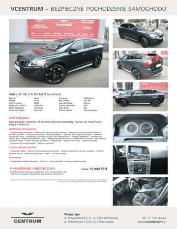 Volvo XC 60 2.4 D3 AWD Summum Marka: Model: Rok Produkcji: Pojemność silnika : Kolor Nadwozia: Skrzynia biegów: Volvo XC60 2009 2400 cm3 Grafitowy Automat Przebieg : Moc silnika : Kolor Wnętrza: Rodzaj nadwozia: Ilość drzwi: Rodzaj paliwa: 240000 km 163 KM Czarny SUV 4/5 Olej napędowy OPIS POJAZDU: Data pierwszej rejestracji: 25.06.2009 Dokument sprzedaży: Faktura Vat marża Salon: Belgia II Właściciel Dodatkowe Wyposażenie ✓20-calowe felgi aluminiowe ✓Elektrycznie otwierana klapa bagażnika ✓Elektrycznie sterowany fotel kierowcy z pamięcią ustawień ✓Elektrycznie sterowany hamulec postojowy ✓Elementy dekoracyjne aluminiowe ✓Kierownica wykończona skórą ✓Klimatyzacja automatyczna sterowana elektronicznie ✓Komputer pokładowy ✓Panoramiczny szklany dach ✓Podgrzewana przednia szyba ✓Podgrzewane przednie fotele ✓Reflektory Bi-Xenonowe ✓Spryskiwacze ciśnieniowe lamp ✓System nawigacji satelitarnej ✓Napęd AWD ✓Asystent Parkowania ✓Elektryczne szyby ✓Automatyczna skrzynia biegów ✓Skórzana tapicerka Systemy Bezpieczeństwa ✓System City Safety ✓System kontroli zjazdu ze wzniesienia ✓Poduszka powietrzna kierowcy i pasażera ✓Poduszki przednie boczne ✓Poduszki tylne boczne ✓ISOFIX ✓Centralny zamek Multimedia ✓Zestaw głośnomówiący Bluetooth ✓Radio CD ✓Złącze AUX/USB ✓Kierownica wielofunkcyjna FINANSOWANIE I UBEZPIECZENIA: Cena: 59 900 PLN Przykładowa rata miesięczna, wpłata 20%, okres leasingu/kredytu 48 miesięcy, 10% wykupu. Rata leasingu jest wartością netto bez vat. Niniejsza treść nie stanowi oferty w rozumieniu przepisów Kodeksu Cywilnego oraz opisu towaru ani zapewnienia w rozumieniu art. 4 Ustawy z dnia 27 lipca 2002r o szczególnych warunkach sprzedaży konsumenckiej. Powered by TCPDF (www.tcpdf.org)