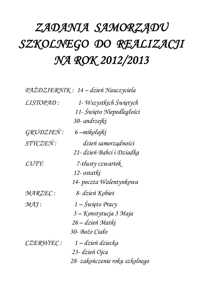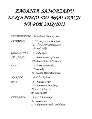 ZADANIA SAMORZĄDU SZKOLNEGO DO REALIZACJI NA ROK 2012/2013 PAŹDZIERNIK : 14 – dzień Nauczyciela LISTOPAD : 1- Wszystkich Świętych 11- Święto Niepodległości 30- andrzejki GRUDZIEŃ : 6 –mikołajki STYCZEŃ : dzień samorządności 21- dzień Babci i Dziadka LUTY: 7-tłusty czwartek 12- ostatki 14- poczta Walentynkowa MARZEC : 8- dzień Kobiet MAJ : 1 – Święto Pracy 3 – Konstytucja 3 Maja 26 – dzień Matki 30- Boże Ciało CZERWIEC : 1 – dzień dziecka 23- dzień Ojca 28- zakończenie roku szkolnego KONKURSY : Identyfikatorów Gazetek klasowych AKCJE : ,,Dzień bez jedynki’’ ,,hałas szkodzi zdrowiu ‘’ Wigilia klasowa (dekorowanie stołów, strojenie choinki, śpiewanie kolęd) Kolorowy dzień (w pierwszy czwartek miesiąca) Szczęśliwy numerek Dzień szaleństwa SEKCJA KULTURALNA : Julka Korzeniowska Ib Katarzyna Olejnik If Zuzanna Pytkowska Ib Bianka Dwernicka Id Magda Szczuka I Zuzanna Węgrzynowska IIe Gabrysia Łyżwińska Ie Paweł Sytkowski Ia SEKCJA REDAGOWANIA GAZETKI : Ola Szydlik IIa Sylwia Lasek IIa Anna Kozicka Ic Ala Kempa IId Kamila Horodeńska IId Julia Jagołkowska IIIc Katarzyna Rybak IIIc SEKCJA SPORTOWA: Kacper Raciborski IIIb Jakub Żychowicz IIIb Adrian Przywoźny Id Wiktor Kopczyński If SPRAWDZANIE IDENTYFIKATORÓW : Marta Krzanowska IIIe Magdalena Budzik IIIe SPRAWDZANIE GAZETEK KLASOWYCH : Natalia Walenda IIIa Gabriela Łyżwińska IIIa Paweł Sytkowski Ia RADA DZIELNICY : Natalia Walenda IIIa Radek Rasiński IIIa NASZE WSPANIAŁE OPIEKUNKI TO: p. Marta Kołakowska oraz p. Aleksandra Kania REGULAMIN KOLOROWEGO DNIA : 1. Raz w miesiącu samorząd może ogłosić ,,kolorowy dzień’’ 2. Kolorowy dzień określa barwę lub wzór ubioru 3. Uczeń, który się ubrał zgodnie z zaleceniami kolorowego dnia, ma prawo do : Bycia nieodpytywanym na wszystkich lekcjach Nie pisania niezapowiedzianych kartkówek 4. Zasada ,,kolorowego dnia’’ nie dotyczy: Prac klasowych i zapowiedzianych kartkówek Zapowiedzianych powtórzeń z materiału Tekstów źródłowych z historii Czytania ze zrozumieniem Prac domowych Aktywnej pracy na lekcji 5. Poza kolorem w ten dzień obowiązują zasady stroju uczniowskiego, określone w Regulaminie ucznia zatwierdzonego w Gimnazjum nr.44. BĘDZIE TO W PIERWSZY CZWARTEK KAŻDEGO MIESIĄCA . W TYM DNIU, KTO CHCE WZIĄĆ UDZIAŁ W ZABAWIE, UBIERA SIĘ NA OKREŚLONY KOLOR. JEŚLI KTOŚ NIE MA UBRAŃ W DANYM KOLORZE, MOŻE ZAŁOŻYĆ RÓŻNE DODATKI, NP. WSTĄŻKI, OPASKI, KRAWATY (NIE DOTYCZY NADRUKÓW ORAZ BARDZO DROBNYCH RZECZY MAŁO RZUCAJĄCYCH SIĘ W OCZY ) ZAPLANOWANE ,,KOLOROWE DNI’’ NA ROK 2012-2013 TO: Październik – zielony Listopad – pomarańczowy Grudzień – zielony Styczeń – niebieski Luty – różowy Marzec – w paski Kwiecień – w kratkę Maj – żółty Czerwiec – fioletowy