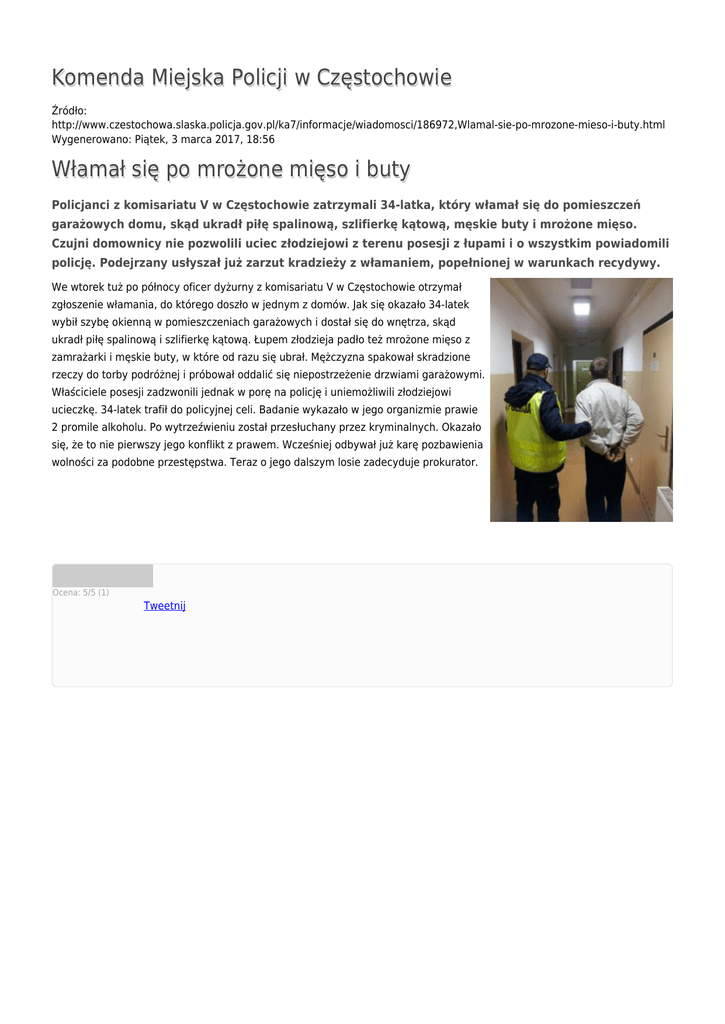 Komenda Miejska Policji w Częstochowie Źródło: http://www.czestochowa.slaska.policja.gov.pl/ka7/informacje/wiadomosci/186972,Wlamal-sie-po-mrozone-mieso-i-buty.html Wygenerowano: Piątek, 3 marca 2017, 18:56 Włamał się po mrożone mięso i buty Policjanci z komisariatu V w Częstochowie zatrzymali 34-latka, który włamał się do pomieszczeń garażowych domu, skąd ukradł piłę spalinową, szlifierkę kątową, męskie buty i mrożone mięso. Czujni domownicy nie pozwolili uciec złodziejowi z terenu posesji z łupami i o wszystkim powiadomili policję. Podejrzany usłyszał już zarzut kradzieży z włamaniem, popełnionej w warunkach recydywy. We wtorek tuż po północy oficer dyżurny z komisariatu V w Częstochowie otrzymał zgłoszenie włamania, do którego doszło w jednym z domów. Jak się okazało 34-latek wybił szybę okienną w pomieszczeniach garażowych i dostał się do wnętrza, skąd ukradł piłę spalinową i szlifierkę kątową. Łupem złodzieja padło też mrożone mięso z zamrażarki i męskie buty, w które od razu się ubrał. Mężczyzna spakował skradzione rzeczy do torby podróżnej i próbował oddalić się niepostrzeżenie drzwiami garażowymi. Właściciele posesji zadzwonili jednak w porę na policję i uniemożliwili złodziejowi ucieczkę. 34-latek trafił do policyjnej celi. Badanie wykazało w jego organizmie prawie 2 promile alkoholu. Po wytrzeźwieniu został przesłuchany przez kryminalnych. Okazało się, że to nie pierwszy jego konflikt z prawem. Wcześniej odbywał już karę pozbawienia wolności za podobne przestępstwa. Teraz o jego dalszym losie zadecyduje prokurator. Ocena: 5/5 (1) Tweetnij