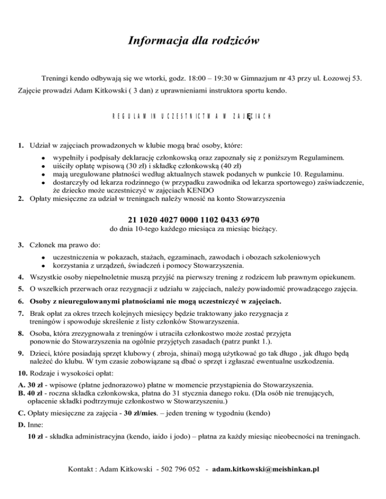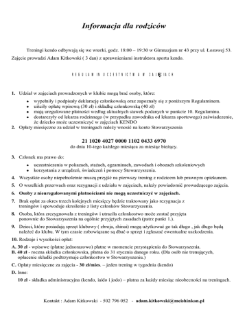 Informacja dla rodziców Treningi kendo odbywają się we wtorki, godz. 18:00 – 19:30 w Gimnazjum nr 43 przy ul. Łozowej 53. Zajęcie prowadzi Adam Kitkowski ( 3 dan) z uprawnieniami instruktora sportu kendo. REGULAMIN UCZESTNICTWA W ZAJĘCIACH 1. Udział w zajęciach prowadzonych w klubie mogą brać osoby, które: ● ● ● ● wypełniły i podpisały deklarację członkowską oraz zapoznały się z poniższym Regulaminem. uiściły opłatę wpisową (30 zł) i składkę członkowską (40 zł) mają uregulowane płatności według aktualnych stawek podanych w punkcie 10. Regulaminu. dostarczyły od lekarza rodzinnego (w przypadku zawodnika od lekarza sportowego) zaświadczenie, że dziecko może uczestniczyć w zajęciach KENDO 2. Opłaty miesięczne za udział w treningach należy wnosić na konto Stowarzyszenia 21 1020 4027 0000 1102 0433 6970 do dnia 10-tego każdego miesiąca za miesiąc bieżący. 3. Członek ma prawo do: ● ● uczestniczenia w pokazach, stażach, egzaminach, zawodach i obozach szkoleniowych korzystania z urządzeń, świadczeń i pomocy Stowarzyszenia. 4. Wszystkie osoby niepełnoletnie muszą przyjść na pierwszy trening z rodzicem lub prawnym opiekunem. 5. O wszelkich przerwach oraz rezygnacji z udziału w zajęciach, należy powiadomić prowadzącego zajęcia. 6. Osoby z nieuregulowanymi płatnościami nie mogą uczestniczyć w zajęciach. 7. Brak opłat za okres trzech kolejnych miesięcy będzie traktowany jako rezygnacja z treningów i spowoduje skreślenie z listy członków Stowarzyszenia. 8. Osoba, która zrezygnowała z treningów i utraciła członkostwo może zostać przyjęta ponownie do Stowarzyszenia na ogólnie przyjętych zasadach (patrz punkt 1.). 9. Dzieci, które posiadają sprzęt klubowy ( zbroja, shinai) mogą użytkować go tak długo , jak długo będą należeć do klubu. W tym czasie zobowiązane są dbać o sprzęt i zgłaszać ewentualne uszkodzenia. 10. Rodzaje i wysokości opłat: A. 30 zł - wpisowe (płatne jednorazowo) płatne w momencie przystąpienia do Stowarzyszenia. B. 40 zł - roczna składka członkowska, płatna do 31 stycznia danego roku. (Dla osób nie trenujących, opłacenie składki podtrzymuje członkostwo w Stowarzyszeniu.) C. Opłaty miesięczne za zajęcia - 30 zł/mies. – jeden trening w tygodniu (kendo) D. Inne: 10 zł - składka administracyjna (kendo, iaido i jodo) – płatna za każdy miesiąc nieobecności na treningach. Kontakt : Adam Kitkowski - 502 796 052 - [email protected]