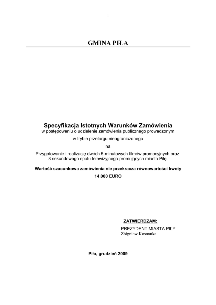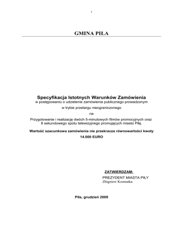1 GMINA PIŁA Specyfikacja Istotnych Warunków Zamówienia w postępowaniu o udzielenie zamówienia publicznego prowadzonym w trybie przetargu nieograniczonego na Przygotowanie i realizację dwóch 5-minutowych filmów promocyjnych oraz 8 sekundowego spotu telewizyjnego promujących miasto Piłę. Wartość szacunkowa zamówienia nie przekracza równowartości kwoty 14.000 EURO ZATWIERDZAM: PREZYDENT MIASTA PIŁY Zbigniew Kosmatka Piła, grudzień 2009 2 Spis treści Spis treści ............................................................................................................................................ 2 CZĘŚĆ I ................................................................................................................................................................. 4 POSTANOWIENIA OGÓLNE ........................................................................................................................... 4 1. 2. 3. 4. 5. 6. INFORMACJA O ZAMAWIAJĄCYM .......................................................................................................... 4 OSOBY UPRAWNIONE DO KONTAKTÓW Z WYKONAWCAMI .......................................................... 4 PODSTAWA PRAWNA ................................................................................................................................. 4 GENERALNE ZASADY UCZESTNICTWA W POSTĘPOWANIU ........................................................... 4 OFERTY WARIANTOWE, CZĘŚCIOWE ORAZ RÓWNOWAśNE ......................................................... 4 PISEMNOŚĆ POSTĘPOWANIA ................................................................................................................... 4 CZĘŚĆ II ............................................................................................................................................................... 5 PRZEDMIOT ZAMÓWIENIA I TERMIN JEGO REALIZACJI .................................................................. 5 1. 2. PRZEDMIOT ZAMÓWIENIA ....................................................................................................................... 5 TERMIN REALIZACJI ZAMÓWIENIA ....................................................................................................... 6 CZĘŚĆ III .............................................................................................................................................................. 6 WARUNKI ORAZ DOKUMENTY WYMAGANE OD WYKONAWCY ..................................................... 6 1. 2. 3. WARUNKI UDZIAŁU W POSTĘPOWANIU ............................................................................................... 6 DOKUMENTY WYMAGANE W POSTĘPOWANIU .................................................................................. 6 ZASADY SKŁADANIA OFERT WSPÓLNYCH PRZEZ PRZEDSIĘBIORCÓW ...................................... 7 CZĘŚĆ IV .............................................................................................................................................................. 7 OPIS SPOSOBU OBLICZANIA CENY OFERTY ........................................................................................... 7 CZĘŚĆ V ................................................................................................................................................................ 8 TRYB I ZASADY WYBORU NAJKORZYSTNIEJSZEJ OFERTY .............................................................. 8 1. 2. 3. TRYB OCENY OFERT ................................................................................................................................... 8 KRYTERIA OCENY OFERT ......................................................................................................................... 8 ZASADY OCENY OFERT WEDŁUG USTALONYCH KRYTERIÓW …...................................................9 CZĘŚĆ VI ...............................................................................................................................................................9 ZASADY PRZYGOTOWANIA OFERTY ......................................................................................................... 9 1. 2. 3. WYMOGI FORMALNE ..................................................................................................................................9 OPAKOWANIE OFERTY ............................................................................................................................ 10 KOSZT PRZYGOTOWANIA OFERTY ...................................................................................................... 10 CZĘŚĆ VII .......................................................................................................................................................... 11 INFORMACJE O TRYBIE SKŁADANIA I OTWARCIA OFERT ............................................................. 11 1. 2. 3. 4. 5. MIEJSCE I TERMIN SKŁADANIA OFERT ............................................................................................... 11 MIEJSCE I TERMIN OTWARCIA OFERT ................................................................................................ 11 PUBLICZNE OTWARCIE OFERT ............................................................................................................. 11 TERMIN ZWIĄZANIA OFERTĄ ............................................................................................................... 11 ZMIANA I WYCOFANIE OFERTY ........................................................................................................... 11 CZĘŚĆ VIII ........................................................................................................................................................ 11 ISTOTNE POSTANOWIENIA UMOWY ....................................................................................................... 11 1. 2. 3. TERMIN PŁATNOŚCI ............