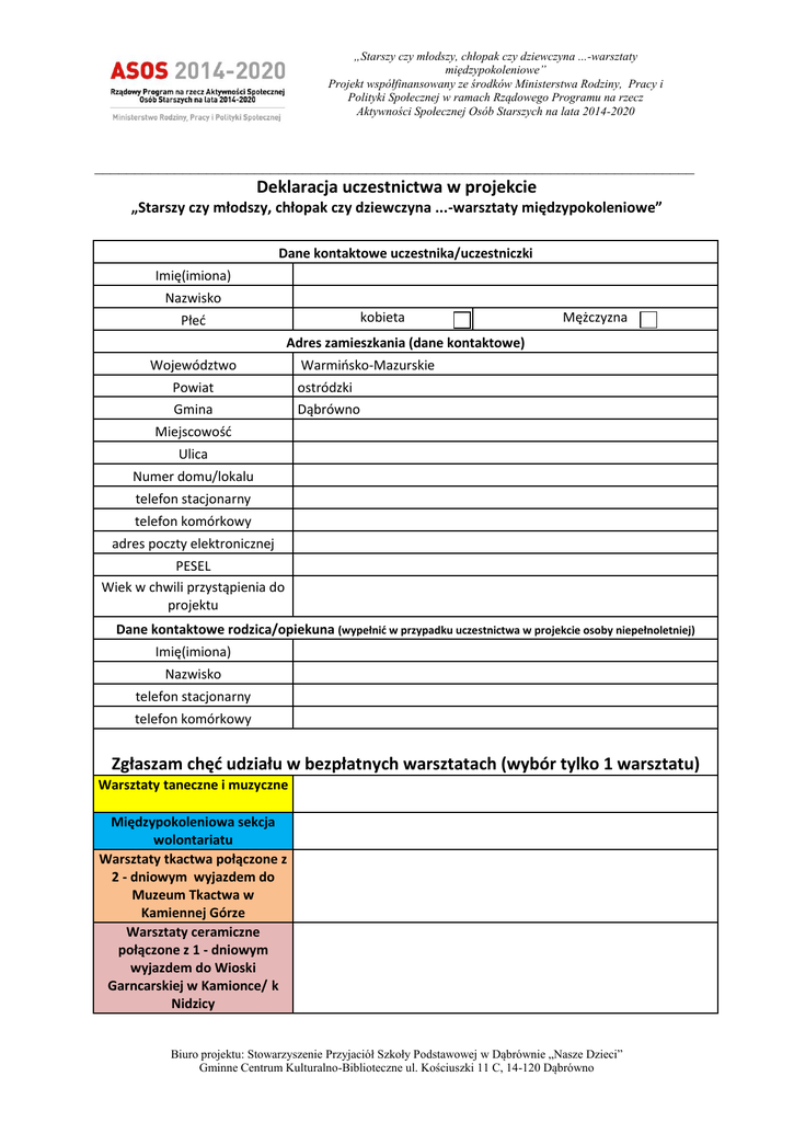 „Starszy czy młodszy, chłopak czy dziewczyna ...-warsztaty międzypokoleniowe” Projekt współfinansowany ze środków Ministerstwa Rodziny, Pracy i Polityki Społecznej w ramach Rządowego Programu na rzecz Aktywności Społecznej Osób Starszych na lata 2014-2020 ___________________________________________________________________________ Deklaracja uczestnictwa w projekcie „Starszy czy młodszy, chłopak czy dziewczyna ...-warsztaty międzypokoleniowe” Dane kontaktowe uczestnika/uczestniczki Imię(imiona) Nazwisko kobieta Płeć Mężczyzna Adres zamieszkania (dane kontaktowe) Województwo Warmińsko-Mazurskie Powiat ostródzki Gmina Dąbrówno Miejscowość Ulica Numer domu/lokalu telefon stacjonarny telefon komórkowy adres poczty elektronicznej PESEL Wiek w chwili przystąpienia do projektu Dane kontaktowe rodzica/opiekuna (wypełnić w przypadku uczestnictwa w projekcie osoby niepełnoletniej) Imię(imiona) Nazwisko telefon stacjonarny telefon komórkowy Zgłaszam chęć udziału w bezpłatnych warsztatach (wybór tylko 1 warsztatu) Warsztaty taneczne i muzyczne Międzypokoleniowa sekcja wolontariatu Warsztaty tkactwa połączone z 2 - dniowym wyjazdem do Muzeum Tkactwa w Kamiennej Górze Warsztaty ceramiczne połączone z 1 - dniowym wyjazdem do Wioski Garncarskiej w Kamionce/ k Nidzicy Biuro projektu: Stowarzyszenie Przyjaciół Szkoły Podstawowej w Dąbrównie „Nasze Dzieci” Gminne Centrum Kulturalno-Biblioteczne ul. Kościuszki 11 C, 14-120 Dąbrówno „Starszy czy młodszy, chłopak czy dziewczyna ...-warsztaty międzypokoleniowe” Projekt współfinansowany ze środków Ministerstwa Rodziny, Pracy i Polityki Społecznej w ramach Rządowego Programu na rzecz Aktywności Społecznej Osób Starszych na lata 2014-2020 ___________________________________________________________________________ Warsztaty zielarstwa połączone z 1 - dniowym wyjazdem do Muzeum Rolnictwa im. Ks. KRZYSZTOFA KLUKA w Ciechanowcu Warsztaty wikliniarstwa połączone z 2 - dniowym wyjazdem do Centrum Edukacji Regionalnej w Mniszkach Oświadczam, że: zostałem(am) poinformowany(a) o dofinansowaniu projektu ze środków Ministerstwa Rodziny, Pracy i Polityki Społecznej w ramach Rządowego Programu na rzecz Aktywności Społecznej Osób Starszych na lata 2014-2020; zapoznałem(am) się z regulaminem rekrutacji i uczestnictwa w projekcie i zobowiązuję się zastosować do wszystkich jego postanowień; …………………………………………….. miejscowość, data ……………………………………… podpis rodzica/opiekuna …………………………………………….. podpis uczestnika(niczki) projektu Biuro projektu: Stowarzyszenie Przyjaciół Szkoły Podstawowej w Dąbrównie „Nasze Dzieci” Gminne Centrum Kulturalno-Biblioteczne ul. Kościuszki 11 C, 14-120 Dąbrówno „Starszy czy młodszy, chłopak czy dziewczyna ...-warsztaty międzypokoleniowe” Projekt współfinansowany ze środków Ministerstwa Rodziny, Pracy i Polityki Społecznej w ramach Rządowego Programu na rzecz Aktywności Społecznej Osób Starszych na lata 2014-2020 ___________________________________________________________________________ Załącznik nr 1 OŚWIADCZENIE UCZESTNIKA PROJEKTU W związku z przystąpieniem do projektu „Starszy czy młodszy, chłopak czy dziewczyna ...-warsztaty międzypokoleniowe” realizowanego przez Stowarzyszenie Przyjaciół Szkoły Podstawowej w Dąbrównie „Nasze Dzieci” w ramach Rządowego Programu na rzecz Aktywności Społecznej Osób Starszych na lata 2014-2020 Priorytet II. Aktywność społeczna promująca integrację wewnątrz- i międzypokoleniową Oświadczam, iż przyjmuję do wiadomości, że: 1. Wyrażam zgodę na przetwarzanie przez Organizatora warsztatów moich danych osobowych zawartych w niniejszej deklaracji uczestnictwa, wyłącznie w celu rekrutacji do warsztatów, a w przypadku zakwalifikowania do udziału w warsztatach –do celów związanych z organizacją warsztatów oraz promocją projektu, a także w celach statystycznych, zgodnie z ustawą z dnia 29 sierpnia 1997 roku o ochronie danych osobowych. (Dz. U. z 2014 r. poz. 1182 z późn. zm.). 2. moje dane osobowe będą przetwarzane wyłącznie w celu realizacji projektu ewaluacji, kontroli, monitoringu i sprawozdawczości w ramach Rządowego Programu na rzecz Aktywności Społecznej Osób Starszych na lata 2014-2020 Priorytet II. Aktywność społeczna promująca integrację wewnątrz- i międzypokoleniową ; 3. podanie danych jest dobrowolne, aczkolwiek odmowa ich podania jest równoznaczna z brakiem możliwości udzielenia wsparcia w ramach Projektu; 4. mam prawo dostępu do treści swoich danych i poprawiania. ……………………………… /miejscowość i data/ ……………………………… ……………………………… /czytelny podpis uczestnika(niczki) projektu*/ /czytelny podpis rodzica/prawnego opiekuna/ *w przypadku deklaracji uczestnictwa osoby nieletniej oświadczenie powinno zostać podpisane przez daną osobę, jak również przez jej opiekuna prawnego Biuro projektu: Stowarzyszenie Przyjaciół Szkoły Podstawowej w Dąbrównie „Nasze Dzieci” Gminne Centrum Kulturalno-Biblioteczne ul. Kościuszki 11 C, 14-120 Dąbrówno „Starszy czy młodszy, chłopak czy dziewczyna ...-warsztaty międzypokoleniowe” Projekt współfinansowany ze środków Ministerstwa Rodziny, Pracy i Polityki Społecznej w ramach Rządowego Programu na rzecz Aktywności Społecznej Osób Starszych na lata 2014-2020 ___________________________________________________________________________ Załącznik Nr 2 WYRAŻENIE ZGODY NA WYKORZYSTANIE WIZERUNKU Wyrażam zgodę na używanie i rozpowszechnianie mojego wizerunku przez Stowarzyszenie Przyjaciół Szkoły Podstawowej w Dąbrównie „Nasze Dzieci”, dla celów działań informacyjno-promocyjnych związanych z realizacją projektu „Starszy czy młodszy, chłopak czy dziewczyna ...-warsztaty międzypokolenio