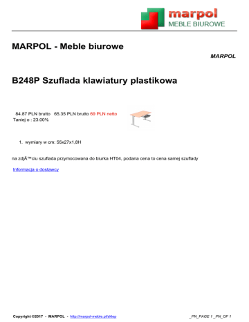 MARPOL - Meble biurowe MARPOL B248P Szuflada klawiatury plastikowa 84.87 PLN brutto 65.35 PLN brutto 69 PLN netto Taniej o : 23.00% 1. wymiary w cm: 55x27x1,8H na zdjÄ™ciu szuflada przymocowana do biurka HT04, podana cena to cena samej szuflady Informacja o dostawcy Copyright ©2017 - MARPOL - http://marpol-meble.pl/sklep _PN_PAGE 1 _PN_OF 1