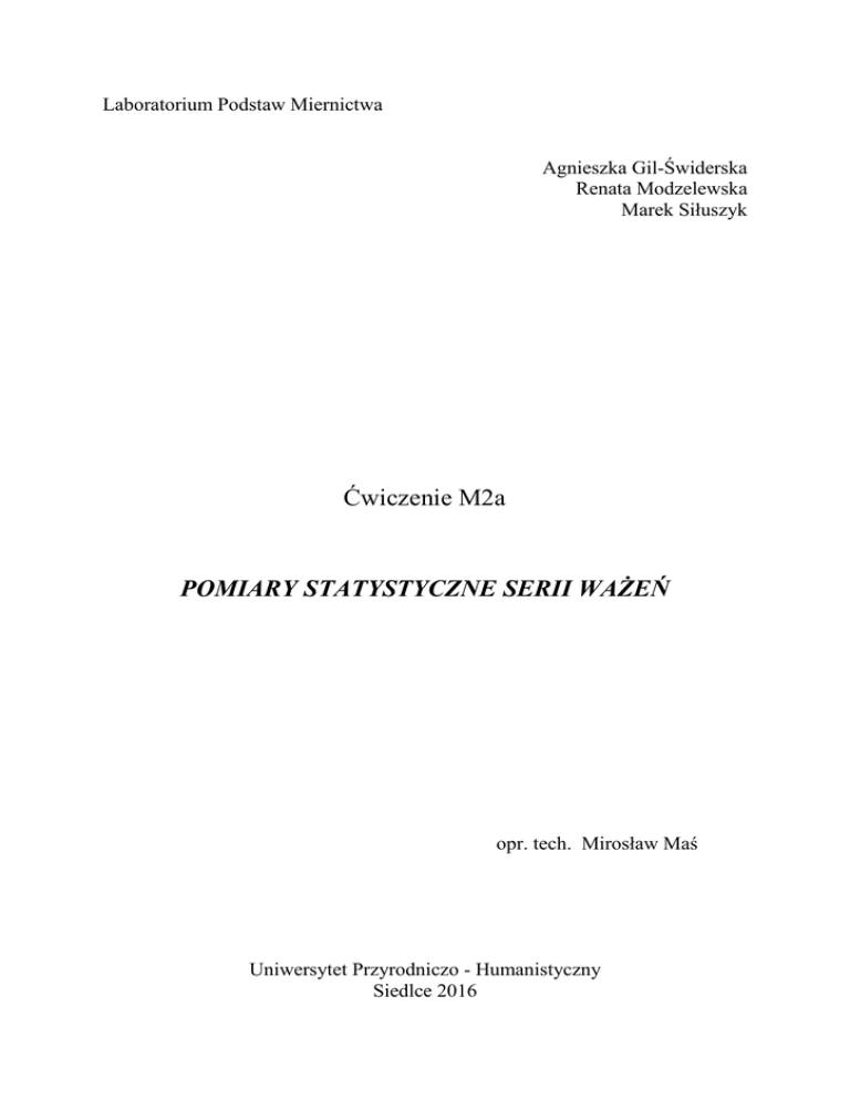 Laboratorium Podstaw Miernictwa Agnieszka Gil-Świderska Renata Modzelewska Marek Siłuszyk Ćwiczenie M2a POMIARY STATYSTYCZNE SERII WAŻEŃ opr. tech. Mirosław Maś Uniwersytet Przyrodniczo - Humanistyczny Siedlce 2016 1. Wstęp Celem ćwiczenia jest zapoznanie się z obsługą wagi WPS 600/C/2 współpracującej z programem komputerowym Pomiar Win, wykonanie serii ważeń, oraz wykorzystanie uzyskanych wyników pomiarów do obliczeń statystycznych. W skład zestawu pomiarowego wchodzą - waga WPS 600/C/2 - zestaw elementów do ważenia - komputer PC z programem Pomiar Win do rejestracji i przetwarzania danych pomiarowych - przewód RS 232 Przed rozpoczęciem ćwiczenia należy sprawdzić czy zestaw laboratoryjny jest kompletny. Do ćwiczenia należy opanować następujące zagadnienia teoretyczne: • • • • • obsługa wagi WPS 600/C/2 praktyczna obsługa programu Pomiar Win pojęcia masy, ciężaru, wzajemne korelacje między tymi wielkościami podstawowe pojęcia ze statystyki; odchylenie średnie; standardowe i kwadratowe, wariancja, mediana histogram 3 2. Podstawy teoretyczne Celem ćwiczenia jest zapoznanie się z obsługą wagi WPS 600/C/2 oraz wykorzystanie uzyskanych wyników pomiarów do obliczeń statystycznych. Dla przypomnienia: Odchylenie przeciętne d= 1 N ∑ xi − xM N i =1 gdzie: d – odchylenie przeciętne xi – kolejny pomiar N – liczba pomiarów xM -mediana, jest to wartość dzieląca zbiór na połowę: 50% elementów jest mniejsza od xM , 50% wartości jest większych niż xM . Dla zbiorów o rozkładzie symetrycznym xM = x , gdzie x – średnia z wszystkich pomiarów: x + x2 + L + x N x= 1 N Wariancja z próby (wariancja obciążona): 1 N 2 s 2 = ∑ ( xi − x ) N i =1 Pewne argumenty teoretyczne przemawiają za zamianą czynnika N w mianowniku ostatniego wyrażenia na N-1. Wtedy: Wariancja z próby (wariancja nieobciążona): 1 N (xi − x )2 sˆ 2 = ∑ N − 1 i =1 (zmiana ta nie ma znaczenia w przypadku rozważania całej populacji, która powinna być dostatecznie duża). Odchylenie standardowe pomiarów x1 , x2 ,L, x N 1 N (xi − x )2 ∑ N − 1 i =1 Oczywiście wartość średnia x powinna być znacznie bliższa wartości prawdziwej niż większość poszczególnych pomiarów xi. Jeżeli zmienna losowa X ma rozkład normalny N (m, σ ) , to suma niezależnych zmiennych s= losowych X1+X2+...+XN ma też rozkład normalny postaci N (n ⋅ m, σ n ) . Wtedy, zmienna 1 N σ ) , zaś średni błąd losowy X k ma także rozkład normalny N (m, ∑ N k =1 n (odchylenie standardowe estymatora X N ) losowa X N = σx = N 1 (xi − x )2 = 1 σ ∑ N ( N − 1) i =1 N 4 Histogram jest jednym z najbardziej popularnych wykresów statystycznych. Służy on do przedstawienia liczebności obserwacji w zadanych przedziałach badanej zmiennej. Jest to jeden z graficznych sposobów przedstawiania rozkładu empirycznego cechy. Składa się z szeregu prostokątów umieszczonych na osi współrzędnych. Histogram dla bardzo dużej liczby pomiarów N jest nazywany rozkładem wartości wielkości mierzonej x wokół wartości średniej x . Przykładem rozkładu jest rozkład normalny (rozkład Gaussa), opisany krzywą Gaussa, zwaną krzywą rozkładu normalnego, która ma jedno maksimum ze stosunkowo stromymi zboczami. Taki kształt krzywej jest intuicyjnie łatwy do przewidzenia, gdyż pomiary dające wartości x coraz bardziej odległe od wartości średniej x są coraz mniej prawdopodobne. 5 3. Waga WPS 600/C/2 Pełna instrukcja obsługi jest dostępna na stanowisku pomiarowym. Przed włączeniem zasilania należy sprawdzić wypoziomowanie wagi, pęcherzyk powietrza umieszczony w poziomnicy powinien znajdować się w położeniu centralnym patrz Rys. 1, gdy tak nie jest - należy wykonać regulację, pokręcając regulowanymi nóżkami. Rys. 1 UWAGA: Po włączeniu wagi przed przystąpieniem do pomiarów należy odczekać, aż waga osiągnie stabilizację cieplną. Dla wag legalizowanych serii WPS standardowy czas nagrzewania to 6 minut w tym czasie wyświetlacz pokazuje komunikat: Rys. 2 Komunikat burn - in dla wag legalizowanych pojawia się przy każdym załączeniu wagi do sieci. W tym czasie nie można wykonywać żadnych ważeń. Po nagrzaniu waga samoczynnie przejdzie do stanu ważenia. 6 Rozmieszczenie niektórych przycisków sterujących przedstawia Rys. 1 Rys. 1 Przycisk ON/OFF służy do wyłączenia wyświetlacza wagi. Inne podzespoły wagi nadal są zasilane i waga pozostaje w stanie oczekiwania na dalszą pracę. Ponowne naciśnięcie przycisku powoduje wyświetlenie stanu ważenia wraz z jednostkami miary. Przycisk PRINT służy nawiązania połączenia z urządzeniem zewnętrznym poprzez złącze RS 232 Przycisk CAL służy do ręcznej kalibracji wagi. Po naciśnięciu przycisku waga rozpoczyna proces kalibracji. Naciśnięcie przycisku ZERO/TARE w trakcie kalibracji powoduje przerwanie procesu kalibracji i powrót do funkcji ważenia. Przycisk Units jest przyciskiem funkcyjnym. Służy do wyboru jednostek miary ważenia lub do zmiany niektórych funkcji w menu użytkownika. Przycisk ZERO/TARE służy do zerowania wskazania wagi. Po zdjęciu wyzerowanego ładunku (tary) wyświetlacz pokazuje jego masę poprzedzoną znakiem minus. Gniazda RS 232 znajduje się w tylnej części wagi służą do połączenia z urządzeniami zewnętrznymi takimi jak np.: dodatkowy wyświetlacz; komputer. 7 4. Oprogramowanie Pomiar Win Pełna instrukcja obsługi jest dostępna na stanowisku pomiarowym. Program Pomiar Win przeznaczony jest do zbierania danych pomiarowych z wag firmy RADWAG oraz ich obróbki statystycznej. Podstawowe funkcje programu: • • • • • • odczyt danych z wagi, rejestracja pomiarów i zapisywanie do pliku, możliwość ręcznej bądź automatycznej rejestracji pomiarów, archiwizowanie danych pomiarowych w postaci pliku, wizualizacja danych pomiarowych w formie wykresu, obróbka statystyczna danych pomiarowych, możliwość tworzen