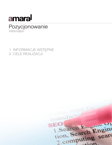 Pozycjonowanie Informator 1. INFORMACJE WSTĘPNE 2. CELE REALIZACJI Pozycjonowanie 1. INFORMACJE WSTĘPNE Codziennie miliony osób poszukują w Internecie interesujących ich informacji o najróżniejszych produktach i usługach. Dzięki pozycjonowaniu potencjalni Klienci Państwa przedsiębiorstwa mogą znaleźć Waszą ofertę w Internecie. Tu pojawi się link do Państwa strony firmowej po wpisaniu przez potencjalnego Klienta pozycjonowanych wyrażeń kluczowych. Czym jest pozycjonowanie stron internetowych? Najkrócej mówiąc - to promocja firmy i jej produktów w najpopularniejszych wyszukiwarkach internetowych, takich jak: Google, Onet czy Wirtualna Polska. Ta forma promocji polega na wykonywaniu szeregu działań, dzięki którym strona internetowa ukazuje się na jak najwyższych pozycjach w wynikach wyszukiwania na wybrane wyrażenia kluczowe. Miejsce, które zajmie strona www w wyszukiwarce, jest bardzo ważne, ponieważ ponad 90% szukających ogranicza przeglądanie takiej listy do dwóch pierwszych stron wyników wyszukiwania. Jako agencja zajmująca się tworzeniem wizerunku firm w Internecie, mamy przyjemność zaproponować Państwu reklamę, która dociera do klientów dokładnie w chwili, gdy poszukują oferowanych przez Państwa produktów lub usług, dlatego jest obecnie jedną z najskuteczniejszych form reklamy. www.amaral.pl 1. INFORMACJE WSTĘPNE Pozycjonowanie 2. CELE REALIZACJI Pozycjonowanie jest jedną z najskuteczniejszych form promocji. Ponad 90% internautów korzysta z Internetu w celu zdobycia informacji o interesujących ich produktach czy usługach. W tej sytuacji brak promocji firmy w najpopularniejszych wyszukiwarkach to jak strzał do własnej bramki. Na kolejnej stronie przedstawiamy najważniejsze korzyści płynące z promocji własnej firmy w wyszukiwarkach internetowych przy współpracy z AMARAL: Efektywne pozyskiwanie nowych Klientów Profesjonalnie prowadzone pozycjonowanie stron służy jednemu celowi: pozyskaniu nowych Klientów. Dzięki optymalnie dobranym wyrażeniom kluczowym, Państwa stronę firmową będą odwiedzać Klienci rzeczywiście poszukujący oferowanych przez Was produktów lub usług. To już ponad 14 milionów ludzi w Polsce! Opłaty uzależnione wyłącznie od efektów Współpracujący z nami kontrahent płaci tylko wtedy, gdy jego strona www znajdzie się w pierwszej dziesiątce wyników wyszukiwania według wybranego wyrażenia kluczowego. Innymi słowy: jeżeli Państwa strona będzie na tej liście jedenasta lub dalsza - usługa Pozycjonowania jest bezpłatna! Skuteczne konkurowanie z liderami rynku Dzięki pozycjonowaniu, przy stosunkowo niewielkich nakładach, przedsiębiorcy mogą skutecznie dotrzeć z ofertą do swoich potencjalnych Klientów oraz znaleźć się w czołówce przedsiębiorstw z danej branży. To możliwość naprawdę skutecznego konkurowania! Niskie ceny i wyjątkowo korzystne warunki AMARAL proponuje konkurencyjne ceny i niezwykle przyjazne warunki umowy. Porównajcie Państwo nasze propozycje w innych firmach, a na pewno się nie zawiedziecie. Możliwość konkurowania na zagranicznych rynkach Tak samo jak można wpłynąć na pozycje strony w polskich wyszukiwarkach, można pozycjonować w wyszukiwarkach zagranicznych. Możemy promować Państwa stronę www praktycznie w dowolnie wybranych krajach świata. www.amaral.pl 2. CELE REALIZACJI Pozycjonowanie 2. CELE REALIZACJI Profesjonalne opracowanie tekstów Nasi copywriterzy, po Państwa akceptacji, przeredagują treść strony tak, aby była przyjazna dla wyszukiwarek. Poza tym specjalnie pod kątem promocji w wyszukiwarkach tworzymy bezpłatne artykuły tematyczne umieszczane w portalach branżowych. Agencja Reklamowa AMARAL zapewni Państwu: indywidualnego opiekuna Państwa strony www, który jest dla Państwa dostępny przez cały okres trwania umowy; możliwość jednorazowej zmiany indywidualnego opiekuna w trakcie trwania umowy w przypadku jakiegokolwiek niezadowolenia z efektów jego pracy lub nawet bez podania powodów, darmowe dopasowywanie parametrów Państwa strony www do zmieniających się w czasie algorytmów wyszukiwarek; publikacje tzw. "wizytówek firmy", które oprócz zawartych linków wpływających na wzrost pozycji stanowią również dodatkowa i bardzo skuteczna formę reklamy; profesjonalne opracowanie tekstów na Państwa stronie www tak, by była ona przyjazna dla wyszukiwarek internetowych czyli tzw. SEO-copywritting; artykuły tematyczne na temat działalności Państwa Firmy umieszczane w portalach branżowych oraz na naszym bogatym tzw. zapleczu pozycjonerskim; wyeliminowanie błędów na Państwa stronie www utrudniających jej promowanie w wyszukiwarkach; optymalizacje kodu Państwa serwisu www pod katem wyszukiwarek internetowych, która pozostaje na Państwa stronie nawet po wygaśnięciu zawartej z nami umowy; dodatkowe zwiększenie atrakcyjności Państwa strony www dla robotów sieciowych czyli stworzenie tzw. bramek dla robotów; systematyczna analizę pozycji Państwa strony www przez przydzielonego opiekuna i dostosowywanie metod do zmieniających się algorytmów wyszukiwarek; cotygodniowe raportowanie wyników z pozycjonowania Państwa strony www i przesyłanie wyczerpujących raportów po zakończeniu każdego miesiąca pracy; szybką reakcje na wszelkie Państwa zapytania i wątpliwości; doradztwo w zakresie ewentualnej rozbudowy Państwa strony www lub stworzenia kolejnych stron www, tak by były one dobrze indeksowane przez roboty wyszukiwarek internetowych; żadnych opłat wstępnych lub abonamentowych - płatności tylko za efekty! www.amaral.pl 2. CELE REALIZACJI