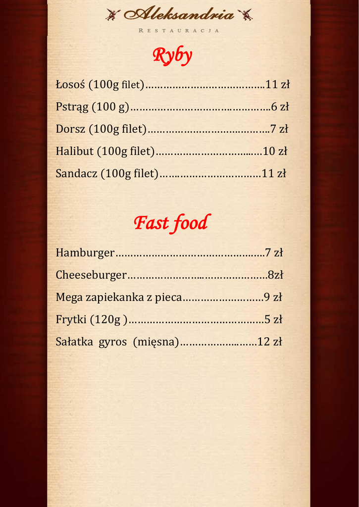 Ryby Łosoś (100g filet)………………………………….11 zł Pstrąg (100 g)…………………………….………….6 zł Dorsz (100g filet)………………………….……….7 zł Halibut (100g filet)…………………………...…10 zł Sandacz (100g filet)…….………………………11 zł Fast food Hamburger……………………………………….….7 zł Cheeseburger……………………..…………………8zł Mega zapiekanka z pieca………………………9 zł Frytki (120g )………………………………………5 zł Sałatka gyros (mięsna)………………..……12 zł
