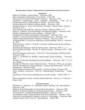 Литература по курсу «Теоретическая грамматика польского языка» Основная Bańko M. Wykłady z polskiej fleksji. – Warszawa, 2002. Bąk J. Słownictwo i frazeologia w ćwiczeniach. – Łódź 1999. Doroszewski W. Elemety leksykologii i semiotyki. – Warszawa, 1970. Gramatyka współczesnego języka polskiego. Morfologia / Pod red. R. Grzegorczykowej, R. Laskowskiego, H. Wróbla. – Warszawa, 1984. Grzegorczykowa R. Wykłady z polskiej składni. – Warszawa, 1996. Grzegorczykowa R. Zarys słowоtwórstwa polskiego.: Słowotwórstwo opisowe. – Warszawa, 1974. Inny słownik języka polskiego / Pod red. M. Bańki. Warszawa 2000. T. 1-2. Kania St., Tokarski J. Zarys leksykologii i leksykografii polskiej. – Warszawa 1984. Miodek J. Kultura języka w teorii i praktyce. – Wrocław 1983. Miodunka Wł. Podstawy leksykologii i leksykografii. – Warszawa 1989. Nagórko A. Zarys gramatyki polskiej (ze słowotwórstwem). – Warszawa, 2001. Nauka o języku dla polonistów / Pod red. S. Dubisza. – Warszawa, 2002. Ortografia polska / Towarzystwo Miłośników Języka Polskiego. Wyd. II. – Wrocław i dr., 1972. Ostaszewska D., Tambor J. Fonetyka i fonologia współczesnego języka polskiego. – Warszawa, 2001. Słownik języka polskiego / Pod red. M.Szymczaka.– Warszawa, 1978. T. 1 – 3. Słownik języka polskiego / Pod red. W. Doroszewskiego.– Warszawa, 1958 – 1968. T. 1 – 10. Słownik poprawnej polszczyzny / Pod red. W. Doroszewskiego i H.Kurkowskiej. – Warszawa, 1980. Saloni Z., Świdziński M. Składnia współczesnego języka polskiego. – Warszawa, 2001. Skorupka St. Słownik frazeologiczny języka polskiego. – Warszawa, 1967. T 1-2 (и др. издания). Skorupka St. Słownik wyrazów bliskoznacznych. – Warszawa, 1959 (и др. издания). Słownik interpunkcyjny języka polskiego z zasadami przestankowania / Pod red. J. Podrackiego. – Warszawa 1999. Słownik polskich całkowitych homonimów / Pod red. D. Butler. Wrocław 1989. Tekst: problemy teoretyczne / Pod red. J.Bartmińskiego, B.Bonieckiej. – Lublin, 1998. Гюлумянц К. Польско-русский фразеологический словарь. – Минск 2004. Т. 1 – 2. Польска-беларускі слоўнік. Słownik polsko-białoruski. / Пад рэд. Г.А. Цыхуна. – Мінск, 2004. Дополнительная Bartnicka B., Satkiewicz H. Gramatyka języka polskiego dla cudzoziemców. – Warszawa, 1990. Buttler D. Frazeologia polska. Ćwiczenia dla cudzoziemców. – Warszawa 1980. Buttler D. Innowacje składniowe wspólczesnej polszczyzny. – Warszawa, 1976. Doroszewski W. Z zagadnień leksykografii polskiej. – Warszawa 1954. Encyklopedia wiedzy o języku polskim / Pod red. S.Urbańczyka. – Wrocław, 1978. Język polski. Encyklopedia w tabelach / Pod red. W. Mizerskiego. – Warszawa, 2000. Językowy obraz świata / Pod red. J. Bartmińskiego. – Lublin 1990. Karolak S. Słownik frazeologiczny rosyjsko-polski. Русско-польский фразеологический словарь. – Warszawa, 1998. T 1-2. Klemensiewicz Z. Zarys składni polskiej. – Warszawa, 1952 (или др. издание). Nowy słownik poprawnej polszczyzny / Pod red. A. Markowskiego. – Warszawa, 1999. Saloni Z. Czasownik polski. – Warszawa, 2002. Tekst: analizy i interpretacje / Pod red. J.Bartmińskiego, B.Bonieckiej. – Lublin, 1998. Wierzchowska B. Wymowa polska. – Warszawa, 1965 (или др. издание). Киклевич А.К., Кожинова А.А. Польский язык. Практический курс. – Минск 2000 (или др. издание).