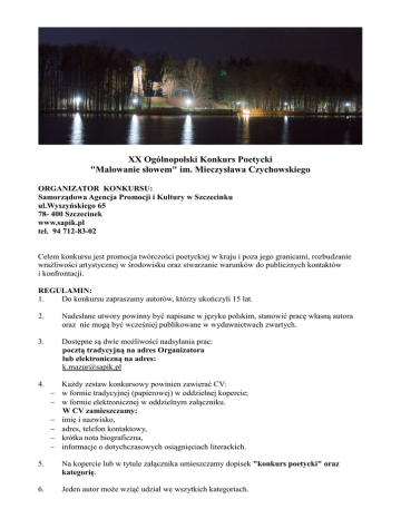 XX Ogólnopolski Konkurs Poetycki "Malowanie słowem" im. Mieczysława Czychowskiego ORGANIZATOR KONKURSU: Samorządowa Agencja Promocji i Kultury w Szczecinku ul.Wyszyńskiego 65 78- 400 Szczecinek www.sapik.pl tel. 94 712-83-02 Celem konkursu jest promocja twórczości poetyckiej w kraju i poza jego granicami, rozbudzanie wrażliwości artystycznej w środowisku oraz stwarzanie warunków do publicznych kontaktów i konfrontacji. REGULAMIN: 1. Do konkursu zapraszamy autorów, którzy ukończyli 15 lat. 2. Nadesłane utwory powinny być napisane w języku polskim, stanowić pracę własną autora oraz nie mogą być wcześniej publikowane w wydawnictwach zwartych. 3. Dostępne są dwie możliwości nadsyłania prac: pocztą tradycyjną na adres Organizatora lub elektroniczną na adres: [email protected] 4. Każdy zestaw konkursowy powinien zawierać CV: w formie tradycyjnej (papierowej) w oddzielnej kopercie; w formie elektronicznej w oddzielnym załączniku. W CV zamieszczamy: imię i nazwisko, adres, telefon kontaktowy, krótka nota biograficzna, informacje o dotychczasowych osiągnięciach literackich. − − − − − − 5. Na kopercie lub w tytule załącznika umieszczamy dopisek "konkurs poetycki" oraz kategorię. 6. Jeden autor może wziąć udział we wszytkich kategoriach. 7. Zestaw od 30 do 50 wierszy nadsyłamy w terminie do 30 sierpnia 2015 r. 8. Jury powołane przez Organizatora w składzie: Bohdan Zadura, Mariusz Grzebalski, Jerzy Zimny oraz przedstawiciel organizatora i sekretarz – Krystyna Mazur, przyzna tylko jedną nagrodę w każdej z trzech kategorii: I/ Nagroda Burmistrza Miasta Szczecinek Jerzego Hardie – Douglasa za zestaw wierszy o dowolnej tematyce: 1000 zł i druk książki autorskiej w ilości 300 egzemplarzy ( 200 otrzymuje autor, pozostałe egzemplarze zostają do dypozycji Organizatora). II/ Nagroda Starosty Szczecineckiego Krzysztofa Lisa za zestaw wierszy dla dzieci: 1000 zł i druk książki autorskiej w ilości 300 egzemplarzy ( 200 otrzymuje autor, pozostałe egzemplarze zostają do dypozycji Organizatora). III/ Nagroda Posła na Sejm RP – Wiesława Suchowiejko za zestaw wierszy w kategorii "POETA REGIONU" (kwalifikują się autorzy mieszkający w odległości do 100 km od Szczecinka): 500 zł i druk książki autorskiej w ilości 200 egzemplarzy (100 otrzymuje autor, pozostałe egzemplarze zostają do dyspozycji Organizatora). 9. Oficjalne rozstrzygnięcie konkursu nastąpi w listopadzie 2015 r. O wynikach i dokładnej dacie Koncertu Finałowego laureaci zostaną powiadomieni drogą mailową lub telefoniczną. Werdykt zostanie udostępniony na stronie internetowej Organizatora oraz stronach poetyckich. 10. Odbiór nagród możliwy jest wyłącznie podczas Imprezy Finałowej. Organizatorzy nie przesyłają nagród pocztą. Nagroda nieodebrana zostanie przekazana na konto innych projektów kulturalnych organizowanych przez SAPiK w Szczecinku. 11. Nadesłanych prac Organizator nie zwraca. 12. O doborze utworów do tomików pokonkursowych, objętości, formie i oprawie plastycznej decyduje Organizator. 13. Uczestnicy konkursu wyrażają zgodę na przetwarzanie swoich danych osobowych w zakresie koniecznym do prawidłowej współpracy z Organizatorem, zgodnie z Ustawą z dnia 29.08.1997 r. o ochronie danych osobowych Dz. U. nr 101 z 2002 r., poz. 926 z późniejszymi zmianami. 14. Laureaci wyrażają zgodę na nieodpłatne wykorzystanie nagrodzonych wierszy w publikacjach służących reklamie konkursu. 15. Organizator nie pokrywa kosztów przyjazdu na Koncert Finałowy. 16. Sprawy sporne, nie ujęte regulaminem rozstrzyga Jury oraz Komitet Organizacyjny. 17. Zgłoszenie do udziału w konkursie traktowane jest jako akceptacja wszystkich warunków regulaminu. 18. Szczegółowych informacji zasięgnąć można w Samorządowej Agencji Promocji i Kultury w Szczecinku na stronie internetowej Organizatora lub u sekretarza konkursu Krystyny Mazur (tel. 94 712-83-02; e-mail: [email protected] ). Serdecznie zapraszamy do udziału w konkursie!