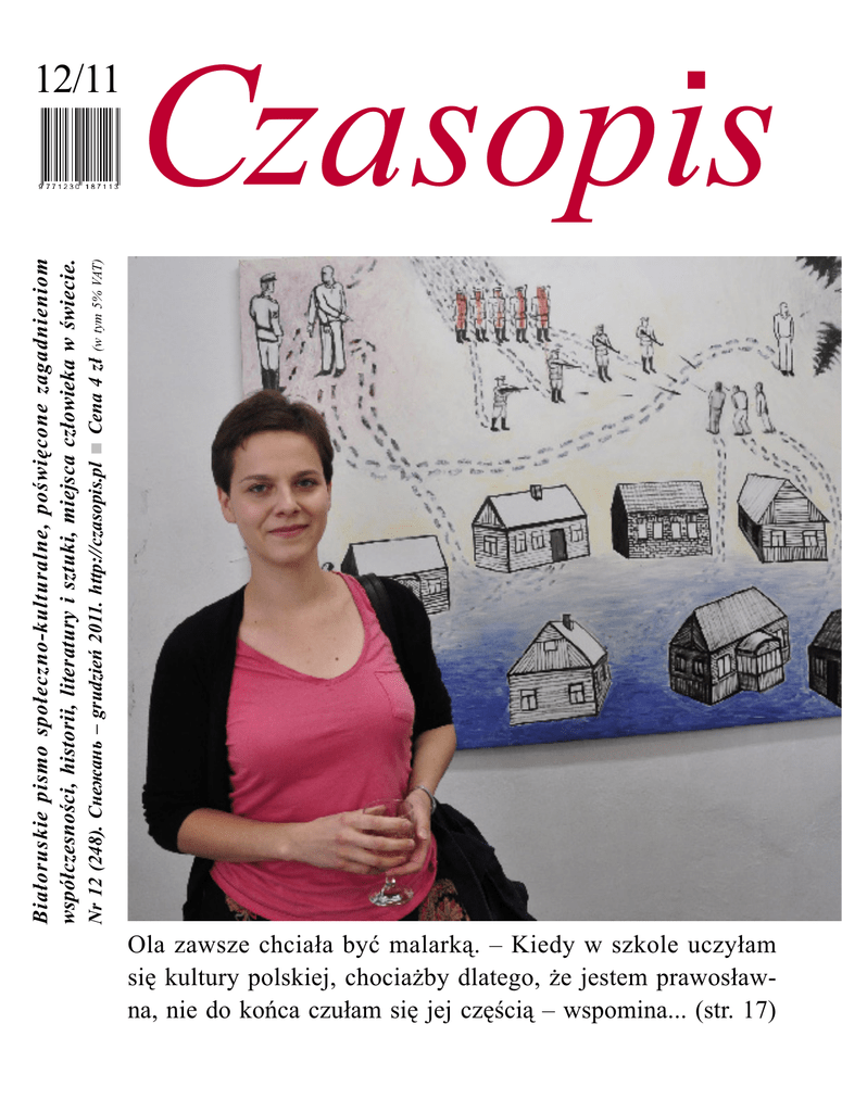 Białoruskie pismo społeczno-kulturalne, poświęcone zagadnieniom współczesności, historii, literatury i sztuki, miejsca człowieka w świecie. Nr 12 (248). Снежань – grudzień 2011. http://czasopis.pl ■ Cena 4 zł (w tym 5% VAT) 12/11 Czasopis Ola zawsze chciała być malarką. – Kiedy w szkole uczyłam się kultury polskiej, chociażby dlatego, że jestem prawosławna, nie do końca czułam się jej częścią – wspomina... (str. 17) ■Сакрат Яновіч. Паўвеку чалавецтва. Памятаю з дзяцінства школьны каляровы атлас свету. Кантынент Аф... str. 4 ■Janusz Korbel. Dzielenie zabija. Zastanawiam się czasami, jak bardzo podobne, a może wręcz te same prawa rządzą ś... str. 5 ■Opinie, cytaty. – To przykre, że muszę to przeżywać kolejny raz, mam nadzieję, że ta sprawa nie będzie się już tak ciąg... str. 7 ■Minął miesiąc. W regionie. 23 października. w Muzeum Rolnictwa im. ks. Krzysztofa Kluka w Ciechanowcu zostały... str. 7 Niestety, dzień przed zakończeniem prac jedną z tablic, przy wjeździe do Orli od strony Bielska, zamalowano żółtą farbą. Pracownikom firmy tuż... (str. 14) ■Tablice po białorusku tak, ale... Do Zespołu Szkół z Dodatkowym Nauczaniem Języka Białoruskiego im. Ziemi... str. 14 ■Hutarka. Aleksandra Czerniawska, białoruska malarka, mieszka w Warszawie, ale mocno związana jest w P... str. 17 ■У добрай кампаніі. На доўга мне запамятаецца апошняя паездка ў Беларусь. У выхадня дні ў канцы верасн... str. 20 ■Каляндар 2012 (укладыш) ■Zakochać się pod pomnikiem Lenina... Pierwsza umowa między Wydziałem Humanistycznym Uniwersytet... str. 34 ■Календарыюм. Сьнежань – гадоў таму. 215 – 21.12.1796 г. у Мясоце пад Маладэчнам нар. Тамаш Зан (пам. 19.0... str. 38 ■Eugeniusz Czyżewski. Echa Ostoi Utraconej. 31. Praporszczyk Baj ducha boju połknął. Z dachu na walczących pa... str. 39 ■Васіль Петручук. Крышынкі. 50. Калі мне было ўжо 8Białoruś z telewizji i prawdziwa Białoruś to dwa różne kraje. (...) Białorusini nie przejmują się zbytnio tą sytuacją. Owszem. Narzekają, krytykują... (str. 34) 9 гадоў, я на коней улазіў па іх нагах, трымаючыся... str. 41 ■Успаміны з 1974 г. 1. Дырэкцыя электрастанцыі Тузла ў Югаславіі запрасіла на свой кошт усіх польскіх... str. 43 ■Leon Moenka. Stawka o życie. 2. Decyzja. Byłem zirytowany. Z przytoczonej powyżej rozmowy wynikało, że... str. 42 ■Да маці ў госці. Апавяданне. Сцяпан Мяліца даўно ўжо працуе ў горадзе шафёрам арцелі „Чырвоны краве... str. 45 ■ Рэцензіі, прэзентацыі. Беластоцкія сустрэчы з беларускай культурай. На працягу аднаго тыдня ў Бе... str. 46 ■Радкі з лістоў адгалоскі... Szanowna Redakcjo! Zaglądam do zakładki „Беларускія аўтары” portalu Kamunik... str. 50 Na okładce: Aleksandra Czerniawska na wernisażu podczas wrześniowego benefisu Sokrata Janowicza w Krynkach Fot. Janusz Korbel Некалькі месяцаў таму Андрэй Гарбуз са Згуртавання „Сакольшчына” расказаў мне пра сюрпрыз, які іхняе аб’яднанне рыхтуе... (str. 48) Czytelnikom, którzy obchodzą Święta Bożego Narodzenia w grudniu, życzymy wiele radości i pogody ducha. Redakcja Jerzy Chmielewski Od Redaktora. Słuchając exposé premiera Donalda Tuska, wygłoszonego w Sejmie 18 listopada, starałem się wychwycić tematy mi najbliższe, czyli dotyczące mniejszości, kultury i Białorusi. Jednak szef rządu, przedstawiając plan działań na nową kadencję, te sprawy niemalże pominął. W jego przemówieniu przewijały się jak mantra słowa kryzys, budżet, finanse państwa. Tusk skoncentrował się na sprawach gospodarczych, przekonując do radykalnych działań, które mają uchronić Polskę przed scenariuszem Grecji, Hiszpanii czy Włoch. Ale, jak podkreślił, „wszyscy obywatele muszą po równi i solidarnie ponosić koszt naprawy finansów państwa”. Zatem my, polscy Białorusini, także. Trudno, by premier w exposé mówił o mniejszościach, skoro stanowią one zaledwie kilka procent ludności kraju. Zresztą jest ustawa, które te sprawy reguluje i na żadne zmiany tu się nie zanosi. Niektóre zapowiedziane przez premiera reformy pośrednio jednak dotyczą także mniejszości. Premier zarządził oto rozdzielenie resortu spraw wewnętrznych i administracji. Departament wyznań religijnych oraz mniejszości narodowych i etnicznych, który zajmuje się naszymi sprawami, przydzielając także dotacje, znalazł się w oddzielonym od MSW Ministerstwie Administracji i Cyfryzacji. Choć specyfika mniejszości nie w pełni do tego przystaje, to i tak lepiej niż gdyby pozostawiono to przy MSW. Bo bardziej kojarzy się to z dozorem policyjnym niż troską państwa o kulturową tożsamość niepolskich społeczności. Zresztą mniejszości do dziś mają niemiłe wspo- mnienia z minionego okresu, kiedy o wielkości przyznawanych funduszy na ich festiwale i czasopisma decydowali nie urzędnicy, ale funkcjonariusze. Dlatego rząd poważnie brał pod uwagę propozycję, aby taką komórkę przyłączyć bezpośrednio do kancelarii premiera. Mówiąc w swym exposé o budżecie państwa, premier powiedział, że będzie on zrównoważony. To w obliczu grożącego kryzysu oznacza konieczność oszczędności po stronie wydatków. Trwają akurat prace nad dotacjami, które mamy otr