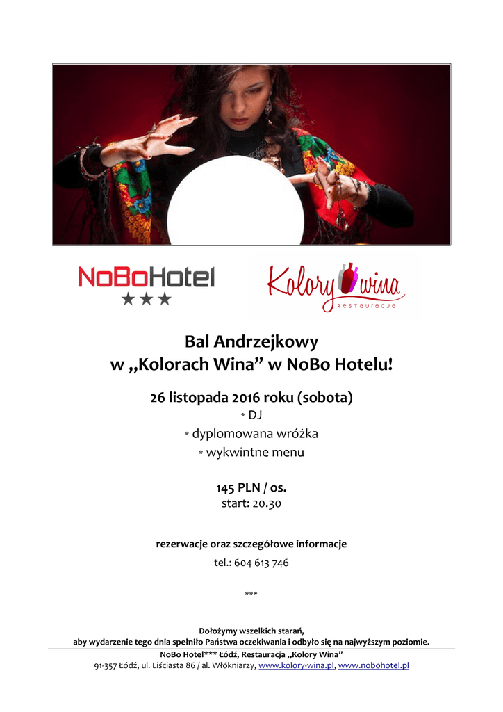 Bal Andrzejkowy w „Kolorach Wina” w NoBo Hotelu! 26 listopada 2016 roku (sobota) * DJ * dyplomowana wróżka * wykwintne menu 145 PLN / os. start: 20.30 rezerwacje oraz szczegółowe informacje tel.: 604 613 746 *** Dołożymy wszelkich starań, aby wydarzenie tego dnia spełniło Państwa oczekiwania i odbyło się na najwyższym poziomie. NoBo Hotel*** Łódź, Restauracja „Kolory Wina” 91-357 Łódź, ul. Liściasta 86 / al. Włókniarzy, www.kolory-wina.pl, www.nobohotel.pl MENU Zaczarowany Welcome Drink Dymiący koktajl niespodzianka od Szefa baru Na powitanie Ciastko z wróżbą Przystawka Carpaccio z łososia aromatyzowane oliwą truflową i oprószone rukolą, serwowane z ciepłym pieczywem Zupa Velouté z selera z pomidorową pianką, grzankami i pestkami dyni Danie główne Wieprzowina z tapenadą na sosie kaparowo-pieczarkowym podana z ziemniaczanym 'gratin' i warzywami panierowanymi w cieście Deser Ananas smażony z malinami, aromatyzowany rumem, doprawiony pieprzem, serwowany z lodem o smaku waty cukrowej *** Zakąski zimne podane do stołu Tuszka śledzia w oliwie z cebulką i kaparami Mus drobiowy z warzywami otulony w boczek wędzony Rolada z kaczki ze szpinakiem Domowy pasztet wołowo-wieprzowy z konfiturą z czerwonej cebuli Sałatka z ricottą i boczkiem z pieca Selekcja pieczywa, masła oraz sosów *** Trzeci posiłek gorący Zabielany czerwony barszcz z kołdunami litewskimi własnego wyrobu *** Napoje, nielimitowane spożycie woda mineralna, soki owocowe (pomarańczowy, jabłkowy), napoje gazowane grupy Pepsi świeżo parzona kawa Piacetto, selekcja herbat Sir Henry *** Alkohole we własnym zakresie, bez dodatkowych opłat *** Pozostałe napoje i alkohole zgodnie z cennikiem restauracyjnym