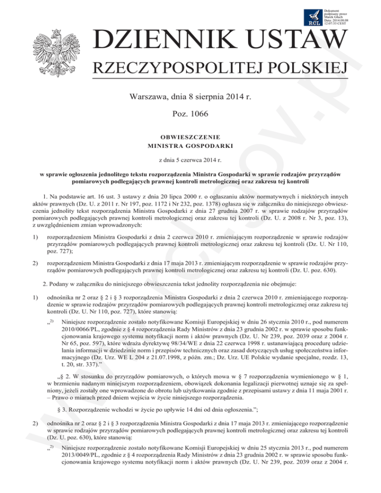 Dokument podpisany przez Marek Głuch Data: 2014.08.08 12:07:33 CEST DZIENNIK USTAW v.p l RZECZYPOSPOLITEJ POLSKIEJ Warszawa, dnia 8 sierpnia 2014 r. Poz. 1066 OBWIESZCZENIE ministra gospodarki .go z dnia 5 czerwca 2014 r. w sprawie ogłoszenia jednolitego tekstu rozporządzenia Ministra Gospodarki w sprawie rodzajów przyrządów pomiarowych podlegających prawnej kontroli metrologicznej oraz zakresu tej kontroli 1. Na podstawie art. 16 ust. 3 ustawy z dnia 20 lipca 2000 r. o ogłaszaniu aktów normatywnych i niektórych innych aktów prawnych (Dz. U. z 2011 r. Nr 197, poz. 1172 i Nr 232, poz. 1378) ogłasza się w załączniku do niniejszego obwieszczenia jednolity tekst rozporządzenia Ministra Gospodarki z dnia 27 grudnia 2007 r. w sprawie rodzajów przyrządów pomiarowych podlegających prawnej kontroli metrologicznej oraz zakresu tej kontroli (Dz. U. z 2008 r. Nr 3, poz. 13), z uwzględnieniem zmian wprowadzonych: 2) rozporządzeniem Ministra Gospodarki z dnia 2 czerwca 2010 r. zmieniającym rozporządzenie w sprawie rodzajów przyrządów pomiarowych podlegających prawnej kontroli metrologicznej oraz zakresu tej kontroli (Dz. U. Nr 110, poz. 727); w. rcl 1) rozporządzeniem Ministra Gospodarki z dnia 17 maja 2013 r. zmieniającym rozporządzenie w sprawie rodzajów przyrządów pomiarowych podlegających prawnej kontroli metrologicznej oraz zakresu tej kontroli (Dz. U. poz. 630). 2. Podany w załączniku do niniejszego obwieszczenia tekst jednolity rozporządzenia nie obejmuje: 1) odnośnika nr 2 oraz § 2 i § 3 rozporządzenia Ministra Gospodarki z dnia 2 czerwca 2010 r. zmieniającego rozporządzenie w sprawie rodzajów przyrządów pomiarowych podlegających prawnej kontroli metrologicznej oraz zakresu tej kontroli (Dz. U. Nr 110, poz. 727), które stanowią: ww „2)Niniejsze rozporządzenie zostało notyfikowane Komisji Europejskiej w dniu 26 stycznia 2010 r., pod numerem 2010/0066/PL, zgodnie z § 4 rozporządzenia Rady Ministrów z dnia 23 grudnia 2002 r. w sprawie sposobu funkcjonowania krajowego systemu notyfikacji norm i aktów prawnych (Dz. U. Nr 239, poz. 2039 oraz z 2004 r. Nr 65, poz. 597), które wdraża dyrektywę 98/34/WE z dnia 22 czerwca 1998 r. ustanawiającą procedurę udzielania informacji w dziedzinie norm i przepisów technicznych oraz zasad dotyczących usług społeczeństwa informacyjnego (Dz. Urz. WE L 204 z 21.07.1998, z późn. zm.; Dz. Urz. UE Polskie wydanie specjalne, rozdz. 13, t. 20, str. 337).” „§ 2. W stosunku do przyrządów pomiarowych, o których mowa w § 7 rozporządzenia wymienionego w § 1, w brzmieniu nadanym niniejszym rozporządzeniem, obowiązek dokonania legalizacji pierwotnej uznaje się za spełniony, jeżeli zostały one wprowadzone do obrotu lub użytkowania zgodnie z przepisami ustawy z dnia 11 maja 2001 r. – Prawo o miarach przed dniem wejścia w życie niniejszego rozporządzenia. § 3. Rozporządzenie wchodzi w życie po upływie 14 dni od dnia ogłoszenia.”; 2) odnośnika nr 2 oraz § 2 i § 3 rozporządzenia Ministra Gospodarki z dnia 17 maja 2013 r. zmieniającego rozporządzenie w sprawie rodzajów przyrządów pomiarowych podlegających prawnej kontroli metrologicznej oraz zakresu tej kontroli (Dz. U. poz. 630), które stanowią: „2)Niniejsze rozporządzenie zostało notyfikowane Komisji Europejskiej w dniu 25 stycznia 2013 r., pod numerem 2013/0049/PL, zgodnie z § 4 rozporządzenia Rady Ministrów z dnia 23 grudnia 2002 r. w sprawie sposobu funkcjonowania krajowego systemu notyfikacji norm i aktów prawnych (Dz. U. Nr 239, poz. 2039 oraz z 2004 r. Dziennik Ustaw –2– Poz. 1066 v.p l Nr 65, poz. 597), które wdraża dyrektywę 98/34/WE Parlamentu Europejskiego i Rady z dnia 22 czerwca 1998 r. ustanawiającą procedurę udzielania informacji w dziedzinie norm i przepisów technicznych oraz zasad dotyczących usług społeczeństwa informacyjnego (Dz. Urz. WE L 204 z 21.07.1998, str. 37, z późn. zm.; Dz. Urz. UE Polskie wydanie specjalne, rozdz. 13, t. 20, str. 337, z późn. zm.).” „§ 2. Postępowania w sprawach prawnej kontroli metrologicznej zbiorników pomiarowych do cieczy posadowionych na stałe na stacjach paliw płynnych, które stosowane są wyłącznie w celu magazynowania cieczy, wszczęte i niezakończone przed dniem wejścia w życie niniejszego rozporządzenia, umarza się, jeżeli z wnioskiem wystąpi strona, na której żądanie postępowanie zostało wszczęte. § 3. Rozporządzenie wchodzi w życie po upływie 14 dni od dnia ogłoszenia.”. ww w. rcl .go Minister Gospodarki: wz. J. Pietrewicz Dziennik Ustaw –3– Poz. 1066 v.p l Załącznik do obwieszczenia Ministra Gospodarki z dnia 5 czerwca 2014 r. (poz. 1066) ROZPORZĄDZENIE MINISTRA GOSPODARKI 1) z dnia 27 grudnia 2007 r. w sprawie rodzajów przyrządów pomiarowych podlegających prawnej kontroli metrologicznej oraz zakresu tej kontroli2) Na podstawie art. 8 ust. 6 ustawy z dnia 11 maja 2001 r. – Prawo o miarach (Dz. U. z 2013 r. poz. 1069) zarządza się, co następuje: § 1. Prawnej kontroli metrologicznej obejmującej zatwierdzenie typu i legalizację pierwotną oraz legalizację ponowną podlegają następujące rodzaje przyrządów pomiarowych: .go 1)3) zbiorniki pomiarowe do cieczy z wyłączeniem zbiorników pomiarowych do cieczy posadowionych na stałe na stacjach paliw płynnych, które stosowane są wyłącznie w celu magazynowania cieczy; przyrządy do pomiaru prędkości pojazdów w ruchu drogowym: a) radarowe, b) laserowe, c) prędkościomierze kontrolne; 3) wagi samochodowe do ważenia pojazdów w ruchu; 4) (uchylony);4) 5) (uchylony);4) 6) drogowe cysterny pomiarowe; 7) 8) w. rcl 2) manometry do opon pojazdów mechanicznych; gęstościomierze zbożowe użytkowe 20 L, 1 L i ¼ L. § 2. Prawnej kontroli metrologicznej obejmującej zatwierdzenie typu i legalizację pierwotną podlegają: 1)5) beczki metalowe; 2) areometry szklane – alkoholomierze i densymetry do alkoholu. § 3. Prawnej kontroli metrologi