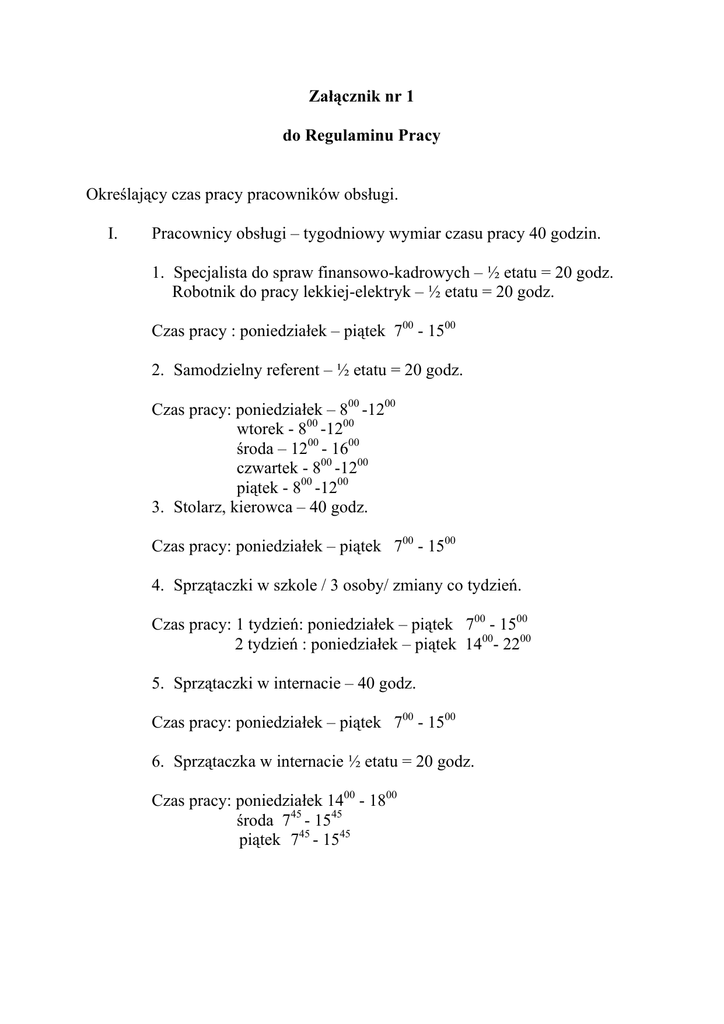 Załącznik nr 1 do Regulaminu Pracy Określający czas pracy pracowników obsługi. I. Pracownicy obsługi – tygodniowy wymiar czasu pracy 40 godzin. 1. Specjalista do spraw finansowo-kadrowych – ½ etatu = 20 godz. Robotnik do pracy lekkiej-elektryk – ½ etatu = 20 godz. Czas pracy : poniedziałek – piątek 700 - 1500 2. Samodzielny referent – ½ etatu = 20 godz. Czas pracy: poniedziałek – 800 -1200 wtorek - 800 -1200 środa – 1200 - 1600 czwartek - 800 -1200 piątek - 800 -1200 3. Stolarz, kierowca – 40 godz. Czas pracy: poniedziałek – piątek 700 - 1500 4. Sprzątaczki w szkole / 3 osoby/ zmiany co tydzień. Czas pracy: 1 tydzień: poniedziałek – piątek 700 - 1500 2 tydzień : poniedziałek – piątek 1400- 2200 5. Sprzątaczki w internacie – 40 godz. Czas pracy: poniedziałek – piątek 700 - 1500 6. Sprzątaczka w internacie ½ etatu = 20 godz. Czas pracy: poniedziałek 1400 - 1800 środa 745 - 1545 piątek 745 - 1545 7. Praczka w internacie – 40 godz. Czas pracy: poniedziałek – piątek 700 - 1500 8. Kucharka – 40 godz. Czas pracy: poniedziałek – piątek 700 - 1500 9. Pomoce kuchenne / 3 osoby/ zmiany co tydzień – 40 godz. Czas pracy: 1 tydzień : poniedziałek – czwartek 1100-1900 piątek 800 - 1600 2 tydzień : poniedziałek - 600-1330 środa - 600-1330 wtorek - 600-1330 czwartek – 1700 - 1830 piątek - 600-1300 3 tydzień: poniedziałek – piątek – 800-1600 10. Hydraulik – ½ etatu = 20 godz. Czas pracy wg. miesięcznego rozkładu czasu pracy 11.Dozorcy Czas pracy wg. miesięcznego rozkładu czasu pracy 12.Palacze c.o. Czas pracy wg. miesięcznego rozkładu czasu pracy. Przy rozliczaniu czasu pracy palaczy c.o. i dozorcy przyjęto 1 miesięczny okres rozliczeniowy. 13.Pomoce nauczyciela – cały etet = 40 godz. ½ etatu = 20 godz. – 4 godz. dziennie