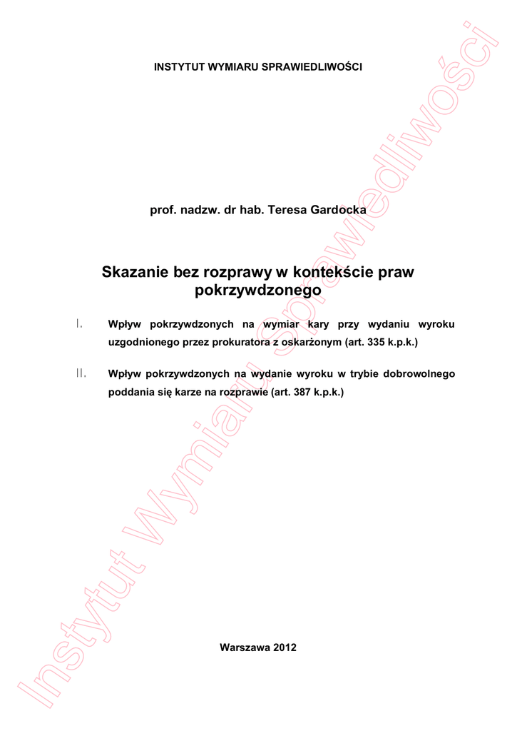 ci ied liw o INSTYTUT WYMIARU SPRAWIEDLIWO CI raw prof. nadzw. dr hab. Teresa Gardocka I. Sp Skazanie bez rozprawy w kontek cie praw pokrzywdzonego Wp yw pokrzywdzonych na wymiar kary przy wydaniu wyroku uzgodnionego przez prokuratora z oskar onym (art. 335 k.p.k.) Wp yw pokrzywdzonych na wydanie wyroku w trybie dobrowolnego aru II. Ins tyt ut W ym i poddania si karze na rozprawie (art. 387 k.p.k.) Warszawa 2012 ci liw o Spis tre ci I. Wprowadzenie......................................................................................................... 1 1. Zagadnienia wst pne .......................................................................................... 1 2. Sk d wzi a si idea konsensualnego skazania ................................................. 3 ied 3. Regulacja zawarta w kodeksie post powania karnego z 1997 roku (przed nowelizacj z 2003 roku).................................................................................... 4 a. Wniosek o skazanie......................................................................................... 4 raw b. Wniosek o wydanie wyroku skazuj cego (dobrowolne poddanie si odpowiedzialno ci karnej przez oskar onego)............................................... 6 4. Uzgodnione skazanie po nowelizacji z 2003 roku............................................... 7 a. Zakres prawnej mo liwo ci skorzystania z instytucji uzgodnionego skazania10 Sp b. Nieuwzgl dnienie wniosku prokuratora o uzgodnione skazanie.................... 14 c. Wniosek o wydanie wyroku skazuj cego (art. 387 k.p.k.) po nowelizacji z 2003 roku.............................................................................................................. 16 d. Porównanie dobrowolnego poddania si karze w trybie art. 335 k.p.k. i 387 aru k.p.k. ............................................................................................................ 18 5. Cel instytucji uzgodnionego skazania (dobrowolnego poddania si karze)....... 20 II.Opis badania ......................................................................................................... 22 Cz A. ........................................................................................................ 22 ym i I. Analiza materia u badawczego w zakresie wp ywu pokrzywdzonego na uzgodnione skazanie w trybie art. 335 k.p.k.......................................... 22 II. Podsumowanie....................................................................................... 32 Cz B. ........................................................................................................ 34 Ins tyt ut W I. Analiza materia u badawczego w zakresie dobrowolnego poddania si karze na rozprawie w trybie art. 387 k.p.k. ............................................ 34 II. Podsumowanie....................................................................................... 40 ci liw o I. Wprowadzenie 1. Zagadnienia wst pne Kodeks post powania karnego z 1997 roku wprowadzi w powszechnym prawie ied karnym procesowym dwie mo liwo ci konsensualnego zako czenia post powania karnego (wniosek prokuratora o uzgodnione skazanie i wniosek oskar onego o dobrowolne poddanie si karze). Mo liwo tego rodzaju istnia a wcze niej raw w prawie karnym skarbowym i nie budzi a kontrowersji, przede wszystkim dlatego, e istot ukarania karno-skarbowego jest kara finansowa. Umówienie si poddanie si (dobrowolne karze finansowej) w kwestii kary finansowej za przest pstwo karno- skarbowe nie budzi sprzeciwu cho by dlatego, e spo ecze stwo nie jest szczególnie zainteresowane wymiarem kary za przest pstwa skarbowe nie b c nimi Sp bezpo rednio pokrzywdzone. Zupe nie inne emocje budzi wymiar kary za przest pstwa powszechne, przy wi kszo ci których z regu y mamy do czynienia ze zidentyfikowanym pokrzywdzonym. Pokrzywdzony z istoty rzeczy jest ywotnie aru zainteresowany nie tylko samym faktem ukarania za przest pstwo ale tak e rozmiarem (dolegliwo ci ) wymierzonej sprawcy kary. Kara ta ma odpowiada poczuciu sprawiedliwo ci, realizuj c mi dzy innymi ide przest pstwo. sprawiedliwej odp aty za ym i Definicja kary przyj ta przez L. Gardockiego w podr czniku Prawo karne1 brzmi: Kara kryminalna to osobista dolegliwo ponoszona przez sprawc jako odp ata za pope nione przest pstwo, wyra aj ca pot pienie pope nionego przez niego czynu ut W i wymierzana w imieniu pa stwa przez s d. W kodeksie karnym w art. 53 okre lone s równie dyrektywy wymiaru kary uj te w podziale na ogólne i szczegó owe. Dyrektywy ogólne to: Ins tyt - humanitaryzm kary (art. 3 k.k.), 1 Prawo karne, 17. Wydanie, Warszawa 2011, s. 158 ci - stopie winy sprawcy (art. 53 § 1 k.k.), czynu (art. 53 § 1 k.k.), liw o - spo eczna szkodliwo - prewencja ogólna (art. 53 § 1 k.k.) – potrzeby w zakresie kszta towania wiadomo ci prawnej spo ecze stwa, kara ma osi gn ied - prewencja szczególna (art. 53 § 1 k.k.) – cele zapobiegawcze i wychowawcze, które w stosunku do skazanego. nast puj cy: - motywacja i sposób zachowania si sprawcy, raw Szczegó owe dyrektywy zawarte s w kodeksie karnym w art. 53 § 2. Ich katalog jest - rodzaj i stopie naruszenia ci Sp - pope nienie przest pstwa wspólnie z nieletnim, cych na sprawcy obowi zków, - rodzaj i rozmiar ujemnych nast pstw przest pstwa, ciwo ci i warunki osobiste sprawcy, aru -w - zachowanie si sprawcy po pope nieniu przest pstwa, ym i - staranie o naprawienie szkody lub – zado uczynienie w innej formie spo ecznemu poczuciu sprawiedliwo ci, - zachowanie si pokrzywdzonego. ut W dziowski wymiar kary w indywidualnej sprawie powinien uwzgl dnia wszystkie wymienione powy ej dyrektywy w odpowiedni sposób, to jest jedne jako wp ywaj ce na podwy szenie wymiaru w ramach sankcji, inne jako wp ywaj ce na jego obni enie. S dzia zobowi zany jest uzasadni wymiar kary w indywidualnej sprawie (art. 424 § 2 k.p.k.) poprzez wskazanie wszystkich okoliczno ci, jakie wzi Ins tyt uwag przy wymiarze kary. 2 pod ci Ca y ten porz dek w zakresie s dziowskiego wymiaru kary zosta zb