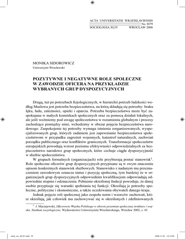 ACTA UNIVERSITATIS WRATISLAVIENSIS No 3079 SOCJOLOGIA XLIV WROCŁAW 2008 MONIKA SIDOROWICZ Uniwersytet Wrocławski POZYTYWNE I NEGATYWNE ROLE SPOŁECZNE W ZAWODZIE OFICERA NA PRZYKŁADZIE WYBRANYCH GRUP DYSPOZYCYJNYCH Drugą, tuż po potrzebach fizjologicznych, w hierarchii potrzeb ludzkości według Maslowa jest potrzeba bezpieczeństwa, na którą składają się potrzeby: braku lęku, ładu, zależności, opieki i oparcia. Potrzeba bezpieczeństwa może być zaspokajana w małych komórkach społecznych oraz za pomocą działań lokalnych, ale jeśli weźmiemy pod uwagę społeczeństwa w rozumieniu globalnym i procesy zachodzące pomiędzy nimi, wchodzimy w obszar pojęcia bezpieczeństwa narodowego. Zaspokojenie tej potrzeby wymaga istnienia zorganizowanych, wyspecjalizowanych grup, których zadaniem jest zapewnianie bezpieczeństwa społeczeństwom w przypadku zagrożeń wojennych, katastrof naturalnych, zachwiań porządku publicznego oraz konfliktów granicznych. Transformacje społeczeństw europejskich powodują wzrost poziomu efektywności odpowiedzialnych za bezpieczeństwo narodowe grup społecznych, które cechuje ciągła dyspozycyjność w służbie społeczeństwu. W grupach formalnych (organizacjach) role przybierają postać stanowisk1. Role społeczne oficerów grup dyspozycyjnych przypisane są w swym znaczeniu opisom konkretnych stanowisk służbowych. Stanowisko z nadanym mu przeznaczeniem zawodowym oznacza status i pozycję społeczną, tym bardziej że w organizacjach grup dyspozycyjnych odpowiednim kwalifikacjom odpowiadają odpowiednie stopnie i odznaczenia. Pełnienie określonej funkcji powoduje, że danej osobie przypisuje się warunki spełniania tej funkcji. Określają je potrzeby społeczne, polityczne i ekonomiczne, a także oczekiwania obywateli danego kraju. Jednak pojęcie roli społecznej jako zespołu norm i wzorców zachowań, które określają, jak człowiek ma zachowywać się w określonych i zdefiniowanych 1 J. Maciejewski, Oficerowie Wojska Polskiego w okresie przemian społecznej struktury i wojska. Studium socjologiczne, Wydawnictwo Uniwersytetu Wrocławskiego, Wrocław 2002, s. 43. druk_soc_XLIV.indd 95 2008-11-03 14:13:08 96 MONIKA SIDOROWICZ już sytuacjach, w przypadku ról oficerów grup dyspozycyjnych, może przejawiać się także nieformalnie, nie tylko w postaci formalnego stanowiska służbowego. Oznacza to, że rola społeczna oficera jest zależna od oczekiwań społecznych, a te są zależne od wielu czynników, w tym aktualnej gospodarczej i politycznej sytuacji kraju, świadomości publicznej, kondycji psychicznej społeczeństwa. Z tego powodu charakterystyka ról społecznych – pozytywnych i negatywnych – zostanie przedstawiona z perspektywy społecznej, głównie nieformalnej, opartej na oczekiwaniach obywateli. Pominięte zostaną teoretyczne koncepcje z punktu widzenia roli służbowej na rzecz elementów rozróżniających obie skrajne postawy w oczach społeczeństwa. Rola społeczna oficera będzie zatem postrzegana jako pozytywna w takim stopniu, w jakim oczekiwania wobec pełnienia tej funkcji zostały spełnione. Podobnie jest w przypadku ról negatywnych. Dla przykładu: jeżeli oficer policji, przestrzegając pilnowania prawa, ukarze obywatela, to w postrzeganiu obywatela może on pełnić rolę negatywną, gdyż jego oczekiwania nie pokrywały się z założoną rolą, mającą na celu utrzymanie porządku publicznego, czyli przyjętą rolą społeczną z racji pełnionej funkcji. Aby określić role, które odgrywają reprezentanci grup dyspozycyjnych, oraz przedstawić ich rozróżnienie, należy zacząć od spojrzenia przez przekrój znaczenia i uwarunkowania ról społecznych w ogóle. Pojęcie roli społecznej związane jest z pojęciem statusu społecznego, a ten jest sposobem usytuowania człowieka w zbiorowości; współcześnie człowiek należy do wielu zbiorowości, a w każdej z nich zajmuje inną pozycję2. Status społeczny oficerów grup dyspozycyjnych wiąże się zatem z ich miejscem w zbiorowości. Ponieważ mają oni bezpośredni wpływ na poziom zaspokojenia potrzeby poczucia bezpieczeństwa w społeczeństwie czy utrzymanie ładu społecznego, ich miejsce w zbiorowości jest dość szczególne. Wymaga bowiem od nich stałej gotowości do działania, często życia w warunkach zakoszarowania oraz podlegania rozkazom, i wreszcie – owej dyspozycyjności3. Ta specyfika pracy może być postrzegana przez obywateli w kategoriach roli pozytywnych i negatywnych, w zależności od potrzeb społecznych i stopnia ich zaspokojenia, a przede wszystkim od różnych okoliczności, które temu towarzyszą. Rola społeczna traktowana jest często jako zespół oczekiwań odnoszących się do zachowań osoby zajmującej daną pozycję w strukturze społecznej lub jako ogół praw i zakres obowiązków, wiążących się z daną pozycją społeczną lub stanowiskiem4. Osoba, która pełni daną funkcję społeczną, zobowiązana jest zachowywać się w określony sposób, wykonywać pewne konkretne czynności, a z tytułu tej funkcji ma pewne uprawnienia, które mogą innym nie przysługiwać. Równocześnie osoby pozostające w kontakcie z jednostką pełniącą daną 2 B. Szacka, Wprowadzenie do socjologii, Oficyna Naukowa, Warszawa 2003, s. 144. J. Maciejewski, Grupy dyspozycyjne społeczeństwa polskiego, Wydawnictwo Uniwersytetu Wrocławskiego, Wrocław 2006, s. 11. 4 J. Szczepański, Elementarne pojęcia socjologii, PWN, Warszawa 1970, s. 131. 3 druk_soc_XLIV.indd 96 2008-11-03 14:13:09 Pozytywne i negatywne role społeczne w zawodzie oficera 97 funkcję społeczną oczekują, że będzie się ona zachowywać zgodnie z określonym wzorcem postępowania. Taki wzorzec najczęściej zostawia jednostce większy lub mniejszy margines w zakresie dowolnego odgrywania roli. Przekroczenie granic dotyczących marginesu swobody w odgrywaniu przyjętej roli naraża jej wykonawcę na negatywne sankcje społecz