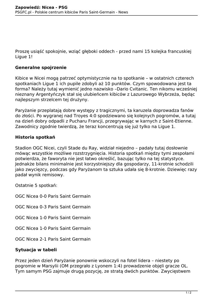 Zapowiedź: Nicea - PSG PSGFC.pl - Polskie centrum kibiców Paris Saint-Germain - News Proszę usiąść spokojnie, wziąć głęboki oddech - przed nami 15 kolejka francuskiej Ligue 1! Generalne spojrzenie Kibice w Nicei mogą patrzeć optymistycznie na to spotkanie – w ostatnich czterech spotkaniach Ligue 1 ich pupile zdobyli aż 10 punktów. Czym spowodowana jest ta forma? Należy tutaj wymienić jedno nazwisko –Dario Cvitanic. Ten nikomu wcześniej nieznany Argentyńczyk stał się ulubieńcem kibiców z Lazurowego Wybrzeża, będąc najlepszym strzelcem tej drużyny. Paryżanie przeplatają dobre występy z tragicznymi, ta karuzela doprowadza fanów do złości. Po wygranej nad Troyes 4:0 spodziewano się kolejnych pogromów, a tutaj na dzień dobry odpadli z Pucharu Francji, przegrywając w karnych z Saint-Etienne. Zawodnicy zgodnie twierdzą, że teraz koncentrują się już tylko na Ligue 1. Historia spotkań Stadion OGC Nicei, czyli Stade du Ray, widział niejedno – padały tutaj dosłownie mówąc wszystkie możliwe rozstrzygnięcia. Historia spotkań między tymi zespołami potwierdza, że faworyta nie jest łatwo określić, bazując tylko na tej statystyce. Jednakże bilans minimalnie jest korzystniejszy dla gospodarzy, 11-krotnie schodzili jako zwycięzcy, podczas gdy Paryżanom ta sztuka udała się 8-krotnie. Dziewięc razy padał wynik remisowy. Ostatnie 5 spotkań: OGC Nicea 0-0 Paris Saint Germain OGC Nicea 0-3 Paris Saint Germain OGC Nicea 1-0 Paris Saint Germain OGC Nicea 1-0 Paris Saint Germain OGC Nicea 2-1 Paris Saint Germain Sytuacja w tabeli Przez jeden dzień Paryżanie ponownie wskoczyli na fotel lidera – niestety po pogromie w Marsylii (OM przegrało z Lyonem 1:4) prowadzenie objęli gracze OL. Tym samym PSG zajmuje drugą pozycję, ze stratą dwóch punktów. Zwycięstwem 1/2 Zapowiedź: Nicea - PSG PSGFC.pl - Polskie centrum kibiców Paris Saint-Germain - News 4:0 podreperowali sobie także bilans bramkowy, który teraz dumnie brzmi +13 i jest to drugi, zaraz po Saint-Etienne (+14) wynik. Nicea okupuje 10 pozycję z 19 punktami na koncie. Jest to wynik przewidywany przed tym sezonem przez kibiców i gdyby w tym momencie kończył się sezon, byliby usatysfakcjonowani. Zajmują perfekcyjnie środkowe miejsce w tabeli z idealnie przeciętnym bilansem bramkowym (0). Ciekawostki Ze statystyk wynika, że gdy oba zespoły zdobywają pierwsze bramkę – nigdy nie schodzą z boiska jako przegrani. OGC Nicea trzykrotnie wygrywała i dwa razy remisowała, kiedy pierwsi otworzyli wynik, a Paryżanie ledwie raz remisowali, a trzykrotnie pokonali rywali. Nie biorąc pod uwagę bramkarzy, jedynie dwóch zawodników Paris Saint-Germain rozegrało więcej niz 1000 minut w tym sezonie (Matuidi, Maxwell). Zerkamy do rywali i tutaj, proszę, aż pięciu z nich przekroczyło granicę 1000 minut w tym sezonie. To pokazuje system rotacji u Carlo Ancelottiego. Królem ostatniego podania w PSG jest Nene, a więc zawodnik rezerwowy (4asysty). W Nicei jest to napastnik E.Bautheac, który może się pochwalić trzema takimi podania, jednak potrzebował na to aż dwukrotnie więcej czasu. Sędzia spotkania Sędzią sobotniego spotkania będzie 35-letni Francuz Ruddy Buquet. W tym sezonie w Ligue 1 prowadził osiem spotkań, rozdając 28 żółtych kartoników oraz jednego gracza wyrzucił z boiska. Rudy jest więc narwanym sędzią, nie bojącym się ukarać zawodników za ostre wejścia. Autor: kublu 2/2 Powered by TCPDF (www.tcpdf.org)