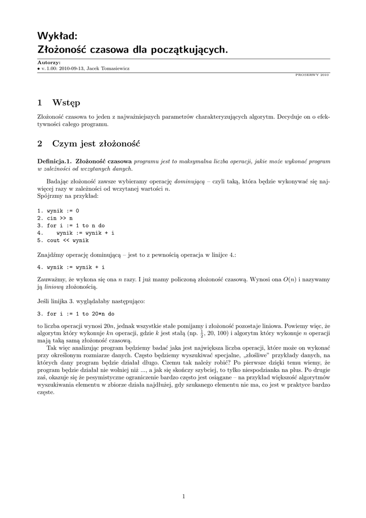 Wykład: Złożoność czasowa dla początkujących. Autorzy: • v. 1.00: 2010-09-13, Jacek Tomasiewicz PROSERWY 2010 1 Wstęp Złożoność czasowa to jeden z najważniejszych parametrów charakteryzujących algorytm. Decyduje on o efektywności całego programu. 2 Czym jest złożoność Definicja.1. Złożoność czasowa programu jest to maksymalna liczba operacji, jakie może wykonać program w zależności od wczytanych danych. Badając złożoność zawsze wybieramy operację dominującą – czyli taką, która będzie wykonywać się najwięcej razy w zależności od wczytanej wartości n. Spójrzmy na przykład: 1. 2. 3. 4. 5. wynik := 0 cin >> n for i := 1 to n do wynik := wynik + i cout << wynik Znajdźmy operację dominującą – jest to z pewnością operacja w linijce 4.: 4. wynik := wynik + i Zauważmy, że wykona się ona n razy. I już mamy policzoną złożoność czasową. Wynosi ona O(n) i nazywamy ją liniową złożonością. Jeśli linijka 3. wyglądałaby następująco: 3. for i := 1 to 20*n do to liczba operacji wynosi 20n, jednak wszystkie stałe pomijamy i złożoność pozostaje liniowa. Powiemy więc, że algorytm który wykonuje kn operacji, gdzie k jest stałą (np. 12 , 20, 100) i algorytm który wykonuje n operacji mają taką samą złożoność czasową. Tak więc analizując program będziemy badać jaka jest największa liczba operacji, które może on wykonać przy określonym rozmiarze danych. Często będziemy wyszukiwać specjalne, „złośliwe” przykłady danych, na których dany program będzie działał długo. Czemu tak należy robić? Po pierwsze dzięki temu wiemy, że program będzie działał nie wolniej niż ..., a jak się skończy szybciej, to tylko niespodzianka na plus. Po drugie zaś, okazuje się że pesymistyczne ograniczenie bardzo często jest osiągane – na przykład większość algorytmów wyszukiwania elementu w zbiorze działa najdłużej, gdy szukanego elementu nie ma, co jest w praktyce bardzo częste. 1 3 Przykłady różnych złożoności 3.1 Złożoność stała 1. cin >> n 2. cout << n * n Program wykona zawsze stałą liczbę operacji nie zależnie od wartości n. Złożoność jest więc stała i zapisujemy ją jako O(1). 3.2 1. 2. 3. 4. 5. 6. Złożoność logarytmiczna cin >> n wynik := 0 while (n > 1) do n := n / 2 wynik := wynik + 1; cout << wynik W linijce 4. wartość n jest w każdym obrocie pętli zmniejszane o połowę. Liczbę takich operacji oblicza się używając logarytmów. Jeśli n = 2x to log(n) = x. Łatwo więc zauważyć, że złożoność tego rozwiązania wynosić będzie O(log(n)), a nazywać będziemy ją złożonością logarytmiczną. 3.3 Złożoność liniowa 1. cin >> n 2. for i := 1 to n do 3. cin >> x 4. if x = 0 then 5. break Zauważmy, że jeśli pierwszą wczytaną liczbą x byłoby 0 to progam od razu by się zakończył, my jednak szukamy złośliwych przypadków – będzie to taki, w którym x równy 0 nigdy nie występuje. Złożoność jest więc liniowa, czyli O(n). 3.4 Złożoność liniowo-logarytmiczna 1. cin >> n 2. for i := 1 to n do 3. cin >> p 4. while (p < n) 5. p := p * 2 6. cout << p // p z przedziału od 1 do n Znów znajdźmy „złośliwy” przypadek. Będzie on wtedy, gdy p = 1. Wówczas w każdym obrocie pętli z linijki 2. instrukcja w linijce 5. wykonywać się będzie log(n) razy. Stąd cała złożoność wynosi O(n ∗ log(n)) i nazywamy ją liniowo-logarytmiczną. 3.5 1. 2. 3. 4. 5. 6. 7. Złożoność kwadratowa suma_i := suma_j := 0 cin >> n for i := 1 to n do for j := i to n do suma_i := suma_i + i suma_j := suma_j + j cout << suma_i + suma_j Zauważmy, że operacja w linijce 5. będzie wykonywana nie rzadziej niż operacja w każdej innej linijce. Policzmy liczbę wykonań tej operacji. Pętla w linijce 4. będzie się wykonywała n, n − 1, n − 2, ... 1 razy. Po zsumowaniu liczba operacji wynosić = 21 ∗ (n2 + n) ¬ n2 , więc złożoność wynosi O(n2 ) i nazywamy ją kwadratową. będzie n∗(n+1) 2 2 3.6 1. 2. 3. 4. 5. 6. 7. Złożoność wykładnicza cin >> n p := 1 for i := 1 to n p := p * 2 for i := 1 to p wynik := wynik + i cout << wynik Ile operacji wykona powyższy kod. Pętla w linijce 3. obróci się n razy jednak pętla w linijce 6. obróci się p = 2n razy. Wybieramy operację dominującą, więc złożoność wynosić będzie O(2n ), która nazywana jest złożonością wykładniczą. Złożonościami wykładniczymi są również O(3n ), O(10n ), a także O(n!). 3.7 Wiele zmiennych Nie zawsze złożoność musi zależeć od jednej zmiennej: 1. 2. 3. 4. 5. 6. cin >> n cin >> m for i := 1 cout << for j := 1 cout << to n do i to m do j Zauważmy, że czas działania programu zależy od obu wartości n i m, w związku z tym złożoność wynosi O(n + m). Mówimy, że złożoność jest liniowa względem n i m. Spójrzmy na inny przykład: 1. 2. 3. 4. 5. 6. 7. 8. cin >> n cin >> m if n > m then for i := 1 cout << else for j := 1 cout << to n do i to m do j Złożoność zależy od wartości większej z liczb n i m. Wynosi więc ona O(max(n, m)). I jeszcze jeden: 1. 2. 3. 4. 5. 6. 7. cin >> n cin >> m wynik := 0 for i := 1 to n do for j := 1 to m do wynik := wynik + i * j cout << wynik Złożoność zależy od obu wartości n i m. W każym z n obrotów pętli w linii 3. wykonuje się pętla z linii 4. obracająca m razy. Stąd złożonośc wynosi O(n ∗ m). 3 4 Czy program ma wystraczającą złożoność Podczas pisania programu, zawsze warto zastanowić się czy istnieje rozwiązanie o lepszej złożoności czasowej. Chyba, że limity wyraźnie wskazują, że wymyślone rozwiązanie, choć może nieoptymalne zostanie w pełni zaakceptowane. Porównajmy 3 programy obliczające dokładnie to samo: 4.1 Program A 1. cin >> n 2. for i := 1 to n do 3. for j := 1 to i do 4. wynik := wynik + 1 5. cout << wynik Złożoność: O(n2 ) 4.2 Program B 1. cin >> n 2. for i := 1 to n do 3. wynik := wynik + i 4. cout << wynik Złożoność: O(n)