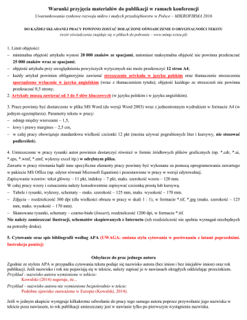 Warunki przyjęcia materiałów do publikacji w ramach konferencji Uwarunkowania rynkowe rozwoju mikro i małych przedsiębiorstw w Polsce – MIKROFIRMA 2016 DO KAŻDEJ SKŁADANEJ PRACY POWINNO ZOSTAĆ DOŁĄCZONE OŚWIADCZENIE O ORYGINALNOŚCI TEKSTU (wzór oświadczenia znajduje się w plikach do pobrania – www.mimp.wzieu.pl) 1. Limit objętości: minimalna objętość artykułu wynosi 20 000 znaków ze spacjami, natomiast maksymalna objętość nie powinna przekraczać 25 000 znaków wraz ze spacjami; objętość artykułu przy uwzględnieniu powyższych wytycznych nie może przekroczyć 12 stron A4; każdy artykuł powinien obligatoryjnie zawierać streszczenie artykułu w języku polskim oraz tłumaczenie streszczenia sporządzone wyłącznie w języku angielskim (wraz z tłumaczeniem tytułu); objętość każdego ze streszczeń nie powinna przekraczać 0,5 strony; 2. Artykuły muszą zawierać od 3 do 5 słów kluczowych (w języku polskim i w języku angielskim). 3. Prace powinny być dostarczone w pliku MS Word (do wersji Word 2003) wraz z jednostronnym wydrukiem w formacie A4 (w jednym egzemplarzu). Parametry tekstu w pracy: odstęp między wierszami – 1,5, lewy i prawy margines – 2,5 cm, w całej pracy obowiązuje standardowa wielkość czcionki 12 pkt (można używać pogrubionych liter i kursywy, nie stosować podkreśleń). 4. Umieszczone w pracy rysunki autor powinien dostarczyć również w formie źródłowych plików graficznych (np. *.cdr, *.ai, *.eps, *.wmf, *.emf, wykresy excel itp.) w odrębnym pliku. Zawarte w pracy równania bądź inne specyficzne elementy pracy powinny być wykonane za pomocą oprogramowania zawartego w pakiecie MS Office (np. edytor równań Microsoft Eqaution) i pozostawione w pracy w wersji edytowalnej. Zapisywanie wzorów: tekst główny – 11 pkt, indeksy – 7 pkt, maks. szerokość wzoru – 120 mm. W całej pracy wzory i oznaczenia należy konsekwentnie zapisywać czcionką prostą lub kursywą. Tabele i rysunki, wykresy, schematy – maks. szerokość – 125 mm, maks. wysokość – 170 mm. Zdjęcia – rozdzielczość 300 dpi (dla wielkości obrazu w pracy w skali 1 : 1), w formacie *.tif, *.jpg (maks. szerokość – 125 mm, maks. wysokość – 170 mm). Skanowane rysunki, schematy – czarno-białe (lineart), rozdzielczość 1200 dpi, w formacie *.tif. Nie należy zamieszczać ilustracji, schematów skopiowanych z Internetu (ich rozdzielczość nie spełnia wymagań niezbędnych na potrzeby druku). 5. Cytowanie oraz spis bibliografii według APA (UWAGA: zmiana stylu cytowania w porównaniu z latami poprzednimi. Instrukcja poniżej) Odsyłacze do prac jednego autora Zgodnie ze stylem APA w przypadku cytowania tekstu podaje się nazwisko autora (bez imion i bez inicjałów imion) oraz rok publikacji. Jeśli nazwisko i rok nie pojawiają się w tekście, należy zapisać je w nawiasach okrągłych oddzielając przecinkiem. Przykład - nazwisko autora wymienione w tekście: Kowalski (2014) sugeruje, że... Przykład – nazwisko autora nie wymienione bezpośrednio w teście: Podobne zjawisko zauważono w Europie (Kowalski, 2014). Jeśli w jednym akapicie występuje kilkakrotne odwołanie do pracy tego samego autora poprzez przywołanie jego nazwiska w tekście poza nawiasem, to rok publikacji umieszczany jest w nawiasie tylko po pierwszym wystąpieniu nazwiska. Przykład – kilkakrotne przywoływanie pracy tego samego autora w jednym akapicie: Kowalski (2000) udowodnił, że.... Kowalski zaproponował także... Odsyłacze do prac wielu autorów Jeśli praca ma dwóch autorów, za każdym razem należy podawać oba nazwiska w odsyłaczu bibliograficznym w tekście. Przykład: Jak sugerują Kowalski i Nowak (2010)... Badania sugerują, iż ... (Kowalski i Nowak, 2010). Jeśli praca ma trzech, czterech lub pięciu autorów, należy podać nazwiska wszystkich autorów za pierwszym razem w odsyłaczu w tekście, a w kolejnych odsyłaczach tylko nazwisko pierwszego autora wraz ze skrótem i in. (w treści można zastosować również określenie „i współpracownicy”) oraz rokiem. Przykład: 1. Przywołanie po raz pierwszy: Jak sugerują Nowak, Kowalski, Lewandowska i Wiśniewski (2012) ... Lub: Badania (Nowak, Kowalski, Lewandowska i Wiśniewski, 2012) wskazują, iż ... 2. Kolejne przywołania: Badania Nowaka i współpracowników (2012) wskazują, iż ... Lub: Badania te (Nowak i in., 2012) ... Jeśli praca ma sześciu lub więcej autorów, należy podać nazwisko tylko pierwszego autora, dodając skrót i in. oraz rok (za każdym razem zarówno dla pierwszego, jak i następnych odsyłaczy). Cytowania (w tym cytowania pracy kilku autorów, jak również autorów korporatywnych – instytucji/organizacji) przedstawia tabela 1. Tabela 1. Zapis odsyłaczy do cytowanych prac Liczba i typ autorów pracy Praca jednego autora Praca dwóch autorów Praca trzech autorów Praca czterech autorów Praca pięciu autorów Praca sześciu lub więcej autorów Autor korporatywny (w formie powszechnie znanego skrótowca) Autor korporatywny (w formie pełnej nazwy własnej) Pierwszy odsyłacz w tekście Nowak (2014) Kolejne odsyłacze w tekście Nowak (2014) Pierwszy odsyłacz w tekście w nawiasie Nowak (2014) Nowak i Kowalski (2005) Nowak, Kowalski, Iksińska (2010) Nowakowski, Kowalski, Kamińska, Lewandowska, (2009) Nowacki, Kowalski, Kamińska, Lewandowska, Wiśniewski (2009) Nowak i in. (2007) Nowak i Kowalski (2005) Nowak i in. (2010) i (Nowacki, Kowalski, Kamińska, Lewandowska, Wiśniewski, 2009) Nowak i in. (2007) (Nowak i in., 2007) (Nowacki i in., 2009) Narodowy Bank Polski (NBP, 2014) NBP (2014) (Narodowy Bank Polski [NBP], 2014) (NBP, 2014) Uniwersytet Szczeciński (2012) Uniwersytet Szczeciński (2012) Uniwersytet Szczeciński (2012) Uniwersytet Szczeciński (2012) Nowakowski i in. (2009) Nowak i Kowalski (2005) (Nowak, Kowalski, Iksińska, 2010) (Nowakowski, Kowalski, Kamińska, Lewandowska, 2009) Kolejne odsyłacze w tekście w 