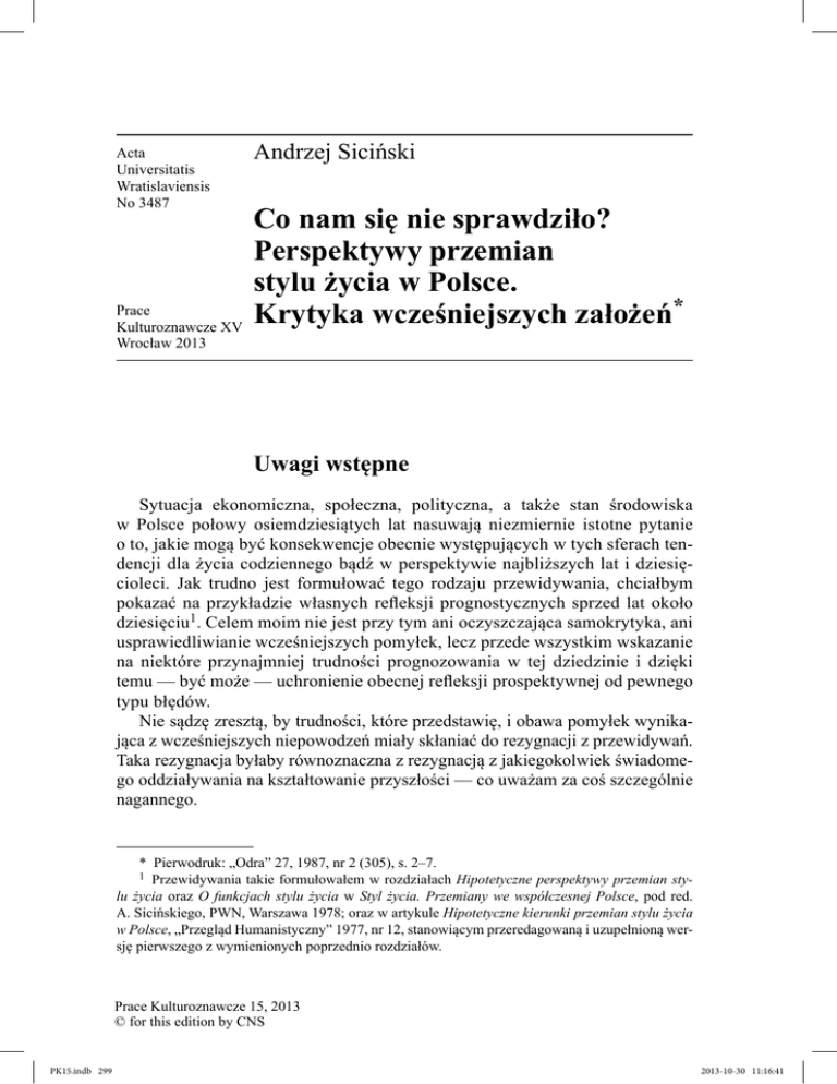 Acta Universitatis Wratislaviensis No 3487 Prace Kulturoznawcze XV Wrocław 2013 Andrzej Siciński Co nam się nie sprawdziło? Perspektywy przemian stylu życia w Polsce. Krytyka wcześniejszych założeń* Uwagi wstępne Sytuacja ekonomiczna, społeczna, polityczna, a także stan środowiska w Polsce połowy osiemdziesiątych lat nasuwają niezmiernie istotne pytanie o to, jakie mogą być konsekwencje obecnie występujących w tych sferach tendencji dla życia codziennego bądź w perspektywie najbliższych lat i dziesięcioleci. Jak trudno jest formułować tego rodzaju przewidywania, chciałbym pokazać na przykładzie własnych refleksji prognostycznych sprzed lat około dziesięciu1. Celem moim nie jest przy tym ani oczyszczająca samokrytyka, ani usprawiedliwianie wcześniejszych pomyłek, lecz przede wszystkim wskazanie na niektóre przynajmniej trudności prognozowania w tej dziedzinie i dzięki temu — być może — uchronienie obecnej refleksji prospektywnej od pewnego typu błędów. Nie sądzę zresztą, by trudności, które przedstawię, i obawa pomyłek wynikająca z wcześniejszych niepowodzeń miały skłaniać do rezygnacji z przewidywań. Taka rezygnacja byłaby równoznaczna z rezygnacją z jakiegokolwiek świadomego oddziaływania na kształtowanie przyszłości — co uważam za coś szczególnie nagannego. * Pierwodruk: „Odra” 27, 1987, nr 2 (305), s. 2–7. 1 Przewidywania takie formułowałem w rozdziałach Hipotetyczne perspektywy przemian stylu życia oraz O funkcjach stylu życia w Styl życia. Przemiany we współczesnej Polsce, pod red. A. Sicińskiego, PWN, Warszawa 1978; oraz w artykule Hipotetyczne kierunki przemian stylu życia w Polsce, „Przegląd Humanistyczny” 1977, nr 12, stanowiącym przeredagowaną i uzupełnioną wersję pierwszego z wymienionych poprzednio rozdziałów. Prace Kulturoznawcze 15, 2013 © for this edition by CNS PK15.indb 299 2013-10-30 11:16:41 300 Andrzej Siciński Trudności przewidywań przemian stylów i sposobów Trudności prognozowania w interesującej nas dziedzinie wynikają z dwóch co najmniej przyczyn: — niedostatecznej znajomości „praw” rządzących przekształceniami stylów życia; — trudności prognozowania przemian czynników warunkujących sposoby i style życia. Style życia jako pewne struktury codziennej aktywności ludzi ulegają zresztą stosunkowo powolnym przemianom, nawet jeśli — pod wpływem różnych okoliczności — zmieniają się poszczególne rodzaje zachowań w życiu codziennym. Jak zwracaliśmy kiedyś uwagę, style życia pełnią pewne doniosłe funkcje społeczne: trwałość owych funkcji powoduje względną trwałość stylów życia2, toteż błędy w naszych przewidywaniach i trudności prognozowania dotyczą w mniejszym stopniu stylów życia, w większym zaś niektórych przejawów sposobu życia jednostek i rodzin3. Prognozowanie tych ostatnich związane jest z przewidywaniem zmian czynników warunkujących codzienną aktywność ludzi — takich jak: — uwarunkowania przestrzenne (w szczególności: stopień urbanizacji, środowisko przyrodnicze); — uwarunkowania ekonomiczne (w szczególności poziom życia); — uwarunkowania techniczne i technologiczne; — uwarunkowania demograficzne i społeczne (struktura społeczna); — uwarunkowania aksjologiczne. Znów wskazać trzeba na brak teorii, która by pozwoliła na przewidywania zróżnicowanych reakcji ludzi na zmiany tych czynników — w różnych społeczeństwach i kulturach. I tak na przykład interpretując interesującą obserwację (Władysława Adamskiego), iż Amerykanie w okresie Wielkiego Kryzysu i Polacy na 2 Wyróżniliśmy wtedy trzy takie funkcje: „Funkcja I: jest on [tj. — styl życia — przyp. A.S.] oznaką, świadectwem przynależności do danej grupy, a przez to stwarza poczucie więzi z innymi i zapewnia jednostkom możliwości samoidentyfikacji społecznej, przyczynia się dzięki temu do ich poczucia bezpieczeństwa itd. Funkcja II: wyodrębnia daną grupę z szerszej zbiorowości (obejmującej inne grupy), przyczynia się do trwałości owej grupy, jej ciągłości — mimo wymienialności (w miarę upływu czasu) poszczególnych jednostek na nią składających się. Funkcja III: przyczynia się do poczucia sensowności własnych zachowań w życiu codziennym; zapewnia możliwości ekspresji osobowości jednostek w sposób społecznie akceptowany” (O funkcjach stylu życia, s. 387). Zwracaliśmy też uwagę na fakt, iż „szybko wzrasta w Polsce i — jak można przewidywać — jeszcze szybciej będzie wzrastało znaczenie funkcji III”. Przewidywanie to wydaje się trafne, choć przesłanki, na których je oparliśmy, były fałszywe. Za najważniejszą w Polsce uznaliśmy jednak funkcję I (m.in. w związku z przemianami struktury społecznej), co też, jak sądzimy, było trafnym spostrzeżeniem. 3 O rozróżnieniu „styl” i „sposób” życia: Wprowadzenie do Styl życia. Przemiany…, s. 8–13. Prace Kulturoznawcze 15, 2013 © for this edition by CNS PK15.indb 300 2013-10-30 11:16:41 Co nam się nie sprawdziło? 301 początku lat osiemdziesiątych w sposób całkiem odmienny zareagowali na załamanie dotychczasowego poziomu życia, można by — post factum — wskazywać na rozmaite przyczyny tej odmienności (odmienny system wartości naczelnych; odmienność genezy obu kryzysów itp.), które spowodowały, iż społeczeństwo amerykańskie szybko zmodyfikowało swe zachowania w kierunku zmierzającym do dostosowania swego życia codziennego do sytuacji kryzysowej i natychmiast podjęło próby przełamania kryzysu. Natomiast Polacy podjęli uporczywą obronę dotychczasowego poziomu i sposobu życia. Nie mamy jednak teorii choćby średniego zasięgu, która by umożliwiła przewidywanie takich różnic. Stwierdzić zresztą wypada, iż nawet gdybyśmy znali lepiej zależności pomiędzy wymienionymi rodzajami czynników warunkującymi sposób życia, to isto