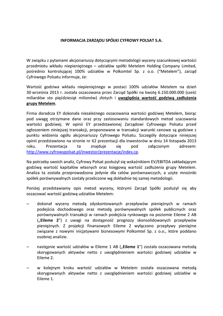 INFORMACJA ZARZĄDU SPÓŁKI CYFROWY POLSAT S.A. W związku z pytaniami akcjonariuszy dotyczącymi metodologii wyceny szacunkowej wartości przedmiotu wkładu niepieniężnego – udziałów spółki Metelem Holding Company Limited, pośrednio kontrolującej 100% udziałów w Polkomtel Sp. z o.o. (“Metelem”), zarząd Cyfrowego Polsatu informuje, że: Wartość godziwa wkładu niepieniężnego w postaci 100% udziałów Metelem na dzień 30 września 2013 r. została oszacowana przez Zarząd Spółki na kwotę 6.150.000.000 (sześć miliardów sto pięćdziesiąt milionów) złotych i uwzględnia wartość godziwą zadłużenia grupy Metelem. Firma doradcza EY dokonała niezależnego oszacowania wartości godziwej Metelem, biorąc pod uwagę ̨ otrzymane dane oraz przy zastosowaniu standardowych metod szacowania wartości godziwej. W opinii EY przedstawionej Zarządowi Cyfrowego Polsatu przed ogłoszeniem niniejszej transakcji, proponowane w transakcji warunki cenowe są godziwe z punktu widzenia ogółu akcjonariuszy Cyfrowego Polsatu. Szczegóły dotyczące niniejszej opinii przedstawiono na stronie nr 62 prezentacji dla inwestorów w dniu 14 listopada 2013 roku. Prezentacja ta znajduje się pod załączonym adresem: http://www.cyfrowypolsat.pl/inwestor/prezentacje/index.cp. Na potrzeby swoich analiz, Cyfrowy Polsat posłużył się wskaźnikiem EV/EBITDA zakładającym godziwą wartość kapitałów własnych oraz księgową wartość zadłużenia grupy Metelem. Analiza ta została przeprowadzona jedynie dla celów porównawczych, a użyte mnożniki spółek porównywalnych zostały przeliczone wg dokładnie tej samej metodologii. Poniżej przedstawiamy opis metod wyceny, którymi Zarząd Spółki posłużył się aby oszacować wartość godziwą udziałów Metelem: – dokonał wyceny metodą zdyskontowanych przepływów pieniężnych w ramach podejścia dochodowego oraz metodą porównywalnych spółek publicznych oraz porównywalnych transakcji w ramach podejścia rynkowego na poziomie Eileme 2 AB („Eileme 2”) z uwagi na dostępność prognozy skonsolidowanych przepływów pieniężnych. Z projekcji finansowych Eileme 2 wyłączono przepływy pieniężne związane z nowymi inicjatywami biznesowymi Polkomtel Sp. z o.o., które poddano osobnej analizie. – następnie wartość udziałów w Eileme 1 AB („Eileme 1”) została oszacowana metodą skorygowanych aktywów netto z uwzględnieniem wartości godziwej udziałów w Eileme 2. – w kolejnym kroku wartość udziałów w Metelem została oszacowana metodą skorygowanych aktywów netto z uwzględnieniem wartości godziwej udziałów w Eileme 1. Poniżej przedstawiono opis metody zdyskontowanych przepływów pieniężnych w ramach podejścia dochodowego, metody porównywalnych spółek publicznych oraz porównywalnych transakcji w ramach podejścia rynkowego oraz metody skorygowanych aktywów netto w ramach podejścia majątkowego wykorzystanych na potrzeby wyceny. Podejście dochodowe: Metoda zdyskontowanych przepływów pieniężnych (DCF) W ramach podejścia dochodowego wartość przedmiotu wyceny została ustalona na podstawie oczekiwanych, przyszłych korzyści ekonomicznych wynikających z posiadania przedmiotu wyceny. Korzyści te wyrażone są jako strumień dochodów dla akcjonariuszy (ang. free cash flow to equity - FCFE) lub wszystkich dawców kapitału (ang. free cash flow to firm - FCFF). Wycena kapitałów własnych Metelem została oparta na wolnych przepływach pieniężnych dla wszystkich dawców kapitału (FCFF). Podstawą zastosowania metody dochodowej było zatem przypisanie przedmiotowi wyceny określonego strumienia dochodów. Metoda zdyskontowanych przepływów pieniężnych zakłada, że wartość kapitałów własnych wycenianego podmiotu na dzień sporządzenia wyceny jest równa bieżącej wartości przyszłych przepływów pieniężnych i stanowi sumę: – zdyskontowanych na datę wyceny wolnych strumieni pieniężnych dla wszystkich dawców kapitału w okresie projekcji; – zdyskontowanej na datę wyceny wartości rezydualnej przedsiębiorstwa po okresie projekcji; – która następnie jest korygowana o wartość godziwą zadłużenia odsetkowego netto oraz wartość aktywów nieoperacyjnych. Podejście rynkowe: Metoda porównywalnych spółek notowanych oraz porównywalnych transakcji W ramach podejścia rynkowego wartość przedmiotu wyceny została ustalana w oparciu o mnożniki wartości rynkowej porównywalnych spółek publicznych lub transakcji kupna/sprzedaży akcji/udziałów przedsiębiorstw podobnych do przedmiotu wyceny dokonanych w okresie zbliżonym do daty wyceny. Mnożniki wartości spółek porównywalnych określono na podstawie kapitalizacji giełdowej, bądź też ceny uzyskanej w wyniku ostatnich transakcji sprzedaży danej spółki oraz jej wybranych danych finansowych. Kluczowym czynnikiem warunkującym jakość kalkulacji było istnienie odpowiednich spółek porównywalnych oraz dostępność mnożników. Podstawowym kryterium doboru spółek i transakcji porównywalnych było podobieństwo profilu działalności, charakterystyki rynku, na którym działa oraz charakterystyki świadczonych usług. Podejście majątkowe: Metoda skorygowanych aktywów netto W ramach podejścia majątkowego wartość przedmiotu wyceny została ustalona na podstawie wartości aktywów netto, z uwzględnieniem korekt w obszarach, gdzie występują istotne różnice pomiędzy wartością księgową a wartością ekonomiczną lub likwidacyjną aktywów i pasywów, w tym pośrednio z uwzględnieniem korekty zadłużenia grupy Metelem do wartości godziwej.