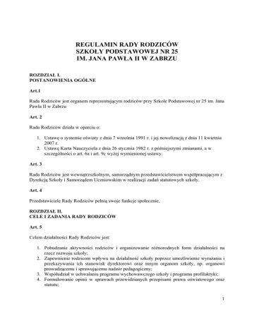 REGULAMIN RADY RODZICÓW SZKOŁY PODSTAWOWEJ NR 25 IM. JANA PAWŁA II W ZABRZU ROZDZIAŁ I. POSTANOWIENIA OGÓLNE Art.1 Rada Rodziców jest organem reprezentującym rodziców przy Szkole Podstawowej nr 25 im. Jana Pawła II w Zabrzu Art. 2 Rada Rodziców działa w oparciu o: 1. Ustawę o systemie oświaty z dnia 7 września 1991 r. i jej nowelizacją z dnia 11 kwietnia 2007 r. 2. Ustawę Karta Nauczyciela z dnia 26 stycznia 1982 r. z późniejszymi zmianami, a w szczególności o art. 6a i art. 9c wyżej wymienionej ustawy. Art. 3 Rada Rodziców jest wewnątrzszkolnym, samorządnym przedstawicielstwem współpracującym z Dyrekcją Szkoły i Samorządem Uczniowskim w realizacji zadań statutowych szkoły. Art. 4 Przedstawiciele Rady Rodziców pełnią swoje funkcje społecznie. ROZDZIAŁ II. CELE I ZADANIA RADY RODZICÓW Art. 5 Celem działalności Rady Rodziców jest: 1. Pobudzanie aktywności rodziców i organizowanie różnorodnych form działalności na rzecz rozwoju szkoły; 2. Zapewnienie rodzicom wpływu na działalność szkoły poprzez umożliwienie wyrażania i przekazywania ich stanowisk dyrektorowi oraz innym organom szkoły, np. organowi prowadzącemu i sprawującemu nadzór pedagogiczny; 3. Współudział w uchwalaniu programu wychowawczego szkoły i programu profilaktyki; 4. Formułowanie opinii w sprawach przewidzianych przepisami prawa oświatowego oraz statutu; 1 5. Finansowe i organizacyjne wspieranie działalności statutowej szkoły; 6. Organizowanie współpracy z dyrektorem, radę pedagogiczną i samorządem uczniowskim w realizacji procesu nauczania, wychowania i opieki oraz wynikających z nich zadań dla szkoły i rodziców. Art. 6 Ponadto do zadań Rady Rodziców należy: 1. Opiniowanie szkolnego zestawu programów nauczania, programu wychowawczego szkoły oraz szkolnego zestawu podręczników; 2. Prezentowanie wobec dyrektora i Rady Pedagogicznej opinii rodziców we wszystkich istotnych sprawach dotyczących działalności szkoły; 3. Wnioskowanie do dyrektora i innych organów szkoły oraz organów prowadzących szkołę i sprawujących nadzór pedagogiczny we wszystkich sprawach szkoły; 4. Opiniowanie projektu planu finansowego składanego przez dyrektora szkoły; 5. Podejmowanie uchwały w sprawie programu wychowawczego i programu profilaktyki szkoły; 6. Udzielanie pomocy i wsparcia samorządowi uczniowskiemu; 7. Opiniowanie oceny dorobku zawodowego za okres stażu nauczyciela stażysty, kontraktowego i mianowanego; 8. Opiniowanie decyzji o podjęciu działalności w szkole przez stowarzyszenia lub inne organizacje; 9. Podejmowanie, wspólnie z dyrekcja szkoły decyzji w sprawie jednolitego stroju na terenie szkoły; 10. Określanie, w porozumieniu z dyrekcją sytuacji, w których przebywanie ucznia na terenie szkoły nie wymaga noszenia jednolitego stroju; 11. Określenie zasad i zakresu współpracy z innymi radami rodziców; 12. Uchwalenie regulaminu swojej działalności zgodnego ze statutem szkoły; 13. Wyrażanie swoich decyzji w formie uchwał zgodnych z regulaminem rady i statutem szkoły; 14. Odwoływanie się w sprawach spornych z innymi organami szkoły do organu sprawującego nadzór pedagogiczny, celem uzyskania właściwej wykładni i oceny prawnej. ROZDZIAŁ III. STRUKTURA I ZASADY WYBORU RADY RODZICÓW ORAZ JEJ ORGANÓW WEWNĘTRZNYCH Art. 7 1. Prawo wyborcze posiadają wszyscy rodzice i prawni opiekunowie uczniów szkoły. 2. W wyborach jednego ucznia reprezentuje jeden rodzic (prawny opiekun). 2 Art. 8 Podstawowe ogniwo stanowi Rada Klasowa Rodziców, w skład której wchodzą trzy osoby wybrane przez ogólne zebranie rodziców danej klasy. Art. 9 1. Rada Rodziców Szkoły składa się z przedstawicieli Rad Klasowych, w osobie jednego przedstawiciela każdej klasy, wybranych w tajnych wyborach przez zebranie Rad Klasowych Rodziców. 2. Wybory przeprowadza się na pierwszym zebraniu plenarnym rodziców w każdym roku szkolnym. Art. 10 1. Najwyższym organem Rady Rodziców jest zebranie plenarne Rady Rodziców Szkoły zwoływane przez przewodniczącego, co najmniej 2 razy w trakcie roku szkolnego (nie licząc zebrania wyborczego). 2. Plenarne zebranie Rady Rodziców może być zwołane także przez przewodniczącego w każdym czasie na wniosek: ¾ klasowych rad rodziców z najmniej 3 klas, ¾ Dyrektora szkoły, ¾ Rady Pedagogicznej Art. 11 1. Zebranie plenarne Rady podejmuje wszystkie uchwały zwykłą większością głosów przy obecności, co najmniej połowy regulaminowego składu Rady. 2. Listę uczestników posiedzenia Rady oraz kworum ustala każdorazowo sekretarz lub przewodniczący Rady. 3. Uchwały są protokołowane w protokolarzu Rady Rodziców. Za protokolarz Rady Rodziców i jego prawidłowe prowadzenie odpowiada sekretarz prezydium Rady Rodziców. Art. 12 Na pierwszym posiedzeniu Rady Rodziców zebranie plenarne: 1. Wybiera spośród siebie w głosowaniu tajnym lub jawnym Prezydium Rady Rodziców Szkoły, jako wewnętrzny organ kierujący pracami Rady Rodziców w składzie: ¾ przewodniczący, ¾ zastępca, ¾ sekretarz, ¾ skarbnik 2. Wybiera trzyosobową Komisję rewizyjną jako organ kontrolny Rady Rodziców. 3 3. Zatwierdza Regulamin Rady Rodziców. Art. 13 Prezydium Rady Rodziców kieruje całokształtem prac w okresie pomiędzy zebraniami plenarnymi podejmując uchwały w ramach swoich uprawnień określonych w regulaminie Rady Rodziców i ustawach nadrzędnych.. Art. 14 Zebranie plenarne Rady Rodziców może w trakcie trwania kadencji odwoływać Prezydium Rady Rodziców i Komisję Rewizyjną oraz poszczególnych ich członków, na wniosek co najmniej ¼ członków Rady, jeśli nie wywiązują się oni ze swoich obowiązków. Art. 15 Zadaniem przewodniczącego Rady Rodziców Szkoły jest: 1. Bieżąca współpraca z Dyrekcją szkoły przy realizacji celów i zadań Rady Rodziców. 2. Zwoływanie i prowadzenie zebrań plenarnych Rady Rodziców oraz zwoływanie i prowadzenie zebrań prezydium Rady Rodziców. 3. Dokonywa