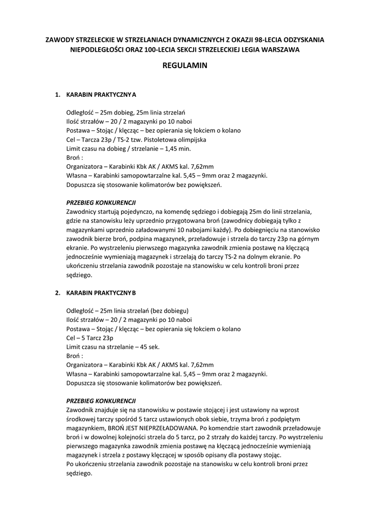 ZAWODY STRZELECKIE W STRZELANIACH DYNAMICZNYCH Z OKAZJI 98-LECIA ODZYSKANIA NIEPODLEGŁOŚCI ORAZ 100-LECIA SEKCJI STRZELECKIEJ LEGIA WARSZAWA REGULAMIN 1. KARABIN PRAKTYCZNY A Odległość – 25m dobieg, 25m linia strzelań Ilość strzałów – 20 / 2 magazynki po 10 naboi Postawa – Stojąc / klęcząc – bez opierania się łokciem o kolano Cel – Tarcza 23p / TS-2 tzw. Pistoletowa olimpijska Limit czasu na dobieg / strzelanie – 1,45 min. Broń : Organizatora – Karabinki Kbk AK / AKMS kal. 7,62mm Własna – Karabinki samopowtarzalne kal. 5,45 – 9mm oraz 2 magazynki. Dopuszcza się stosowanie kolimatorów bez powiększeń. PRZEBIEG KONKURENCJI Zawodnicy startują pojedynczo, na komendę sędziego i dobiegają 25m do linii strzelania, gdzie na stanowisku leży uprzednio przygotowana broń (zawodnicy dobiegają tylko z magazynkami uprzednio załadowanymi 10 nabojami każdy). Po dobiegnięciu na stanowisko zawodnik bierze broń, podpina magazynek, przeładowuje i strzela do tarczy 23p na górnym ekranie. Po wystrzeleniu pierwszego magazynka zawodnik zmienia postawę na klęczącą jednocześnie wymieniają magazynek i strzelają do tarczy TS-2 na dolnym ekranie. Po ukończeniu strzelania zawodnik pozostaje na stanowisku w celu kontroli broni przez sędziego. 2. KARABIN PRAKTYCZNY B Odległość – 25m linia strzelań (bez dobiegu) Ilość strzałów – 20 / 2 magazynki po 10 naboi Postawa – Stojąc / klęcząc – bez opierania się łokciem o kolano Cel – 5 Tarcz 23p Limit czasu na strzelanie – 45 sek. Broń : Organizatora – Karabinki Kbk AK / AKMS kal. 7,62mm Własna – Karabinki samopowtarzalne kal. 5,45 – 9mm oraz 2 magazynki. Dopuszcza się stosowanie kolimatorów bez powiększeń. PRZEBIEG KONKURENCJI Zawodnik znajduje się na stanowisku w postawie stojącej i jest ustawiony na wprost środkowej tarczy spośród 5 tarcz ustawionych obok siebie, trzyma broń z podpiętym magazynkiem, BROŃ JEST NIEPRZEŁADOWANA. Po komendzie start zawodnik przeładowuje broń i w dowolnej kolejności strzela do 5 tarcz, po 2 strzały do każdej tarczy. Po wystrzeleniu pierwszego magazynka zawodnik zmienia postawę na klęczącą jednocześnie wymieniają magazynek i strzela z postawy klęczącej w sposób opisany dla postawy stojąc. Po ukończeniu strzelania zawodnik pozostaje na stanowisku w celu kontroli broni przez sędziego. 3. PISTOLET PRAKTYCZNY A Odległość – 15m dobieg, 10m linia strzelań Ilość strzałów – 16 / 2 magazynki po 8 naboi Postawa – Stojąc / klęcząc – bez opierania się łokciem o kolano Cel – Tarcza 23p / TS-2 tzw. Pistoletowa olimpijska Limit czasu na dobieg / strzelanie – 1,30 min. Broń : Pistolety kal. 9mm wyposażone w przyrządy celownicze mechaniczne (muszka, szczerbinka) oraz 2 magazynki. Organizator zapewnia pistolety GLOCK 17. PRZEBIEG KONKURENCJI Zawodnicy startują pojedynczo na komendę sędziego i dobiegają 15m do pionowej przesłony na linii strzelania gdzie na stanowisku leży uprzednio przygotowana broń (zawodnicy dobiegają tylko z magazynkami uprzednio załadowanymi 8 nabojami każdy). Po dobiegnięciu na stanowisko zawodnik bierze broń, podpina magazynek, przeładowuje i strzela do tarczy 23p na górnym ekranie. Po wystrzeleniu pierwszego magazynka zawodnik zmienia postawę na klęczącą jednocześnie wymieniają magazynek, następnie wychyla się z za przesłony i strzela do tarczy TS-2 na dolnym ekranie. Po ukończeniu strzelania zawodnik pozostaje na stanowisku w celu kontroli broni przez sędziego. 4. PISTOLET PRAKTYCZNY B Odległość – 15m linia strzelań (bez dobiegu) Ilość strzałów – 16 / 2 magazynki po 8 naboi Postawa – Stojąc / klęcząc – bez opierania się łokciem o kolano Cel – 4 tarcze 23p Limit czasu na strzelanie – 45 sek. Broń : Pistolety kal. 9mm wyposażone w przyrządy celownicze mechaniczne (muszka, szczerbinka) oraz 2 magazynki. Organizator zapewnia pistolety GLOCK 17. PRZEBIEG KONKURENCJI Zawodnik znajduje się na stanowisku w postawie stojącej i jest ustawiony na środku (między tarczą 2 i 3) spośród 4 tarcz ustawionych obok siebie, trzyma broń z podpiętym magazynkiem, BROŃ JEST NIEPRZEŁADOWANA. Po komendzie start zawodnik przeładowuje broń i w dowolnej kolejności strzela do 4 tarcz, po 2 strzały do każdej tarczy. Po wystrzeleniu pierwszego magazynka zawodnik zmienia postawę na klęczącą jednocześnie wymieniają magazynek i strzela z postawy klęczącej w sposób opisany dla postawy stojąc. Po ukończeniu strzelania zawodnik pozostaje na stanowisku w celu kontroli broni przez sędziego. 5. STRZELANIE DO RZUTKÓW – TRAP Ilość strzałów – 2 próbne + 15 ocenianych Postawa – Stojąc Broń : Strzelby gładkolufowe typu Bock kal. 12/70,76. Organizator zapewnia strzelby FN, Beretta. PRZEBIEG KONKURENCJI Zawodnik znajduje się na stanowisku. Ładowanie broni odbywa się każdorazowo na komendę sędziego. Do oddania każdego strzału zawodnik wydaję komendę. 6. STRZELBA PRAKTYCZNA Odległość – ok. 15m dobieg, po drodze przeszkoda Ilość strzałów – 10 Postawa – Stojąc Cel – 10 poperów ustawionych na różnych dystansach w odległości do koło 15m od linii strzelań Limit czasu na dobieg / strzelanie – 60 sek. Broń : Strzelby gładkolufowe typu Shotgun kal. 12/70,76 wyposażone w mechaniczne przyrządy celownicze. Organizator zapewnia strzelby Imperator/Mossberg. PRZEBIEG KONKURENCJI Zawodnicy startują pojedynczo na komendę sędziego (dobiegają pokonując po drodze przeszkodę) do linii strzelania gdzie na stanowisku leży broń (2 strzelby) uprzednio załadowana 5 nabojami każda. Po dobiegnięciu zawodnik bierze broń i ostrzeliwuje cele w dowolnej kolejności. Po ukończeniu strzelania zawodnik pozostaje na stanowisku w celu kontroli broni przez sędziego. UWAGA: Ładowanie amunicji do broni przed strzelaniem odbywa się na linii strzelania w obecności sędziego! KLASYFIKACJA I OCENA KONKURENCJI W konkurencjach Karabin Pr