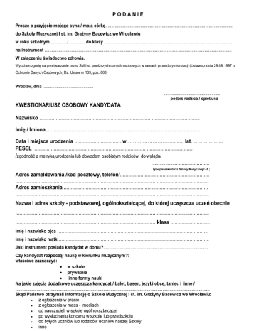 PODANIE Proszę o przyjęcie mojego syna / moją córkę............................................................................................................. do Szkoły Muzycznej I st. im. Grażyny Bacewicz we Wrocławiu w roku szkolnym ............../.............. do klasy ............................................................................................................. na instrument ............................................................................................................................................................... W załączeniu świadectwo zdrowia. Wyrażam zgodę na przetwarzanie przez SM I st. poniższych danych osobowych w ramach procedury rekrutacji (Ustawa z dnia 29.08.1997 o Ochronie Danych Osobowych, Dz. Ustaw nr 133, poz. 883) Wrocław, dnia ............................................... .................................................... podpis rodzica / opiekuna KWESTIONARIUSZ OSOBOWY KANDYDATA Nazwisko ..................................................................................................................... Imię / Imiona.................................................................................................................. Data i miejsce urodzenia ...................................w……………………............, lat……………….. PESEL .................................................................................................................... /zgodność z metryką urodzenia lub dowodem osobistym rodziców, do wglądu/ ............................................ (podpis sekretarza Szkoły Muzycznej I st. ) Adres zameldowania /kod pocztowy, telefon/................................................................. ............................................................................................................................................. Adres zamieszkania ......................................................................................................... ............................................................................................................................................. Nazwa i adres szkoły - podstawowej, ogólnokształcącej, do której uczęszcza uczeń obecnie ............................................................................................................................................. ...................................................................................................... klasa ............................. imię i nazwisko ojca ……………………………………………………………………………………………... imię i nazwisko matki…………………………………………………………………………………………….. Jaki instrument posiada kandydat w domu?......................................................................................... Czy kandydat rozpoczął naukę w kierunku muzycznym?: właściwe zaznaczyć: w szkole prywatnie inne formy nauki Na jakie zajęcia dodatkowe uczęszcza kandydat / balet, basen, języki obce, taniec i inne / ..................................................................................................................................................................... Skąd Państwo otrzymali informację o Szkole Muzycznej I st. im. Grażyny Bacewicz we Wrocławiu: z ogłoszenia w prasie z ogłoszenia w mass - mediach od nauczycieli w szkole ogólnokształcącej po wysłuchaniu koncertu w szkole lub przedszkolu od byłych uczniów lub rodziców uczniów naszej Szkoły inne